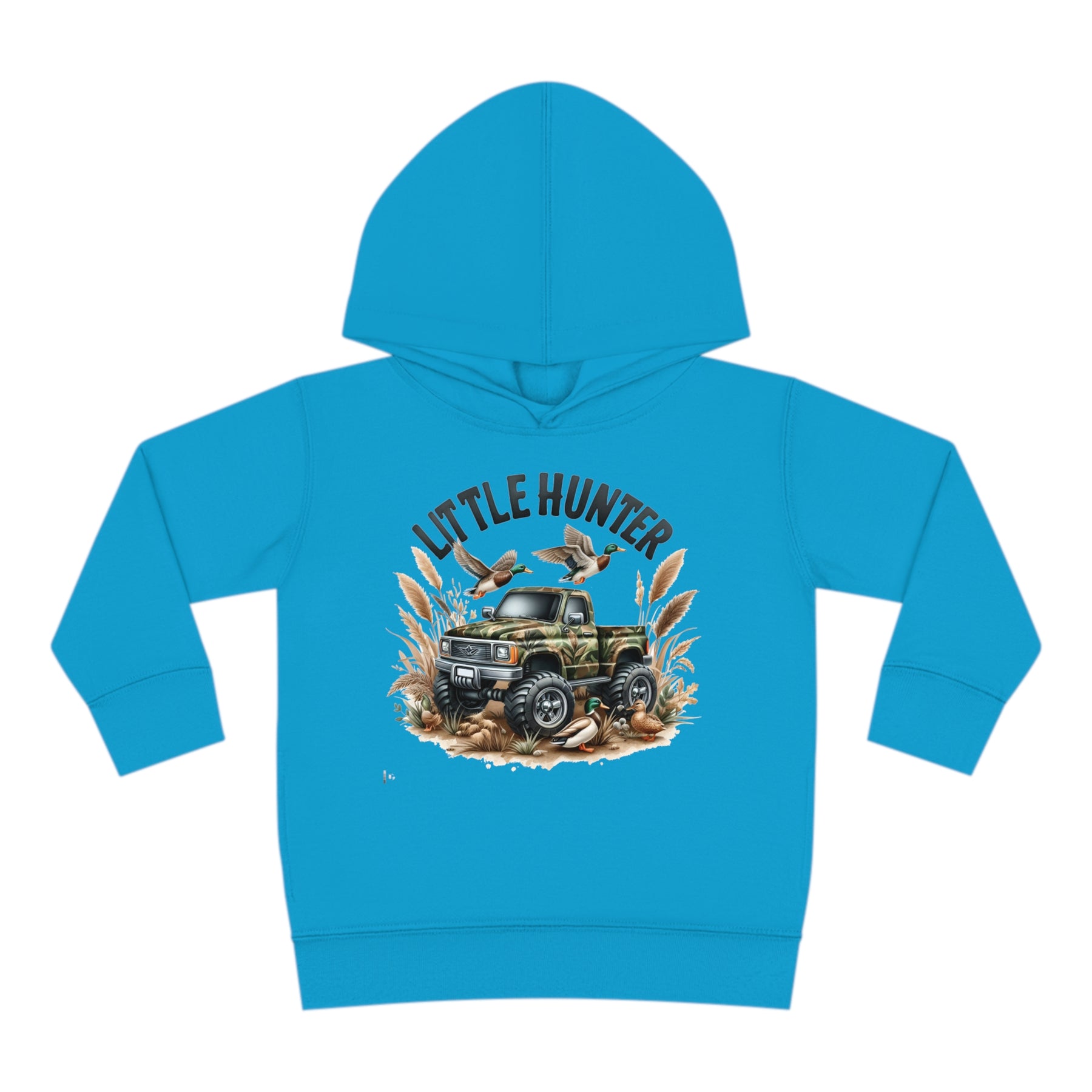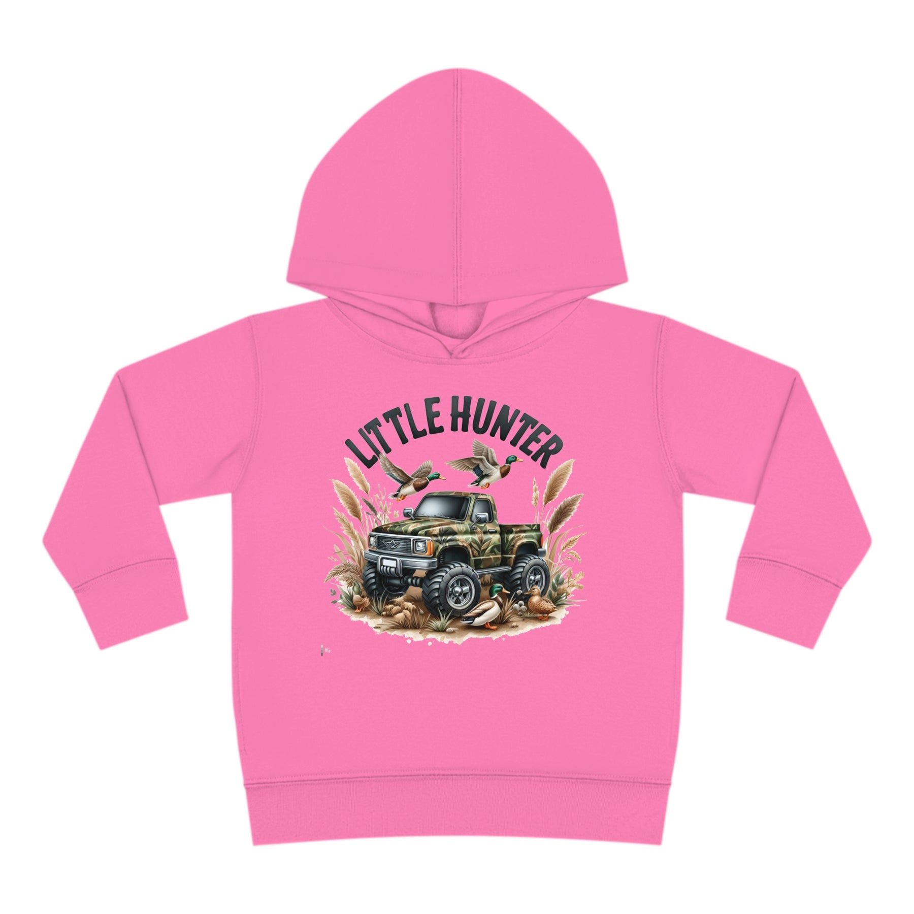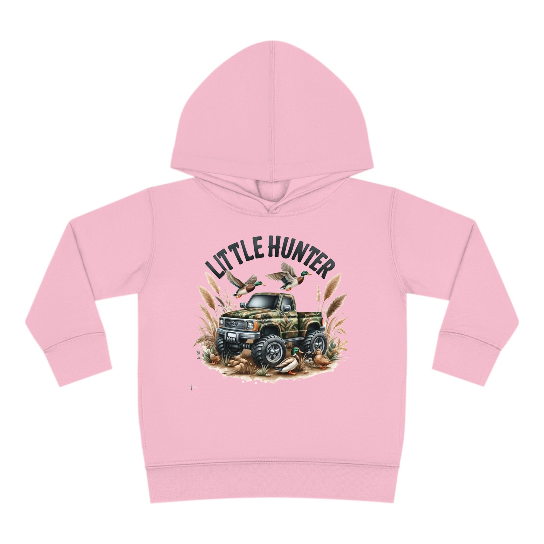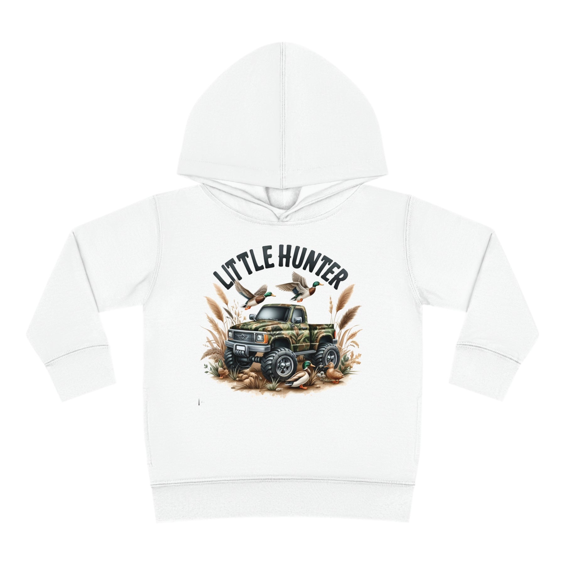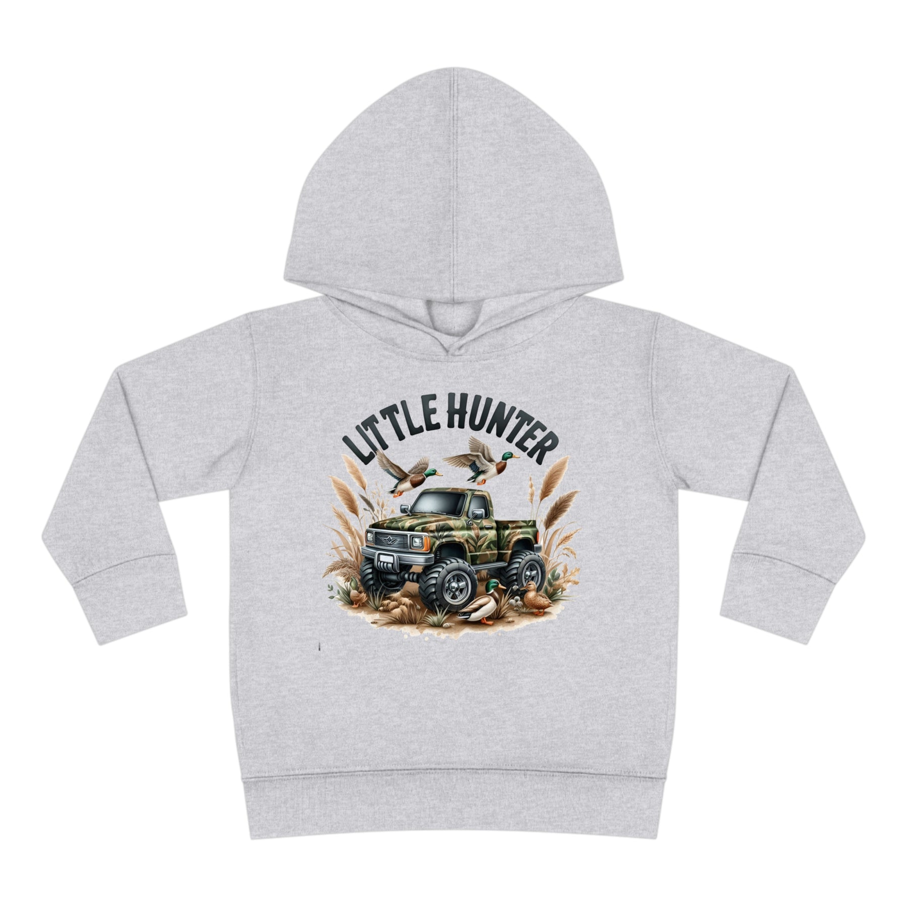 Little Hunter Toddler Hoodie featuring ducks on a truck, a flying duck, and a green-headed duck by a tire. Designed for comfort with jersey-lined hood, cover-stitched details, and side seam pockets.