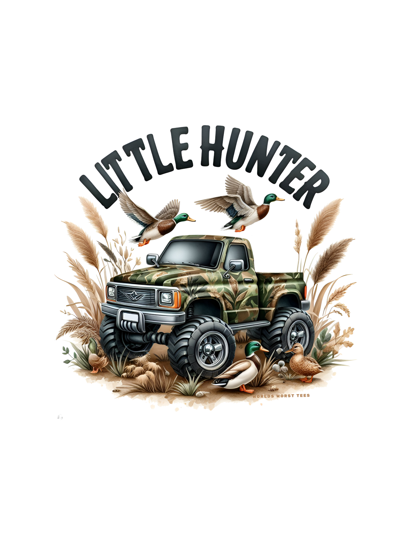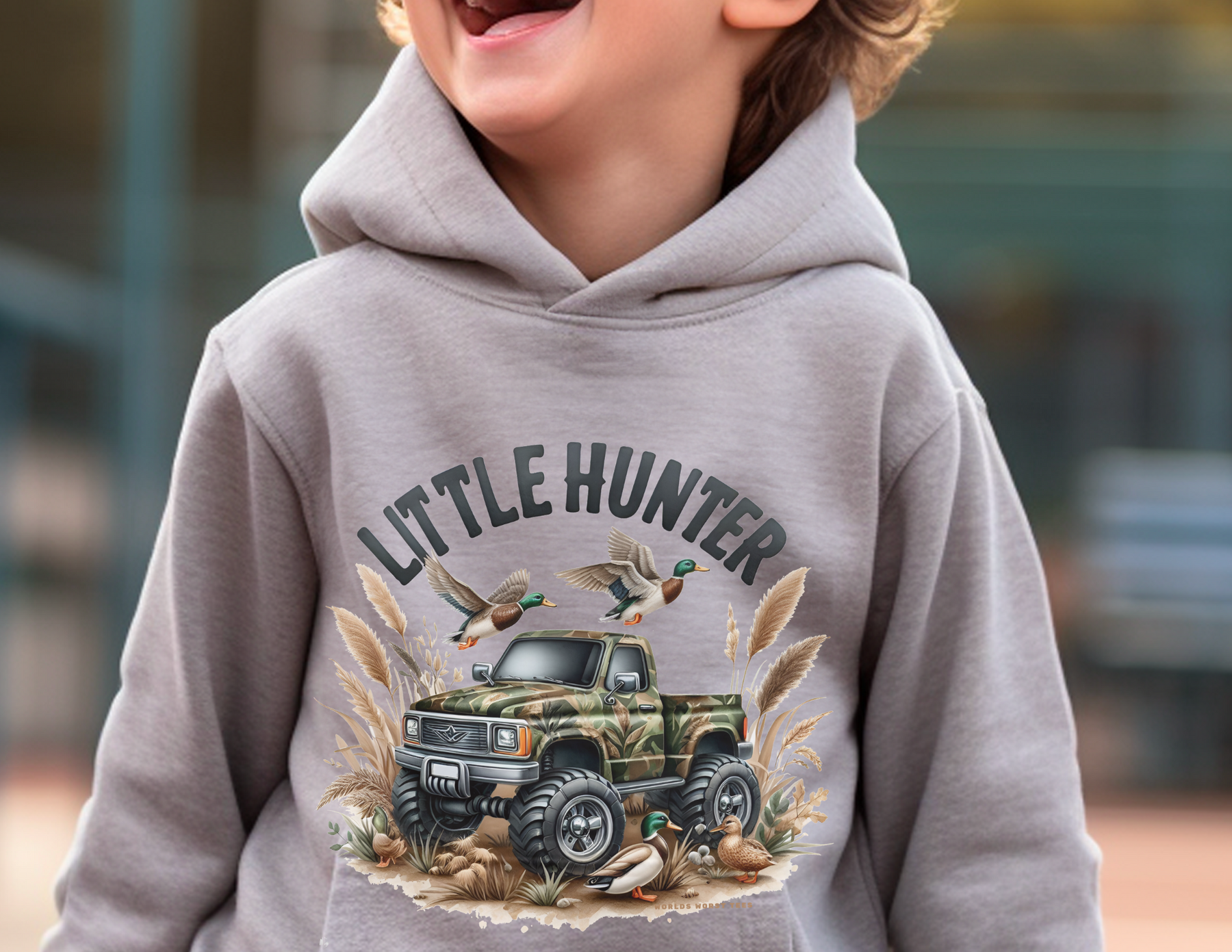 Little Hunter Toddler Hoodie featuring a child in a grey sweatshirt with a truck and ducks, designed for comfort with jersey-lined hood, cover-stitched details, and side seam pockets. From Worlds Worst Tees.