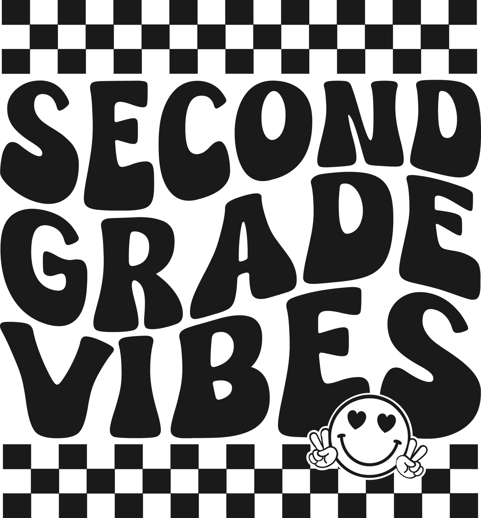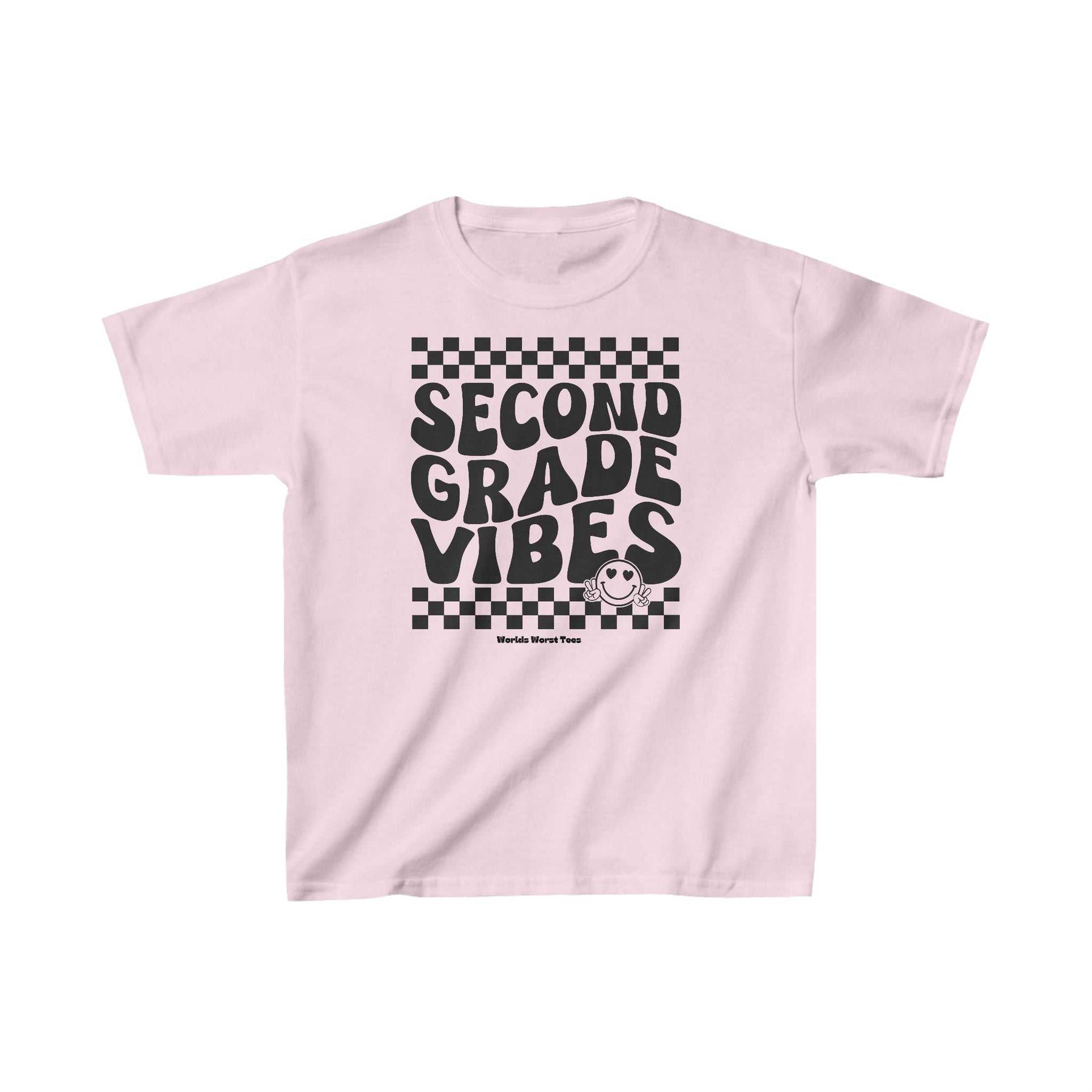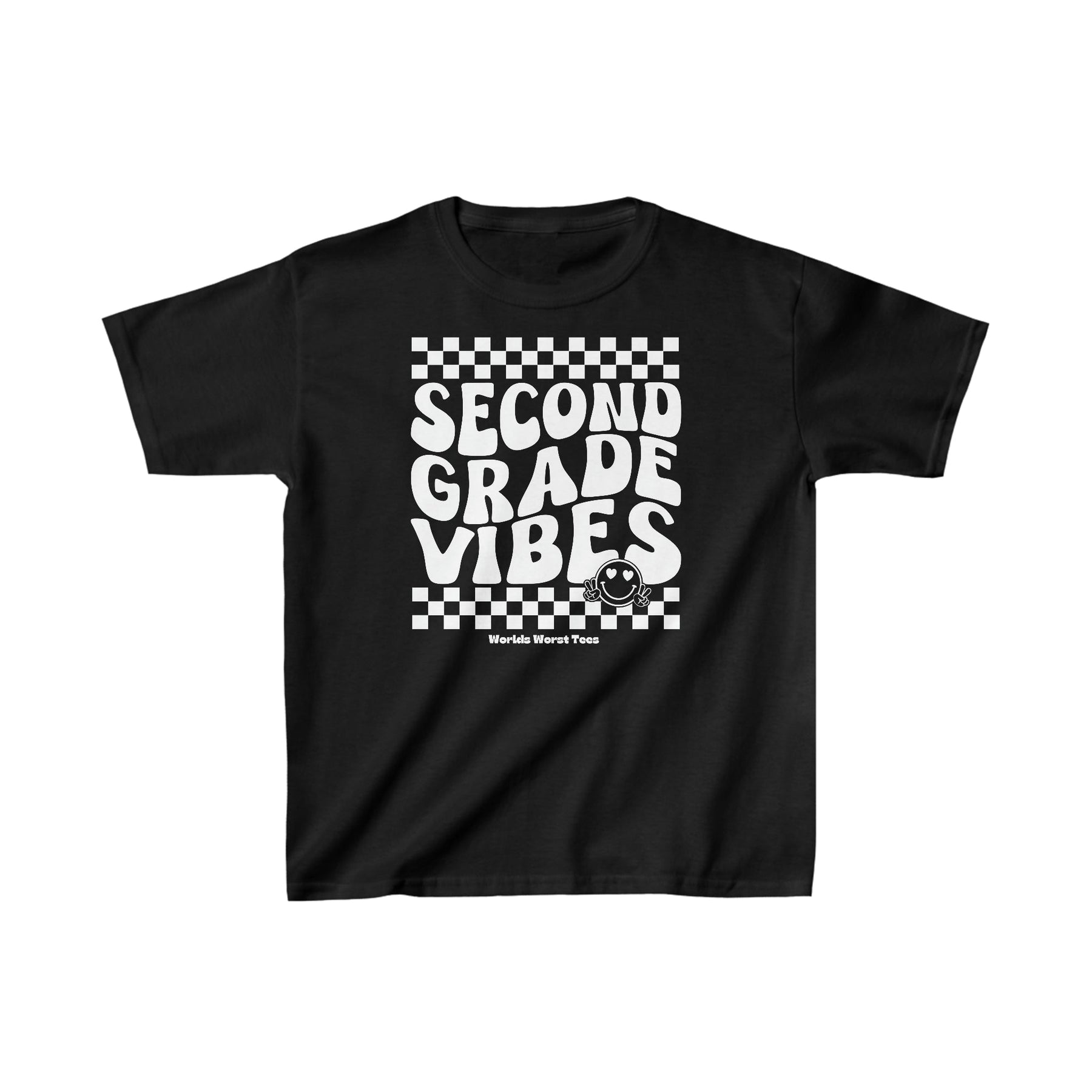 Black and white kids tee with text and graphics, ideal for daily wear. Made of 100% cotton for solid colors, featuring twill tape shoulders and tear-away label. 2nd Grade Vibes Kids Tee by Worlds Worst Tees.