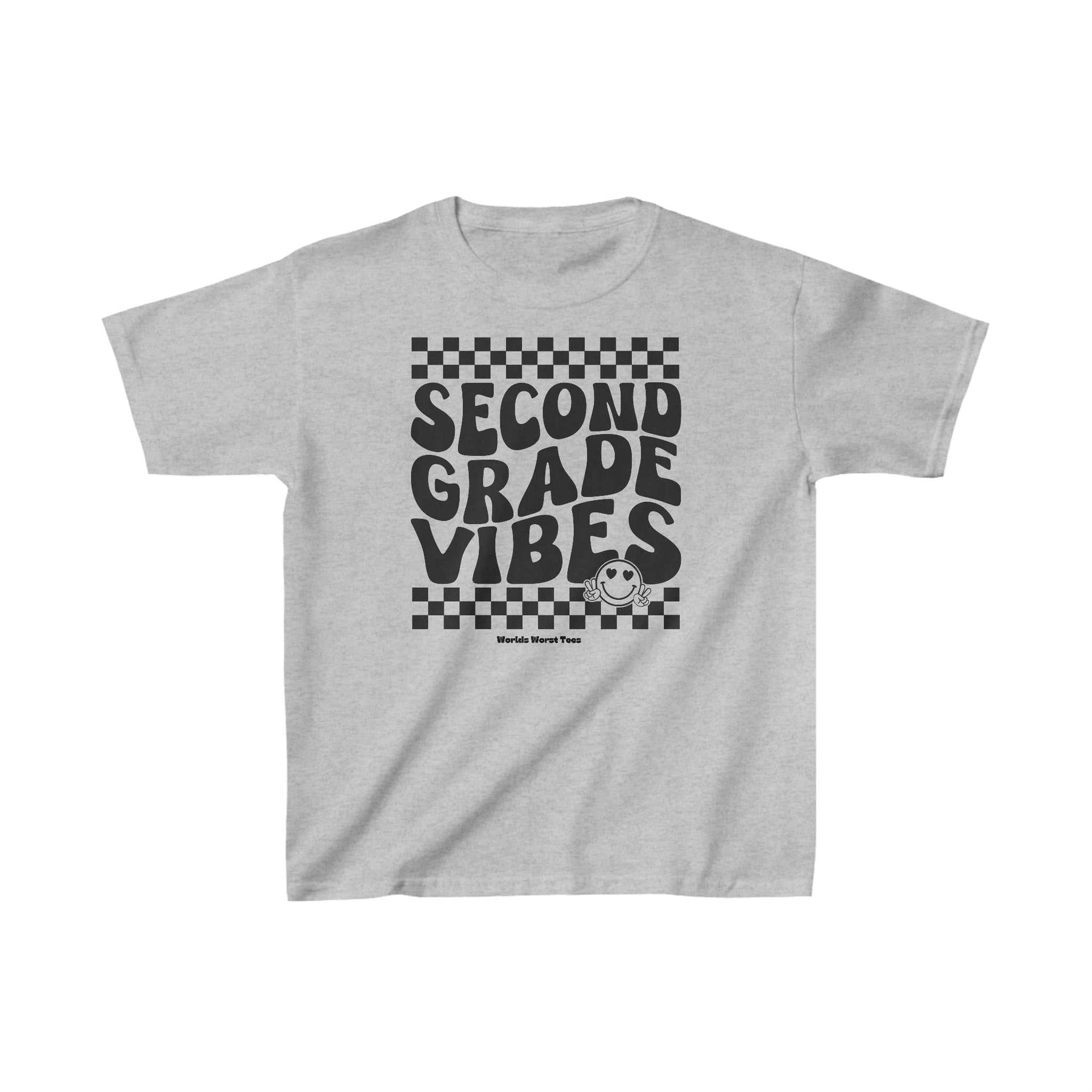 Kids 2nd Grade Vibes Tee, grey shirt with black text. 100% cotton, light fabric, classic fit, tear-away label. Ideal for everyday wear. No side seams, twill tape shoulders, ribbed collar.