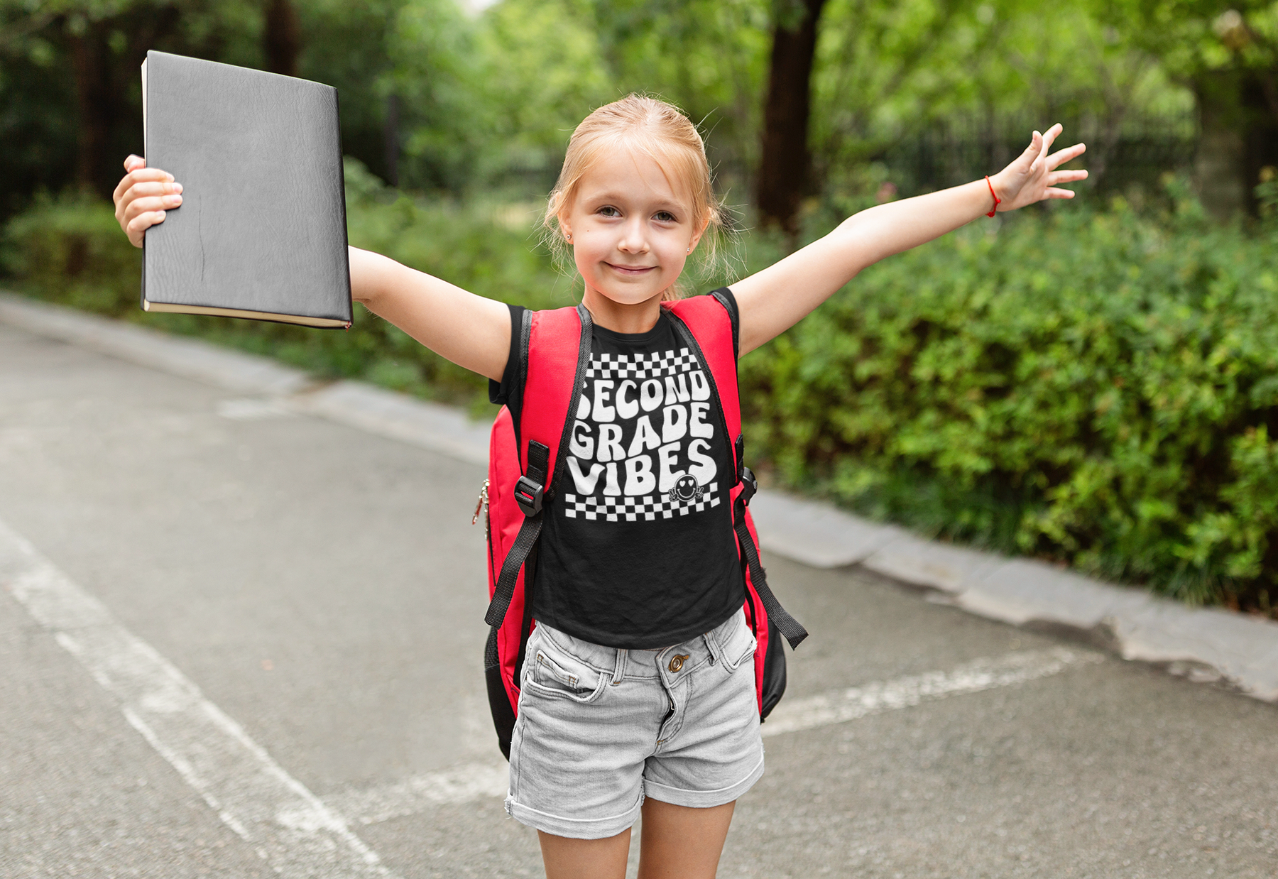 A girl with arms outstretched holds a book, embodying 2nd Grade Vibes Kids Tee. 100% cotton, light fabric, classic fit, tear-away label. Perfect for everyday wear.