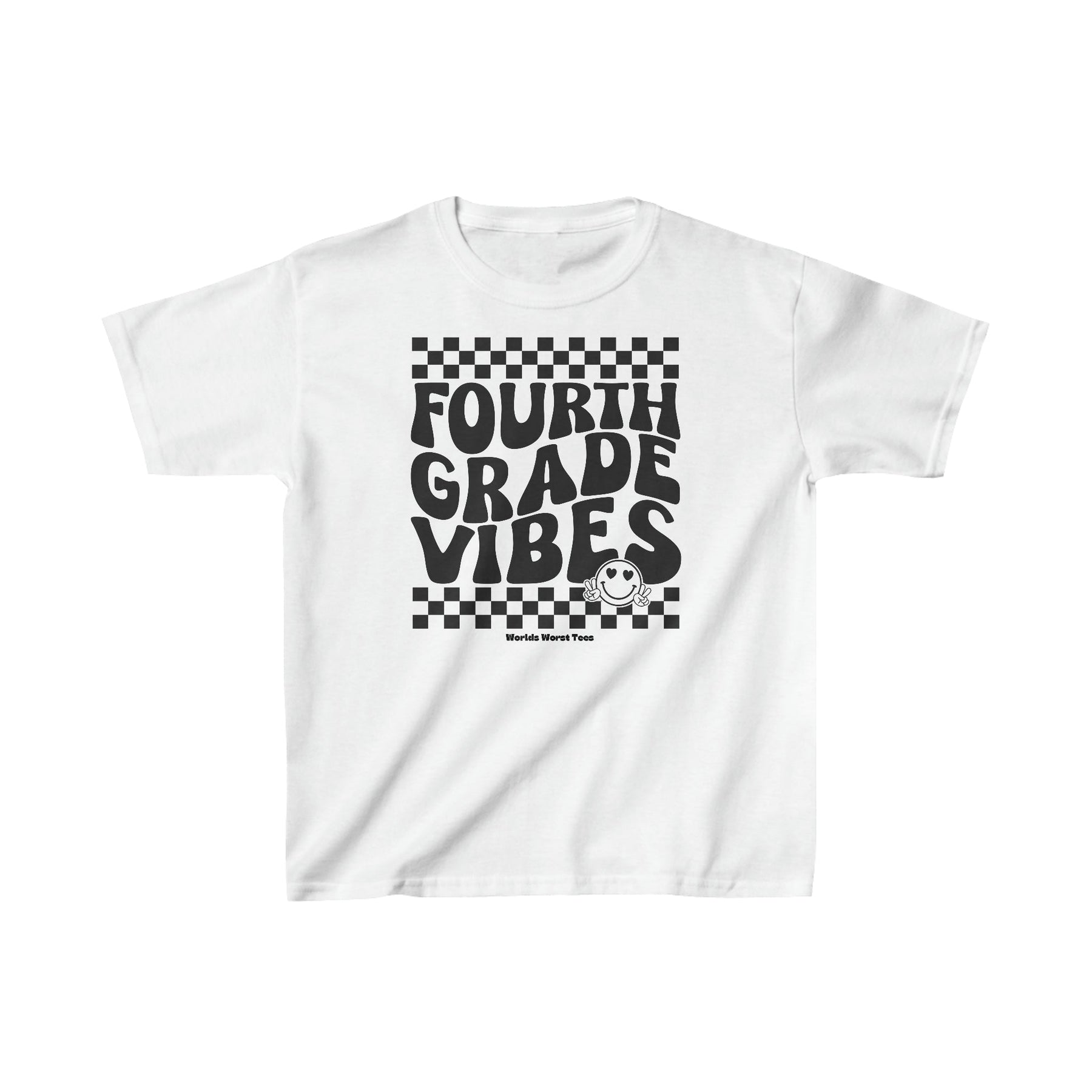 A kids' heavy cotton tee featuring 4th Grade Vibes text. 100% cotton fabric, twill tape shoulders, ribbed collar for durability. Classic fit, tear-away label, runs true to size.