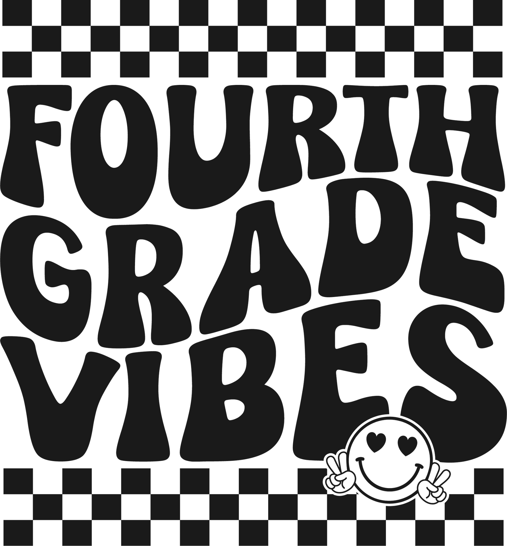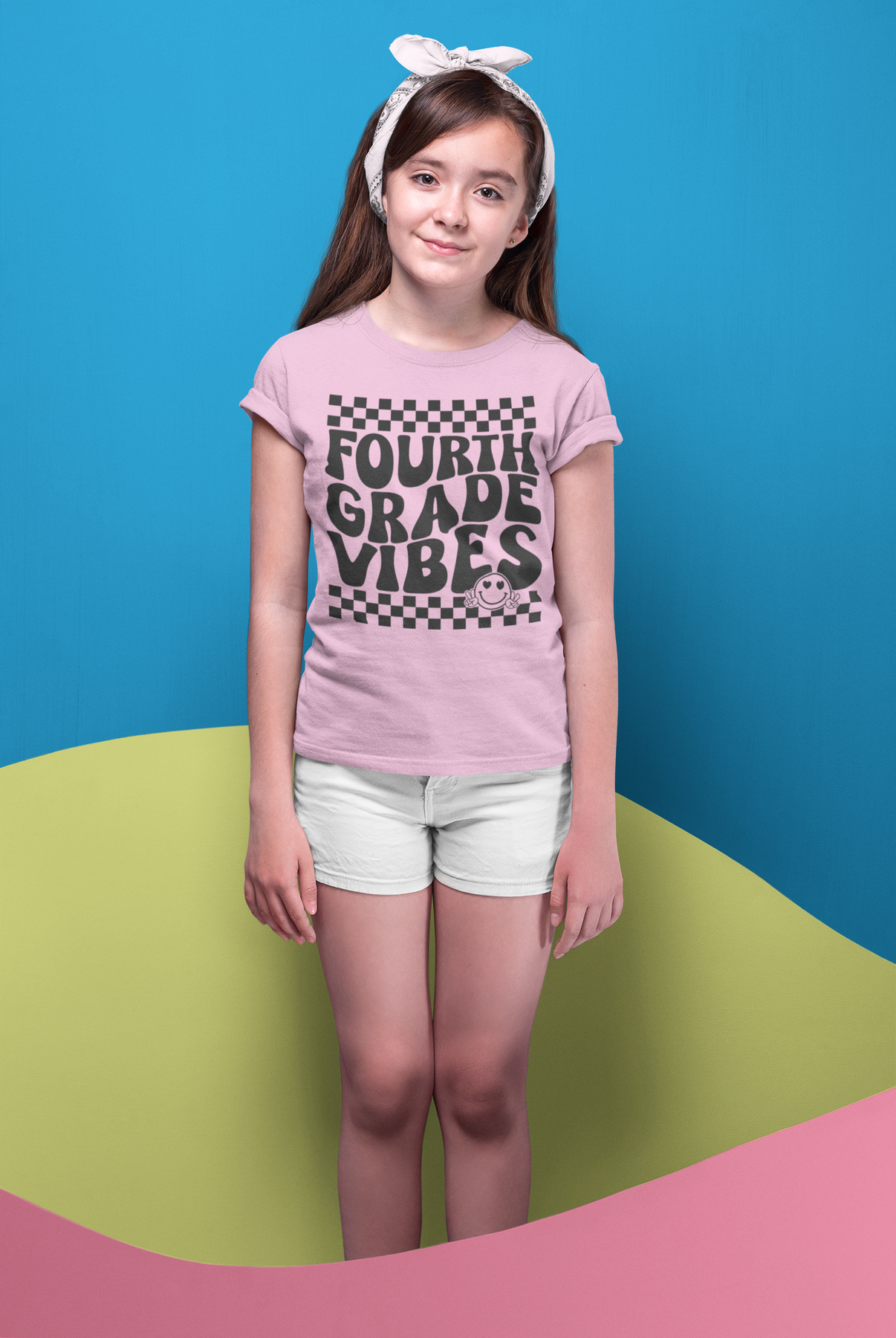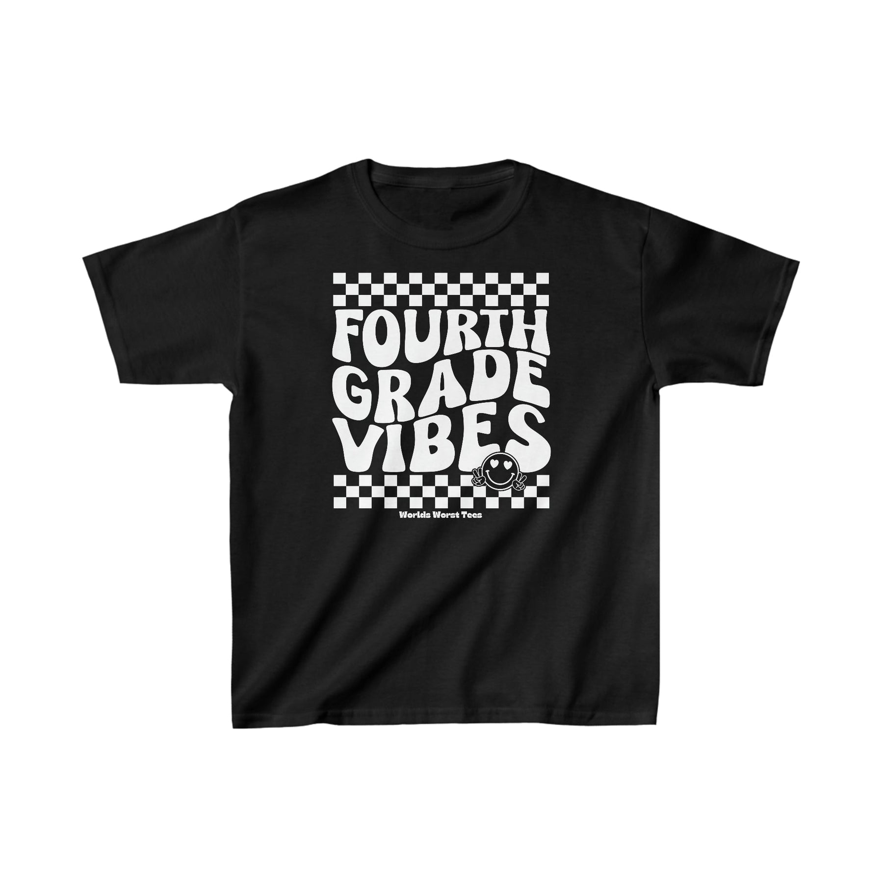 A black and white graphic tee for kids, featuring 4th Grade Vibes. 100% cotton, light fabric, classic fit, tear-away label. Sizes XS to XL. Ideal for everyday wear. Enhance your kid's style with this durable, ribbed-knit collar tee.
