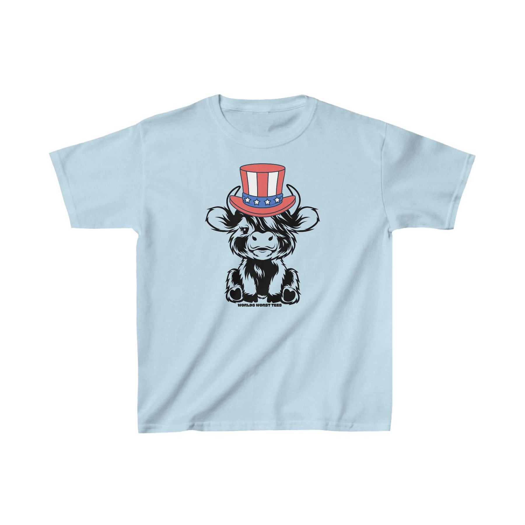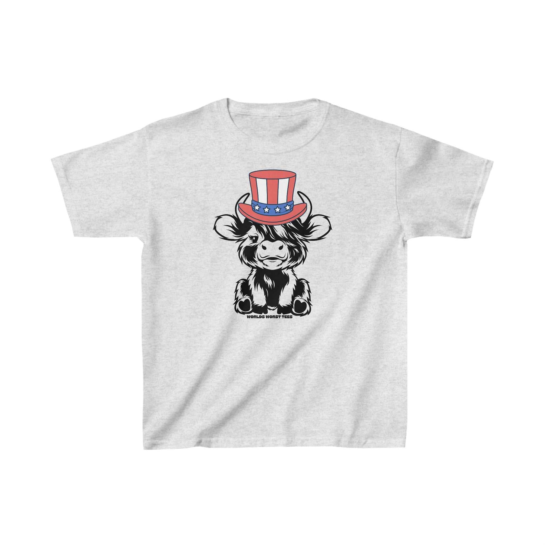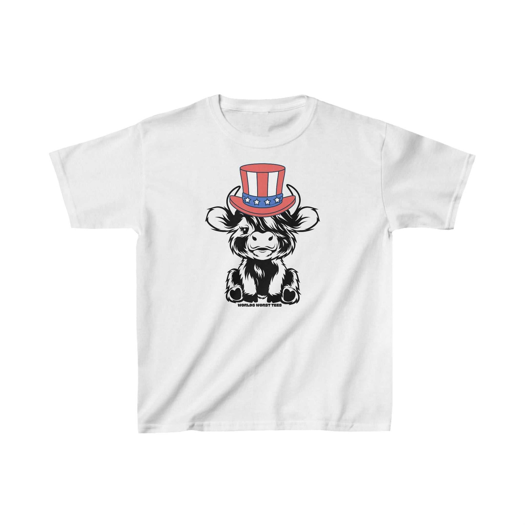 A kids' tee featuring a cartoon cow in a hat, ideal for daily wear. Made of 100% cotton, with twill tape shoulders for durability and ribbed collar. Title: 4th of July Little Dude Cow Kids Tee.