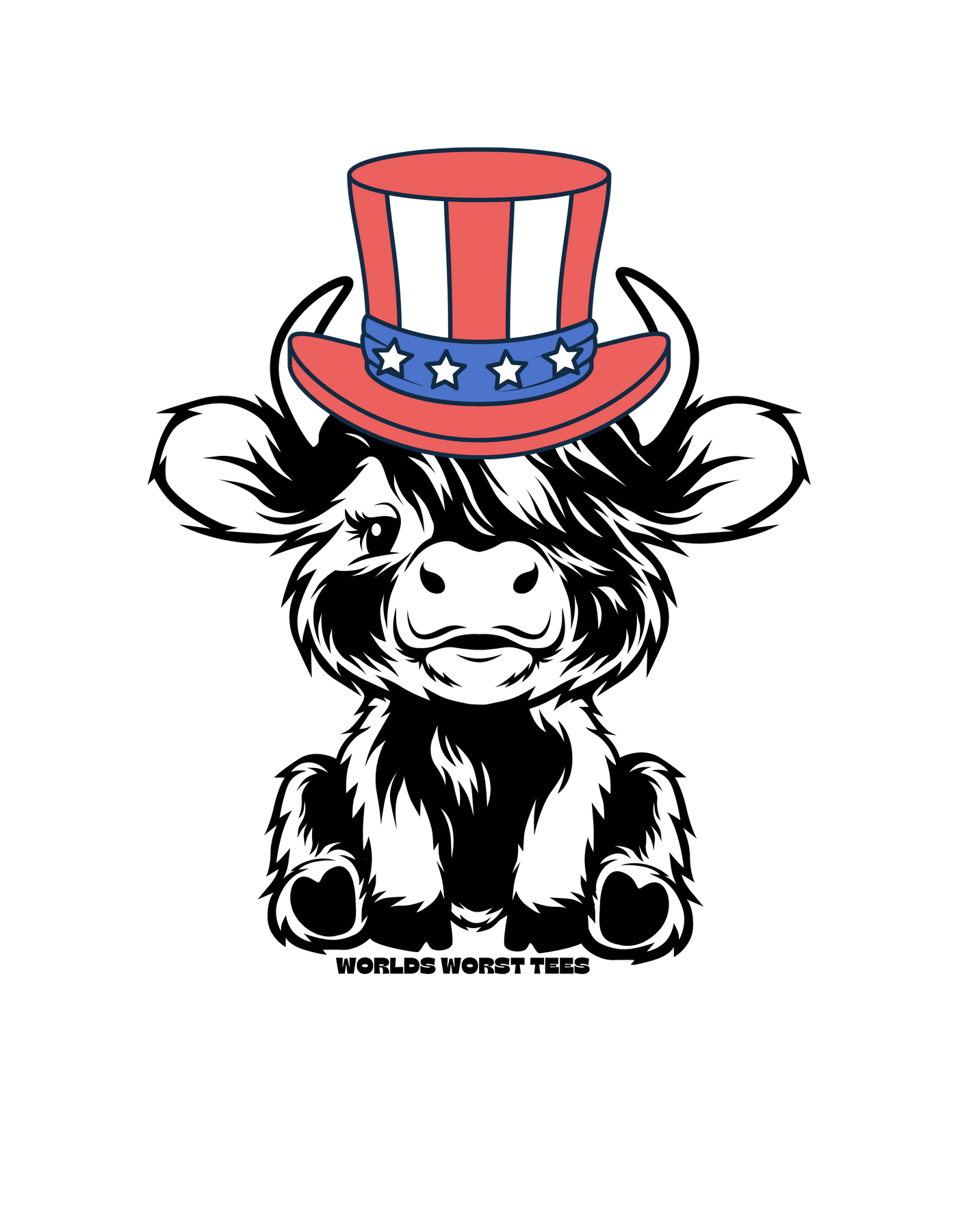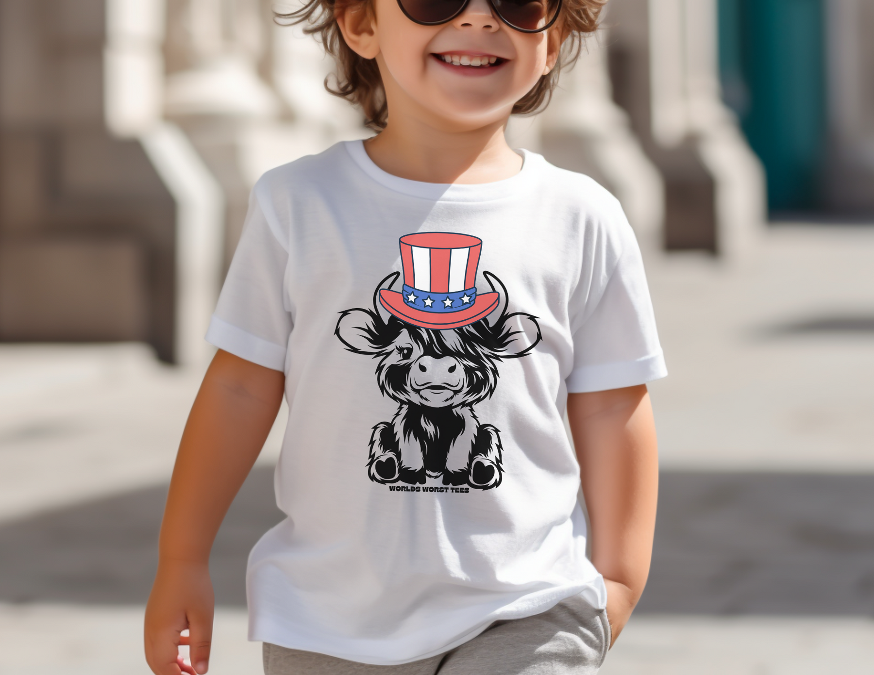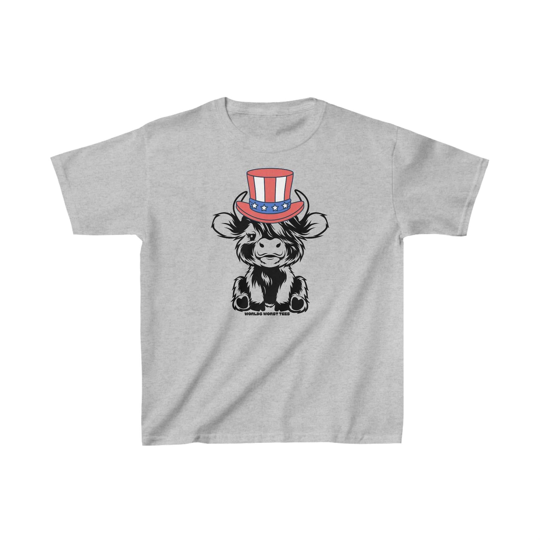 A kids' tee featuring a cartoon cow in a hat, ideal for daily wear. Made of 100% cotton, with twill tape shoulders for durability and ribbed collar. Title: 4th of July Little Dude Cow Kids Tee.