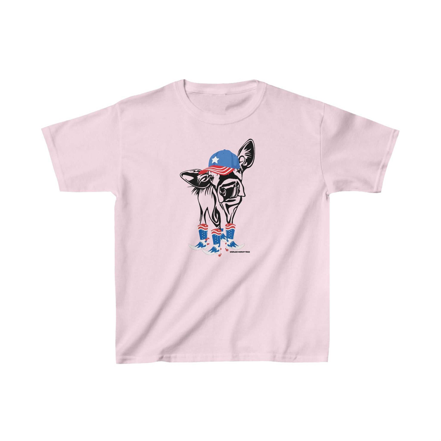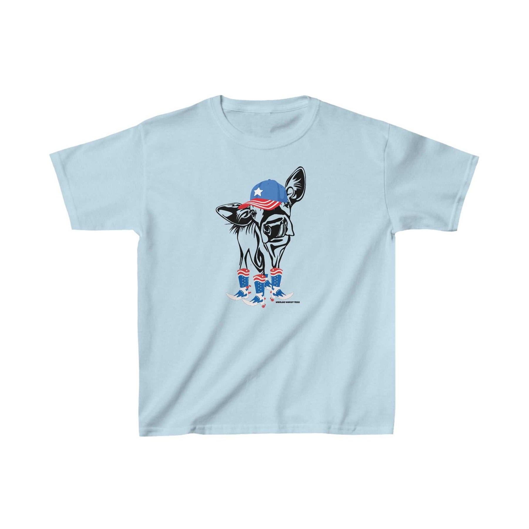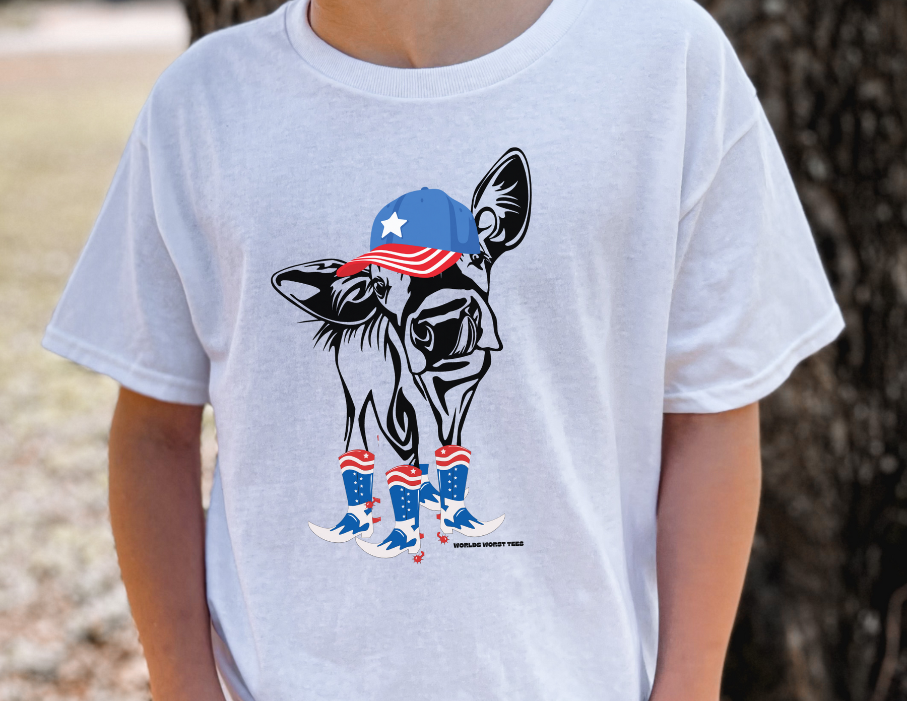 A kids' tee featuring a blue hat with a white star and red stripes, cowboy boots, and a flag. 100% cotton, light fabric, classic fit, ideal for everyday wear. From 'Worlds Worst Tees'.