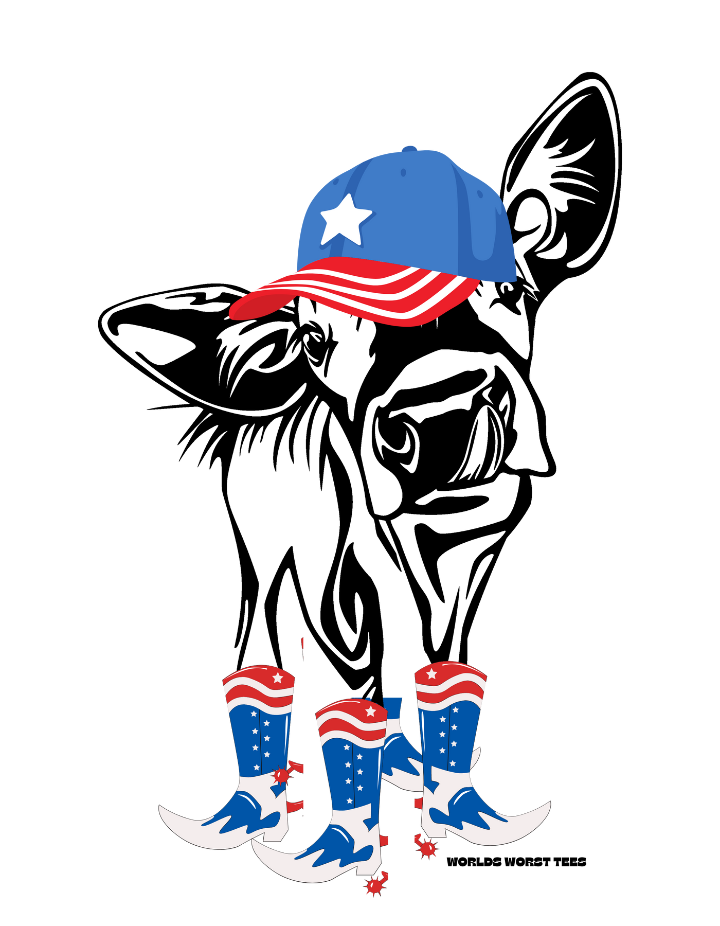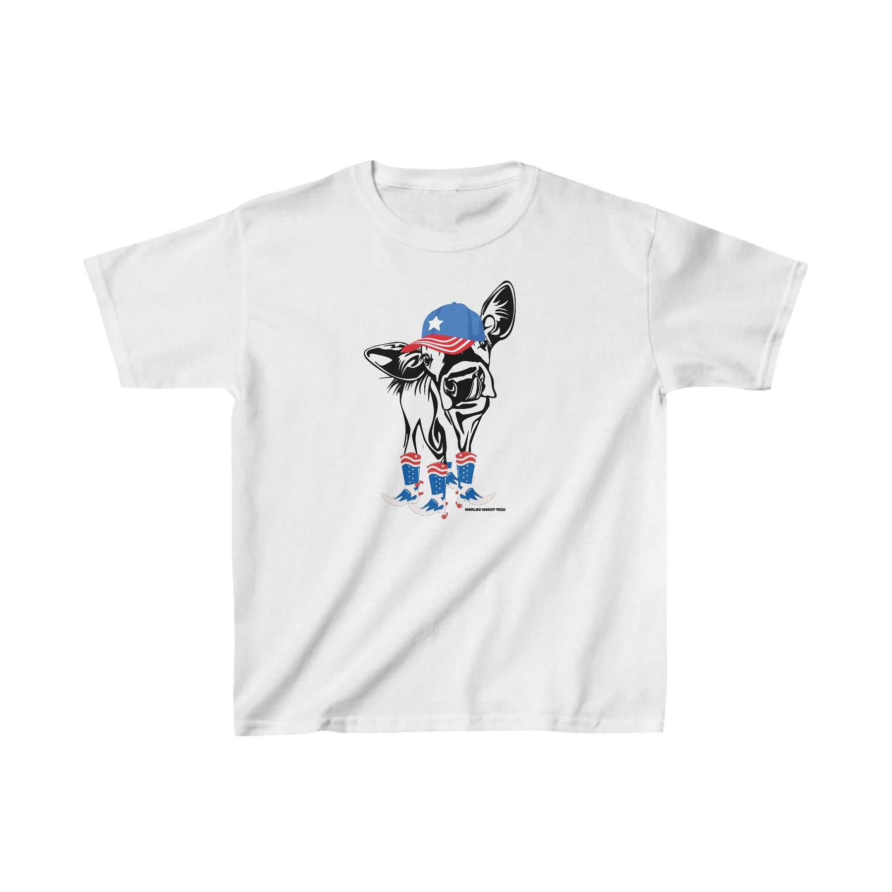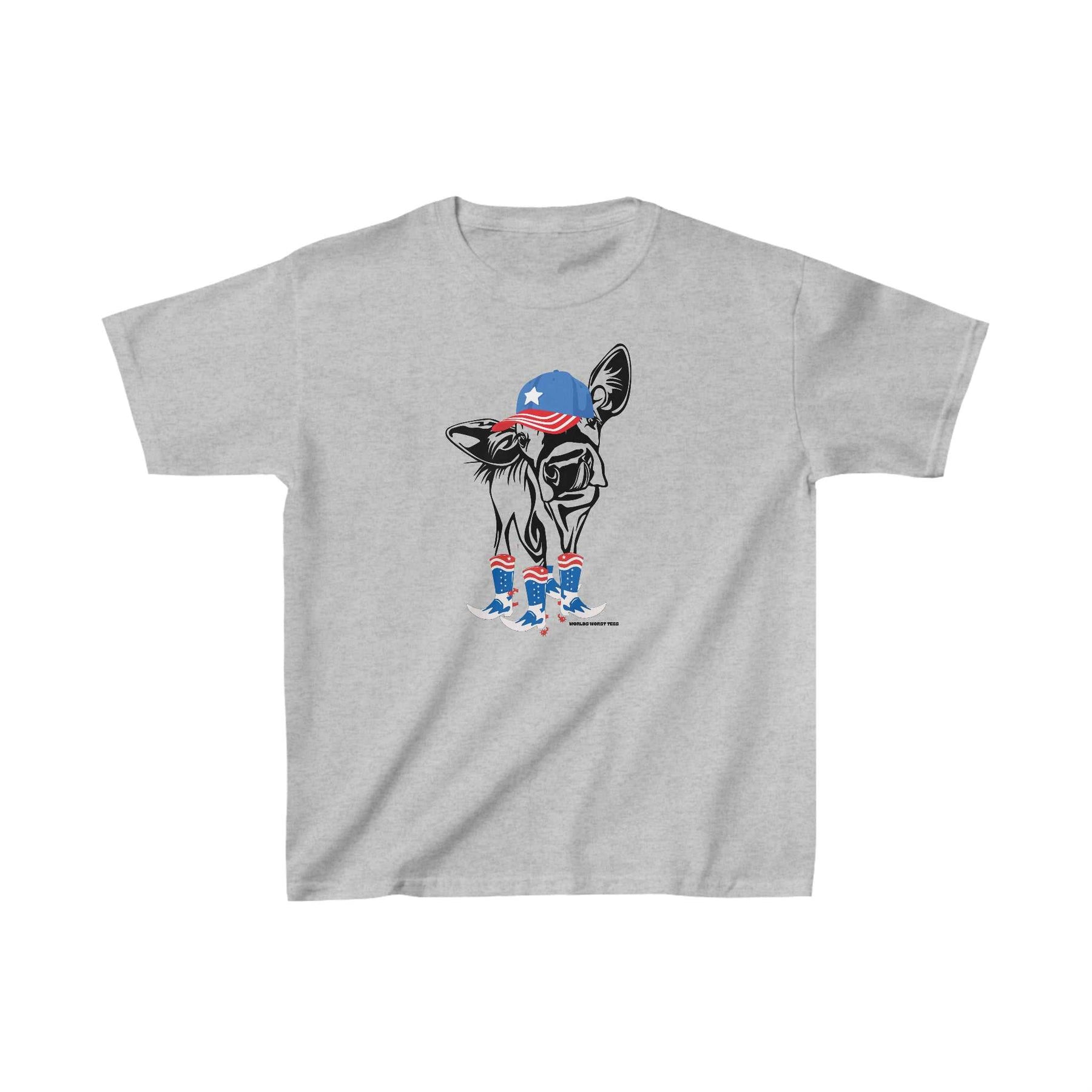 A kids' tee featuring a blue hat with a white star and red stripes, cowboy boots, and a flag. 100% cotton, light fabric, classic fit, ideal for everyday wear. From 'Worlds Worst Tees'.