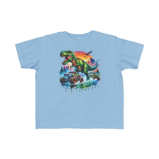 Dino Truck Toddler Tee featuring a vibrant T. rex graphic with monster trucks, ideal for toddlers' sensitive skin, made of soft, durable cotton.