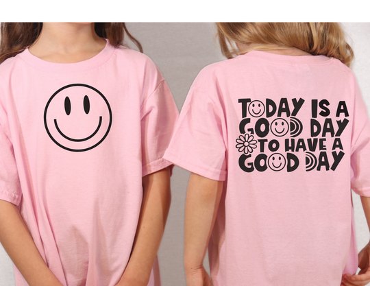 It's a Good Day to Have a Good Day Tee. Kids will love this custom youth short sleeve tee. This lightweight (4.0 oz) side-seamed shirt maximizes comfort all day long. The ring-spun cotton makes this kids short sleeve tee perfect for displaying custom artwork. Side seams keep the garment's shape. The shoulders have tape for longer fitting. The collar is extra elastic due to ribbed knitting.