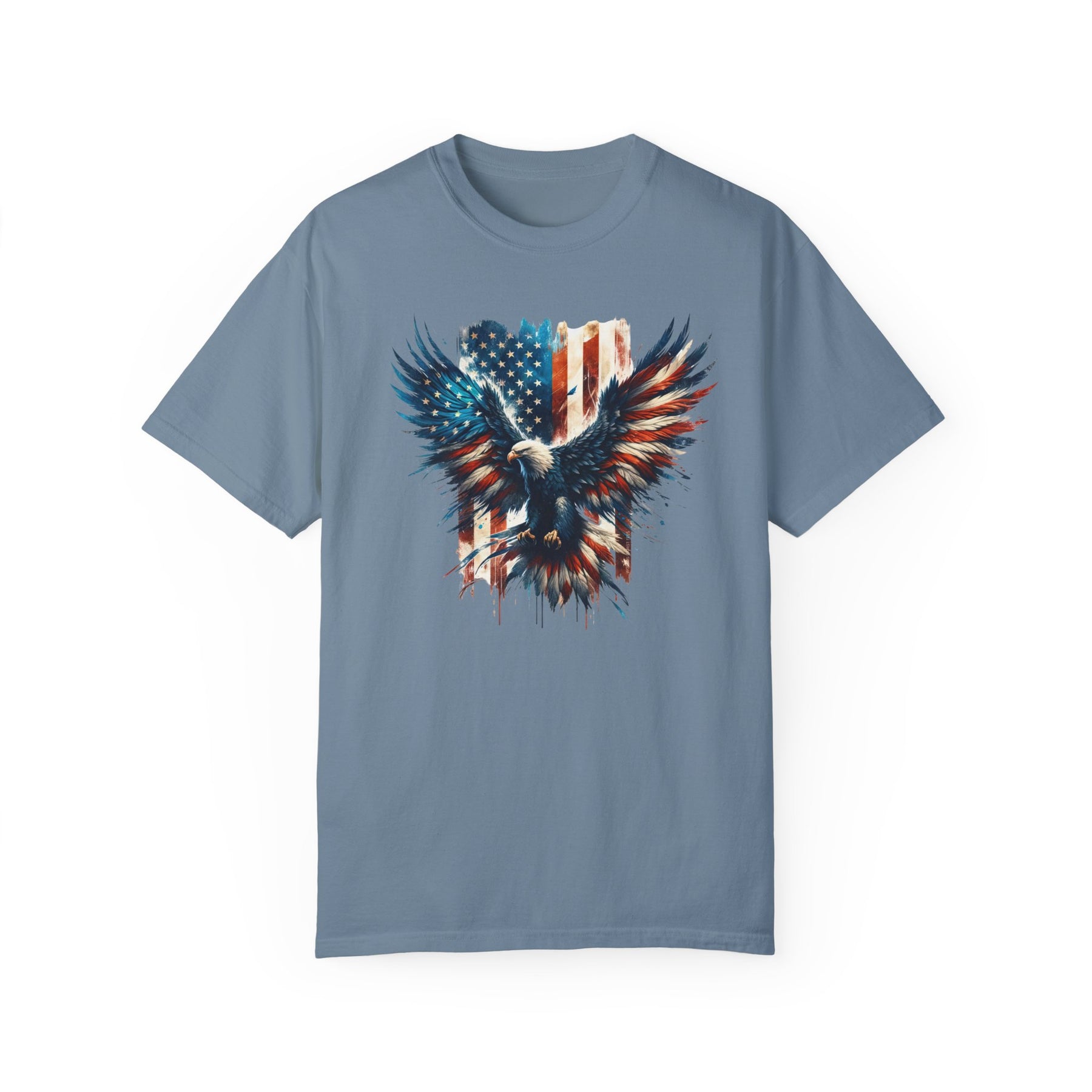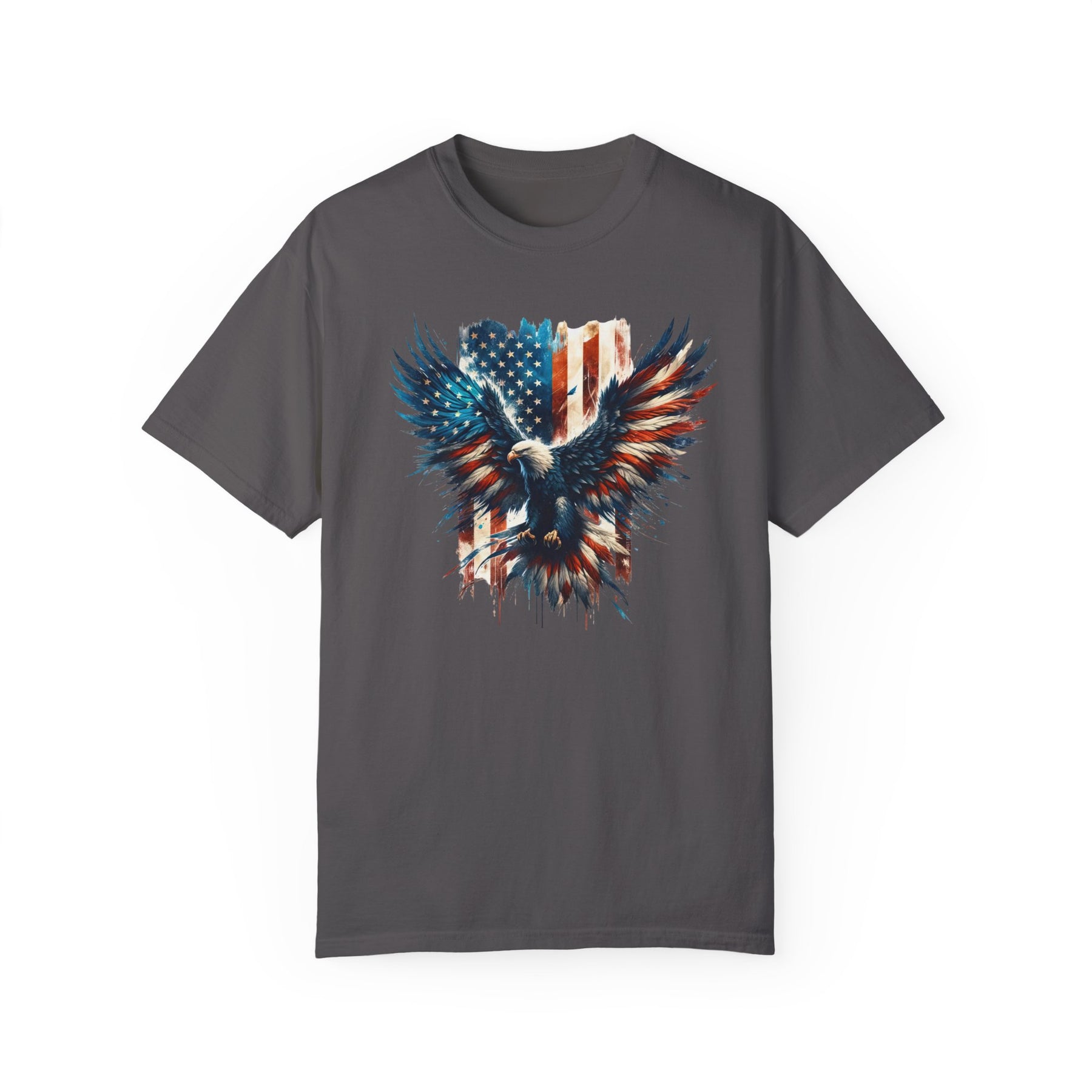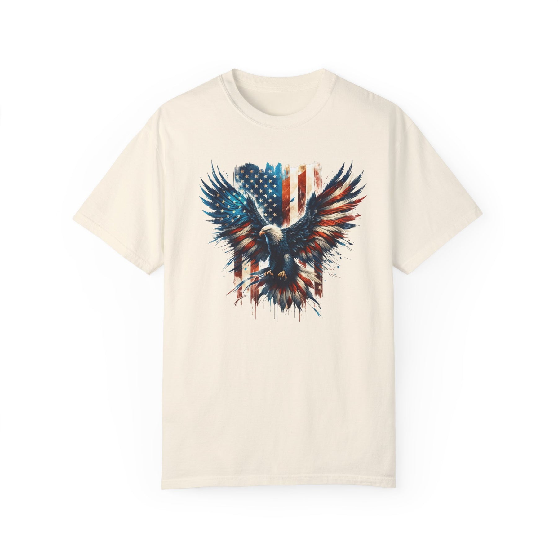 A relaxed fit American Eagle Tee, featuring a bold eagle and flag graphic on soft ring-spun cotton. Garment-dyed for extra coziness, with durable double-needle stitching and a seamless design for a tubular shape.