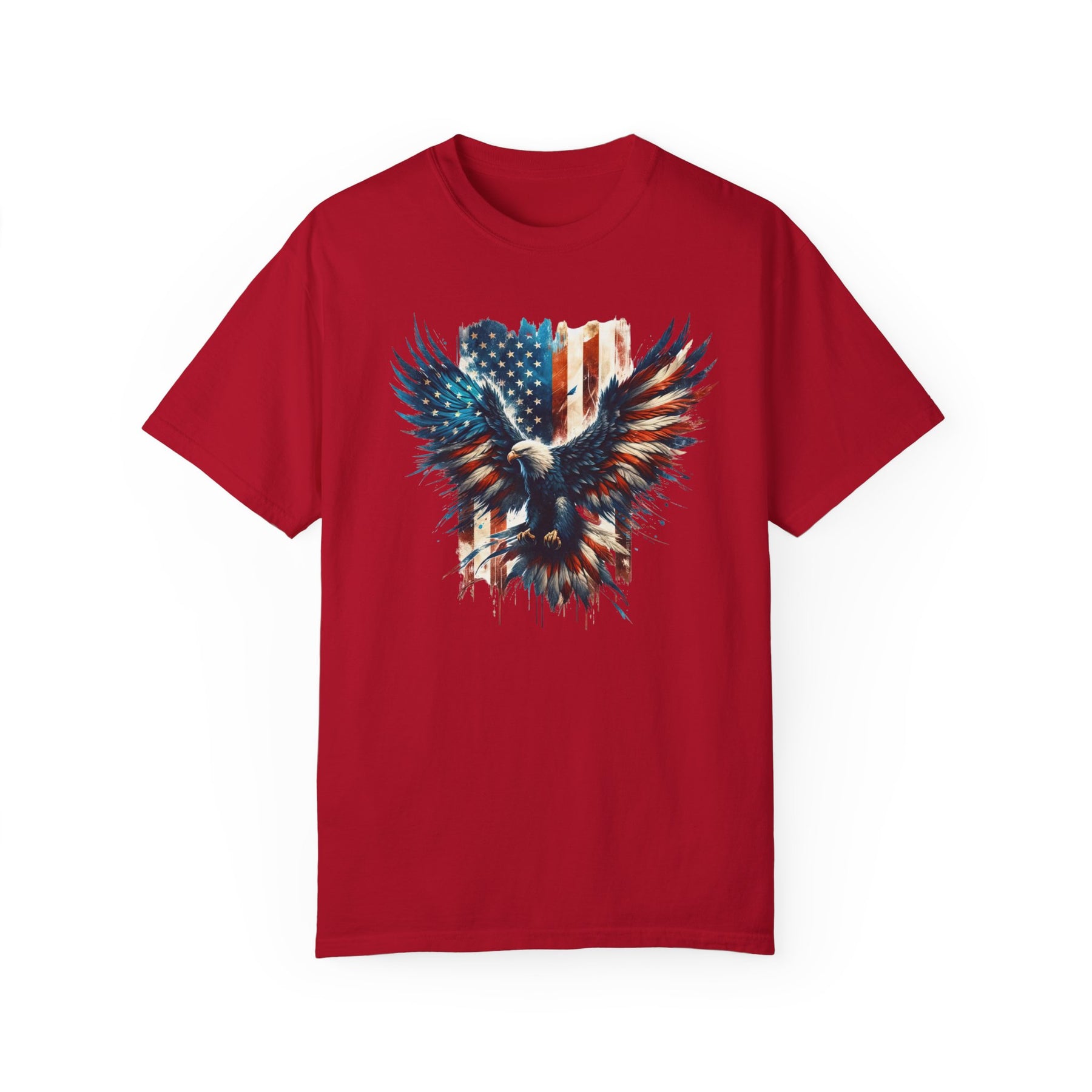 American Eagle Tee: Red shirt featuring an eagle and flag design. 100% ring-spun cotton, garment-dyed for coziness. Medium weight, relaxed fit, durable double-needle stitching. No side-seams for a tubular shape.
