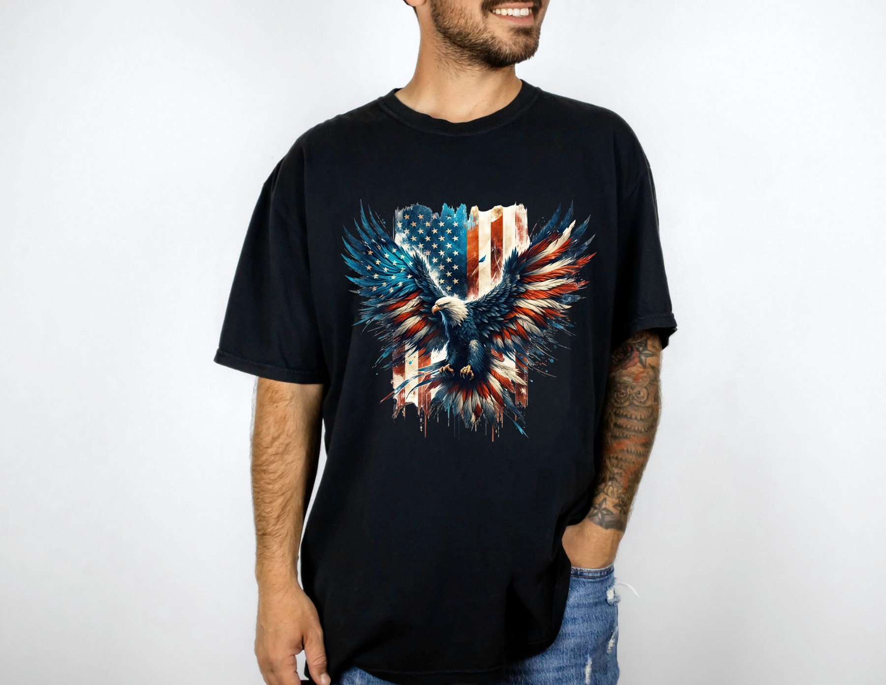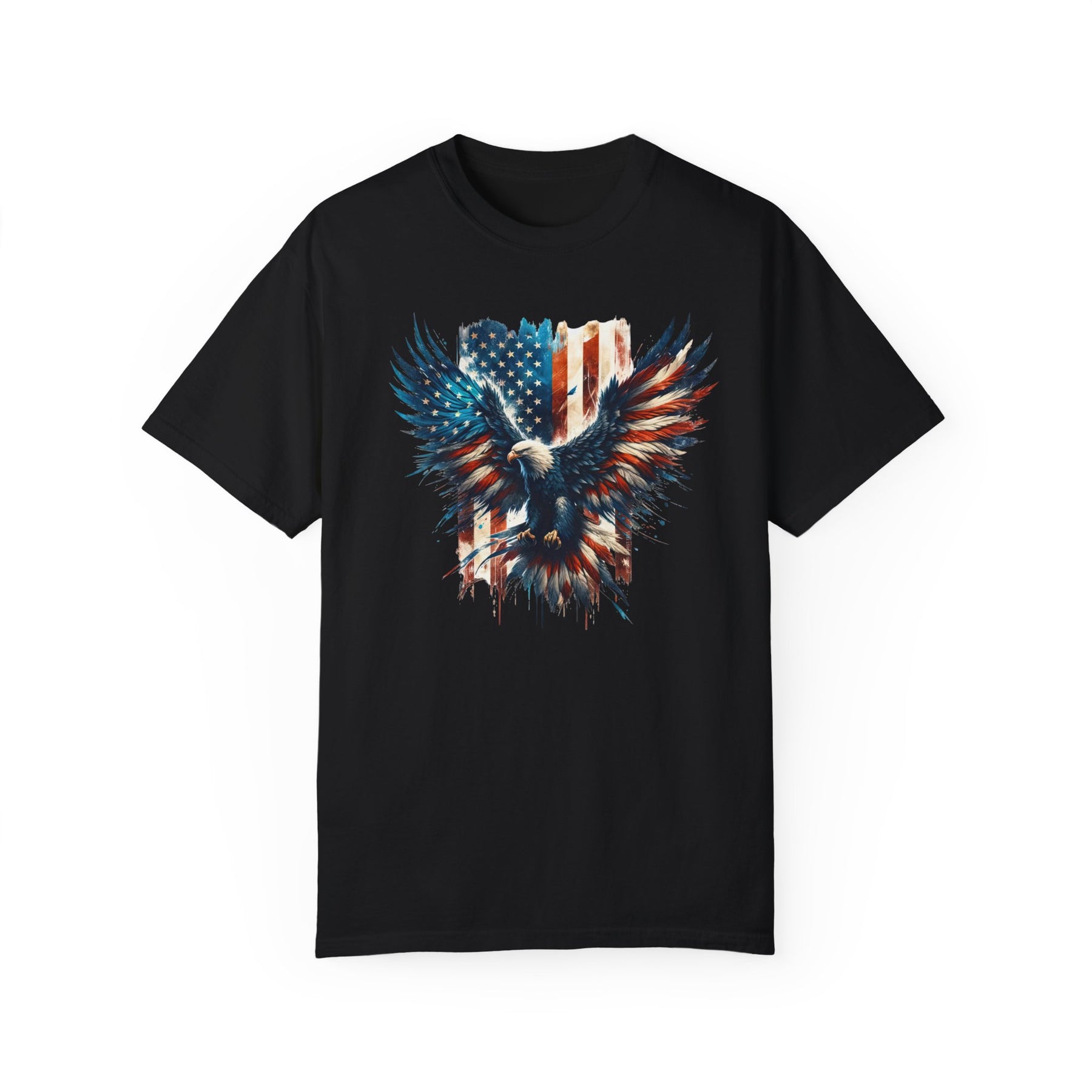 American Eagle Tee: A relaxed-fit t-shirt featuring a painting of an eagle with a flag, embodying patriotism and style. Made of 100% ring-spun cotton for comfort and durability. From Worlds Worst Tees.