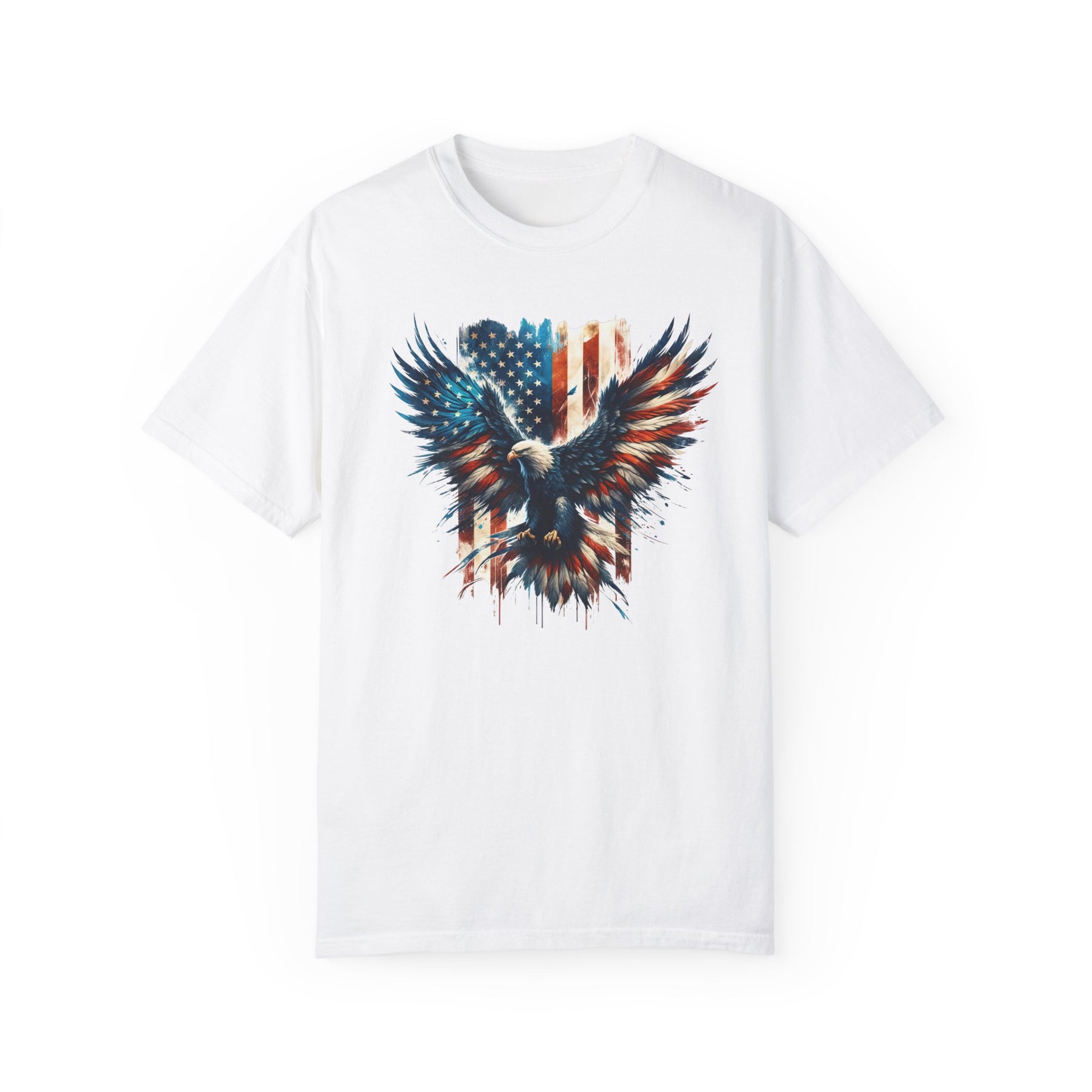 American Eagle Tee: White shirt with eagle and flag print. 100% ring-spun cotton, garment-dyed for coziness. Relaxed fit, double-needle stitching for durability. No side-seams for tubular shape.