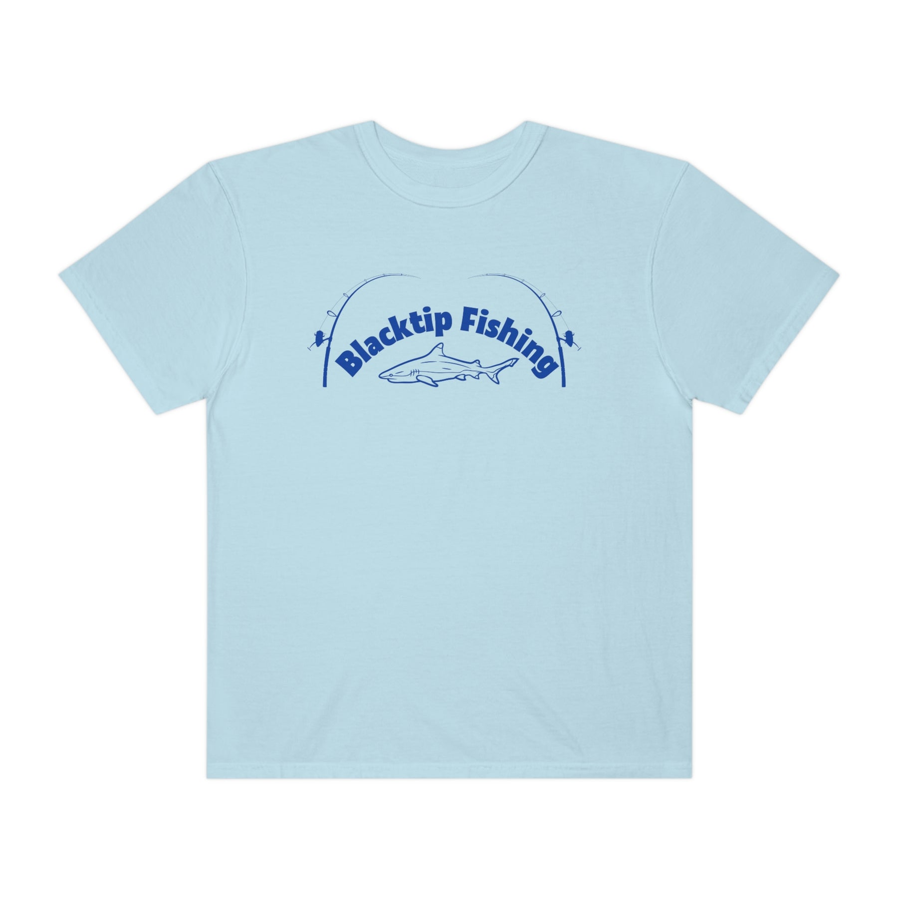 A customizable Blacktip Fishing Unisex Tee by Comfort Colors, featuring a shark logo on light blue fabric. 100% ring-spun cotton, relaxed fit, durable double-needle stitching, and seamless design for comfort.