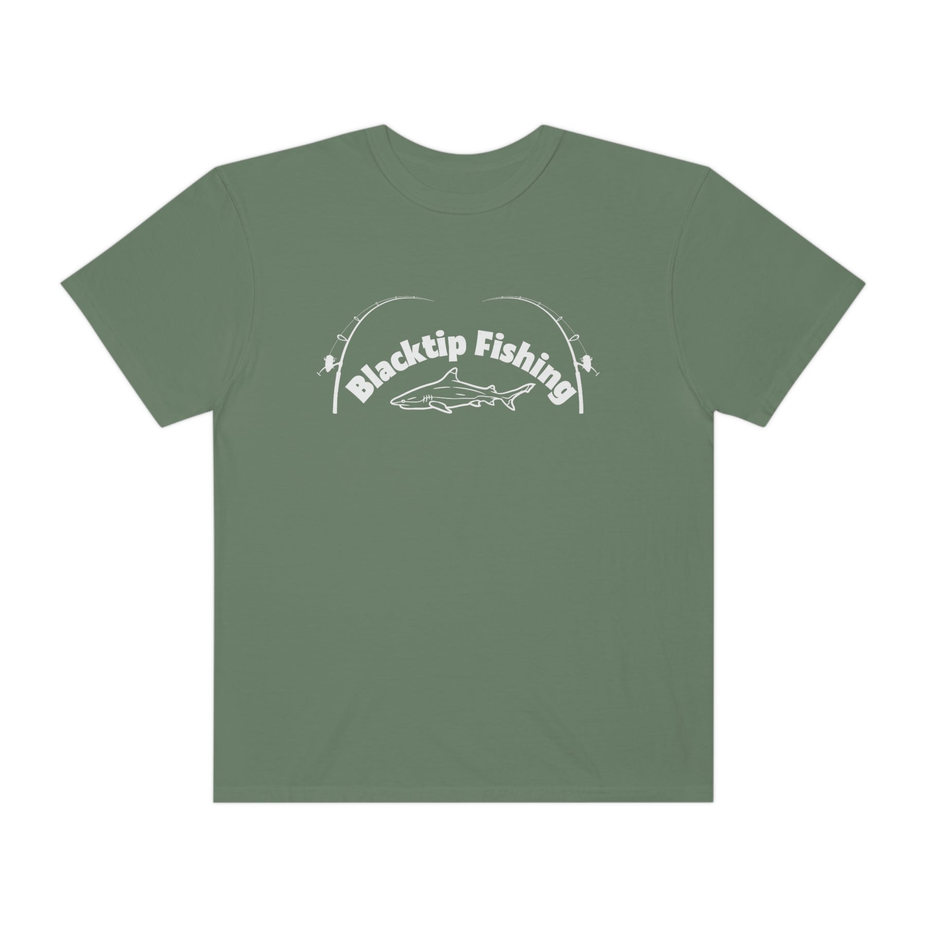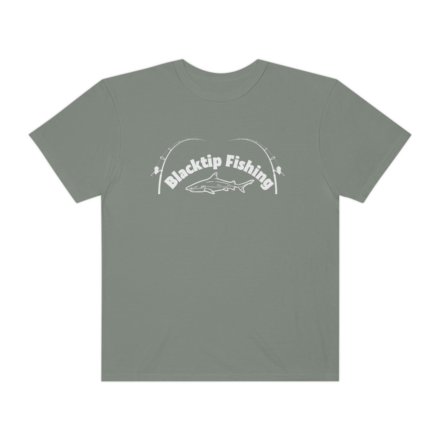 Blacktip Fishing Unisex Tee by Comfort Colors: Ring-spun cotton shirt with shark and fish design, durable double-needle stitching, and seamless sides. Perfect for daily wear. From Worlds Worst Tees.