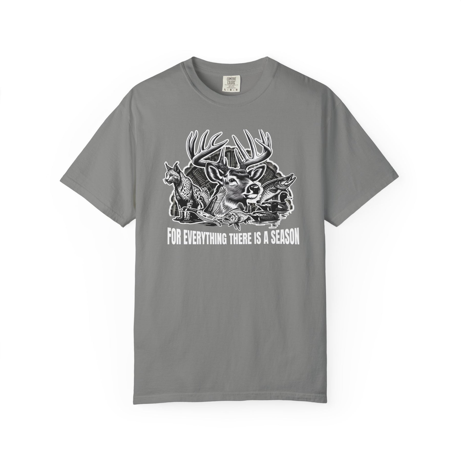 For Everything There is a Season Tee: Gray shirt with wildlife montage featuring a buck, fox, fish, and ducks, plus the slogan FOR EVERYTHING THERE IS A SEASON.