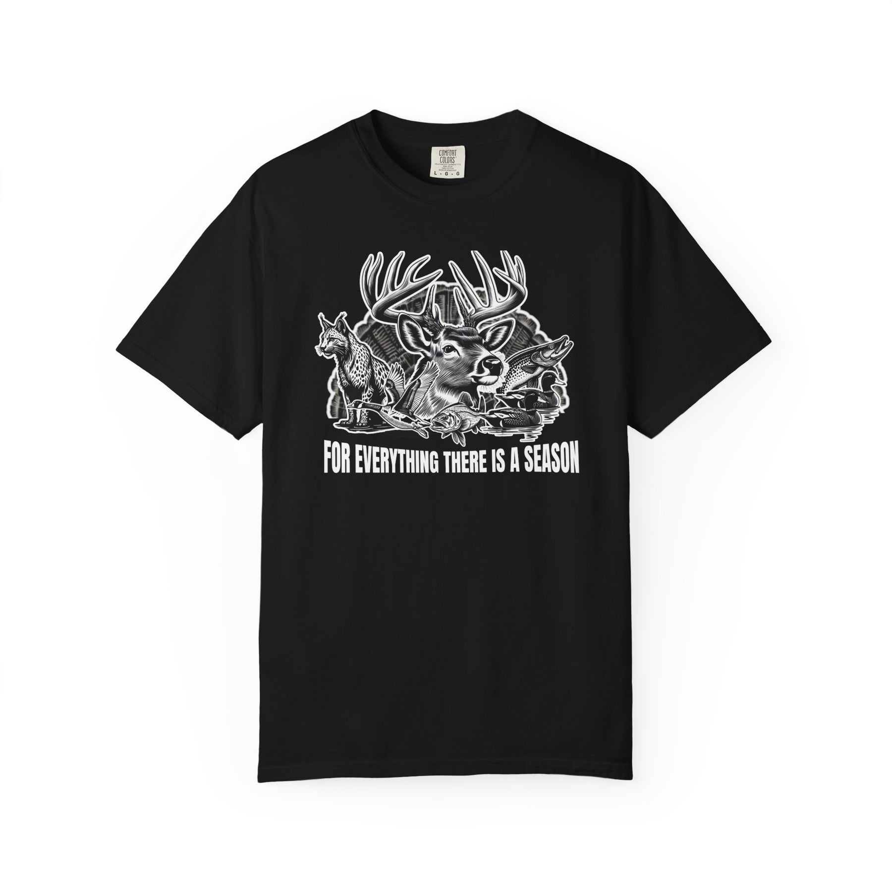 For Everything There is a Season Tee features a wildlife graphic with a buck, fox, ducks, and fish, highlighting nature's cycle, on a black T-shirt.