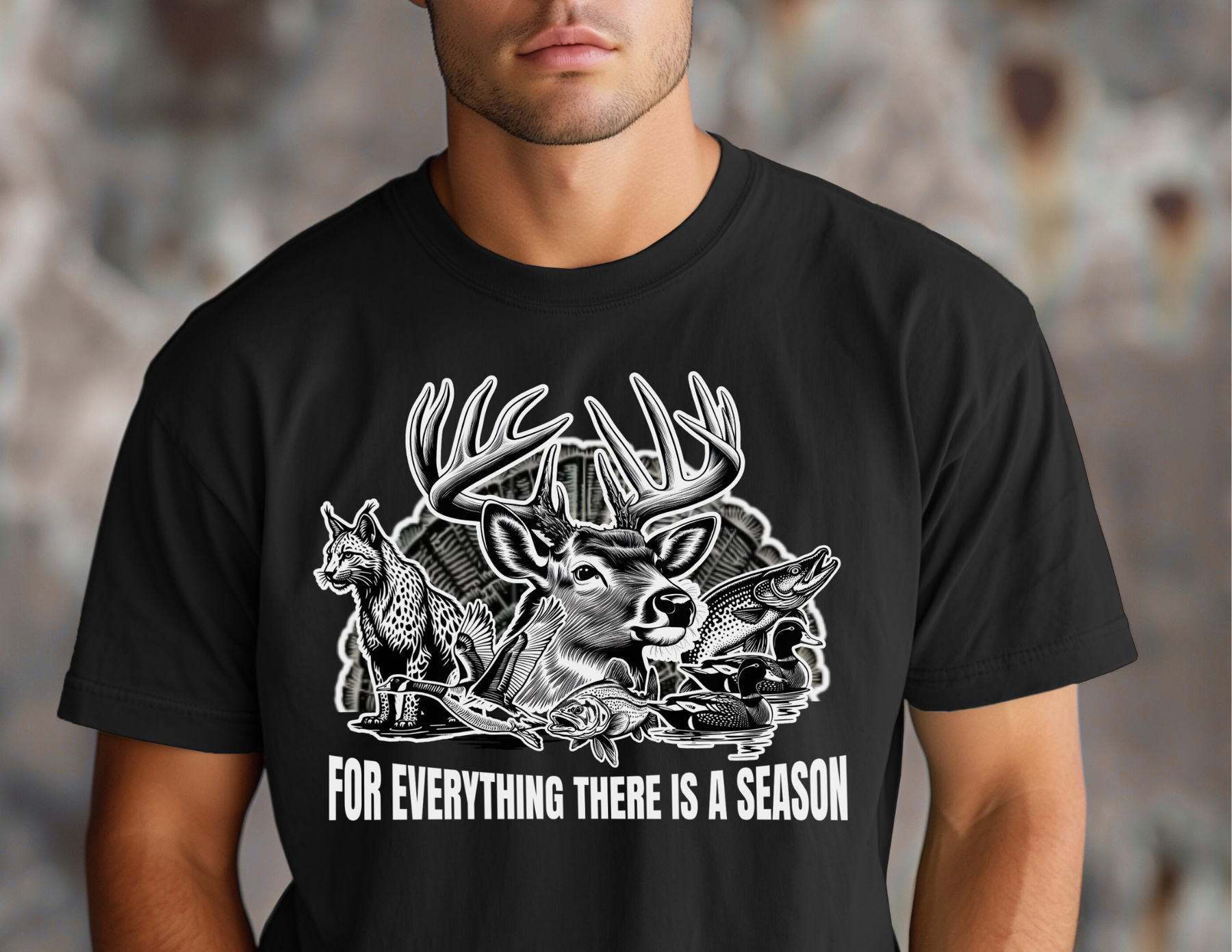 For Everything There is a Season Tee features a striking black-and-white wildlife collage with a buck, wildcat, waterfowl, trout, ducks, and turkey feathers.