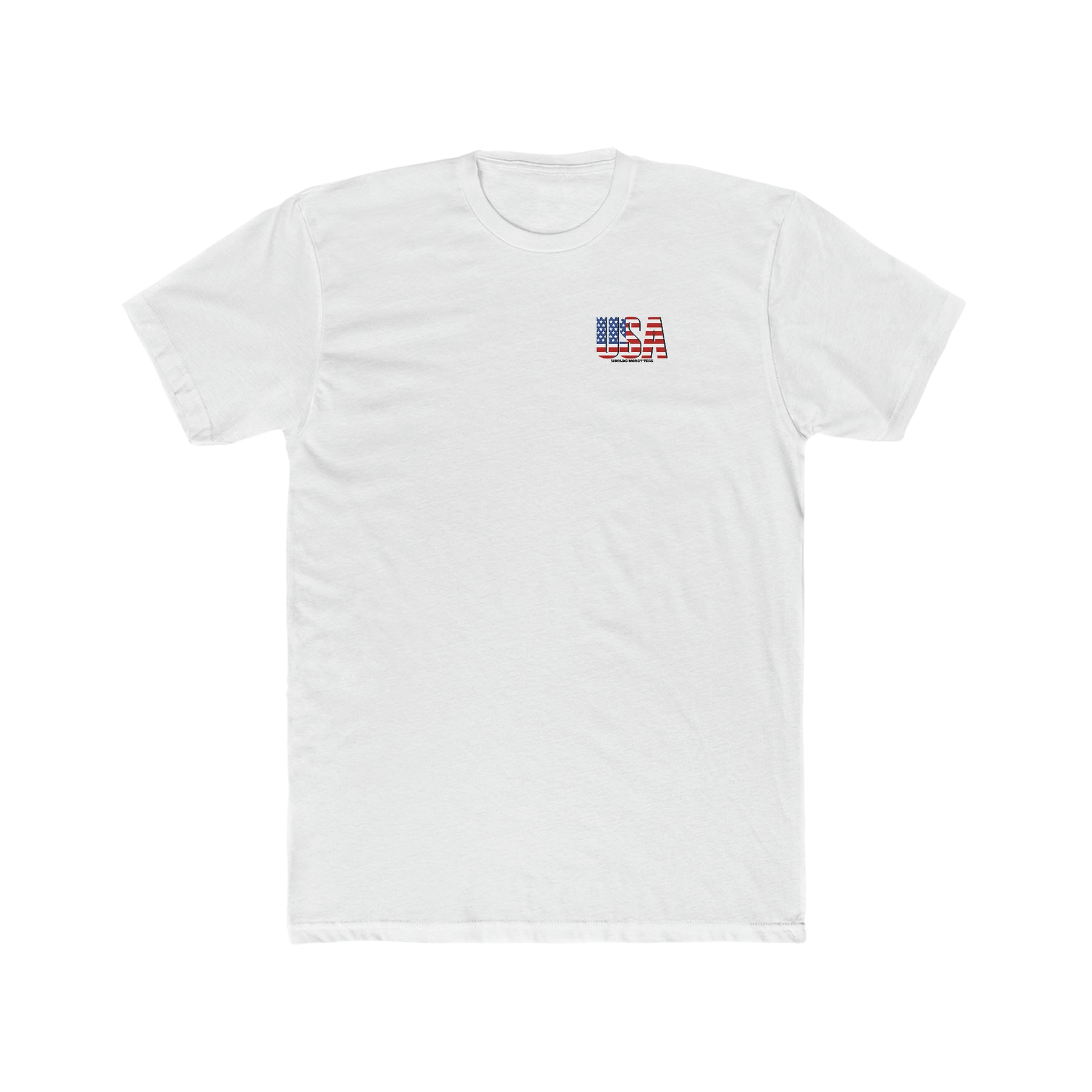 White t-shirt featuring a map of the United States with a flag design. Premium fitted, 100% combed cotton tee for a comfy, light feel. Ideal for workouts or daily wear.