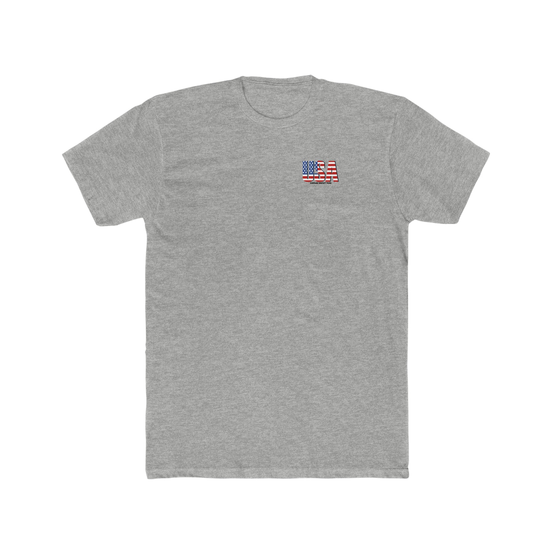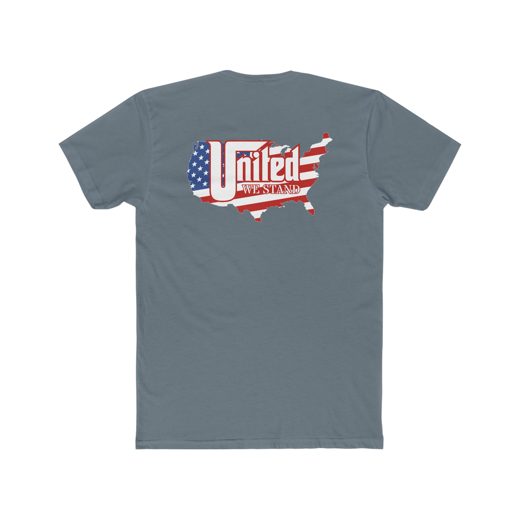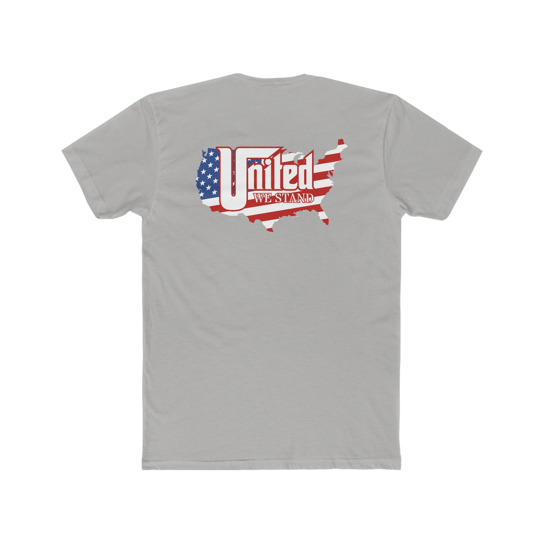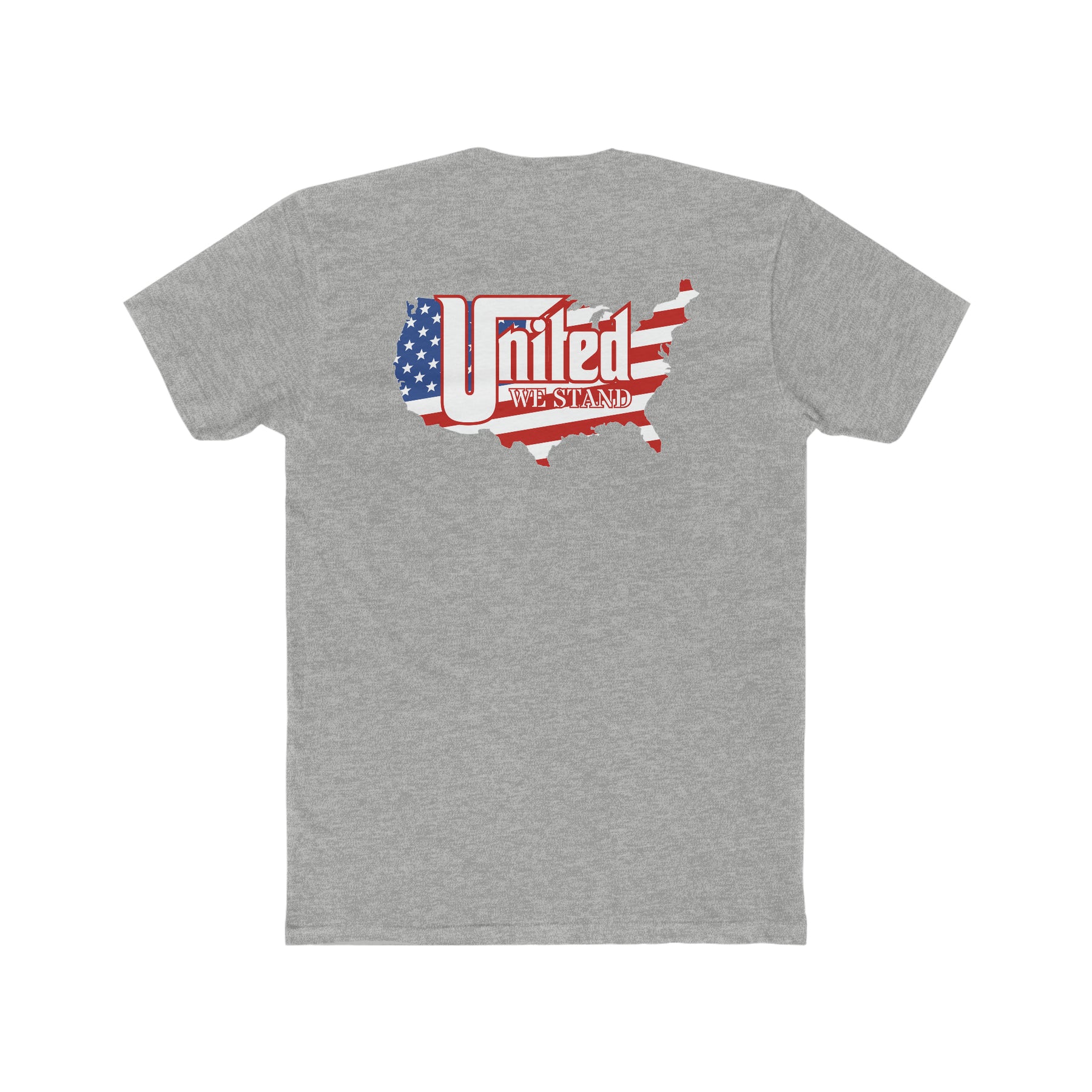 A premium United We Stand Tee, featuring a grey shirt with a map of the United States and a flag design. Comfy and light, made of 100% combed, ring-spun cotton. Ideal for workouts or daily wear.