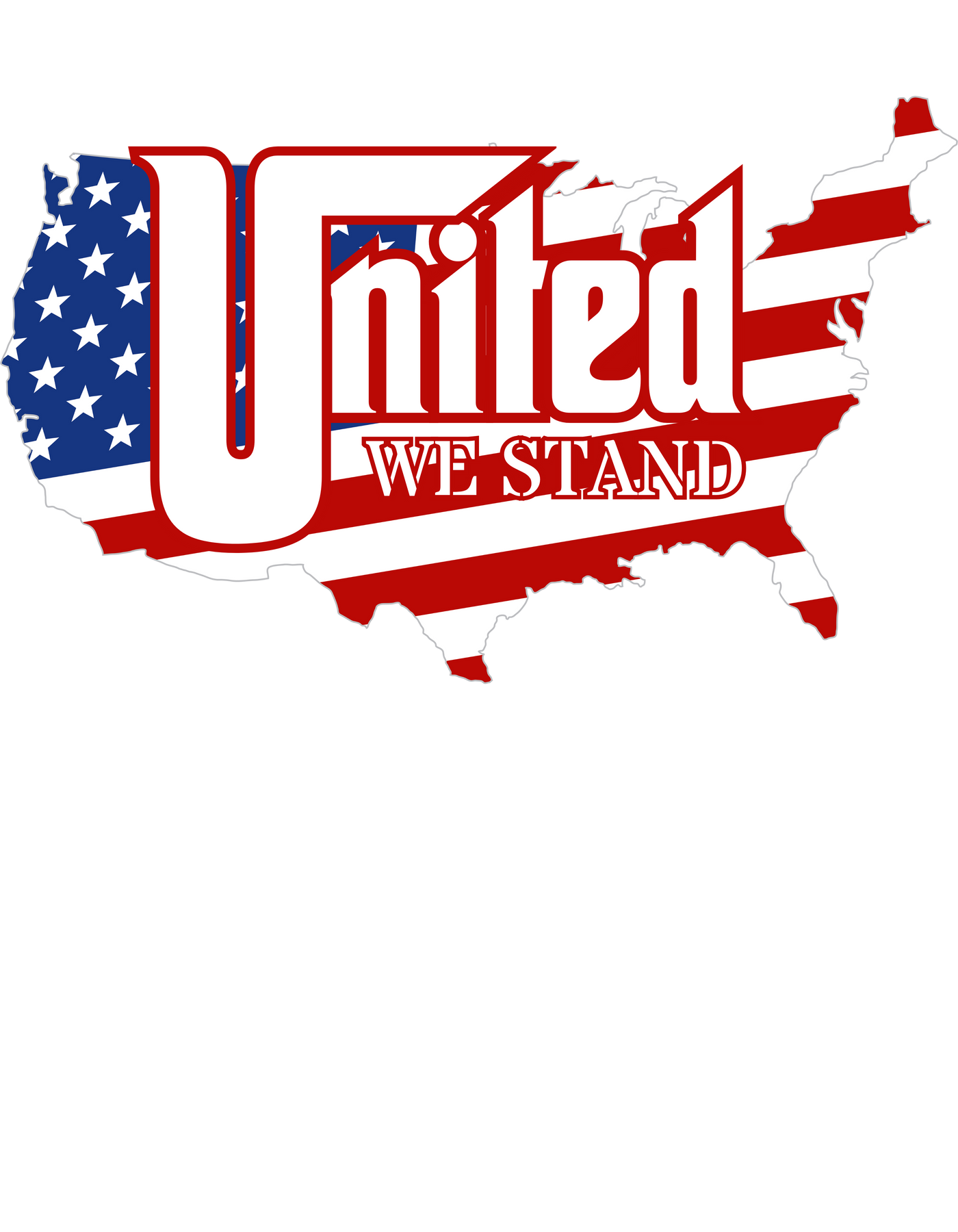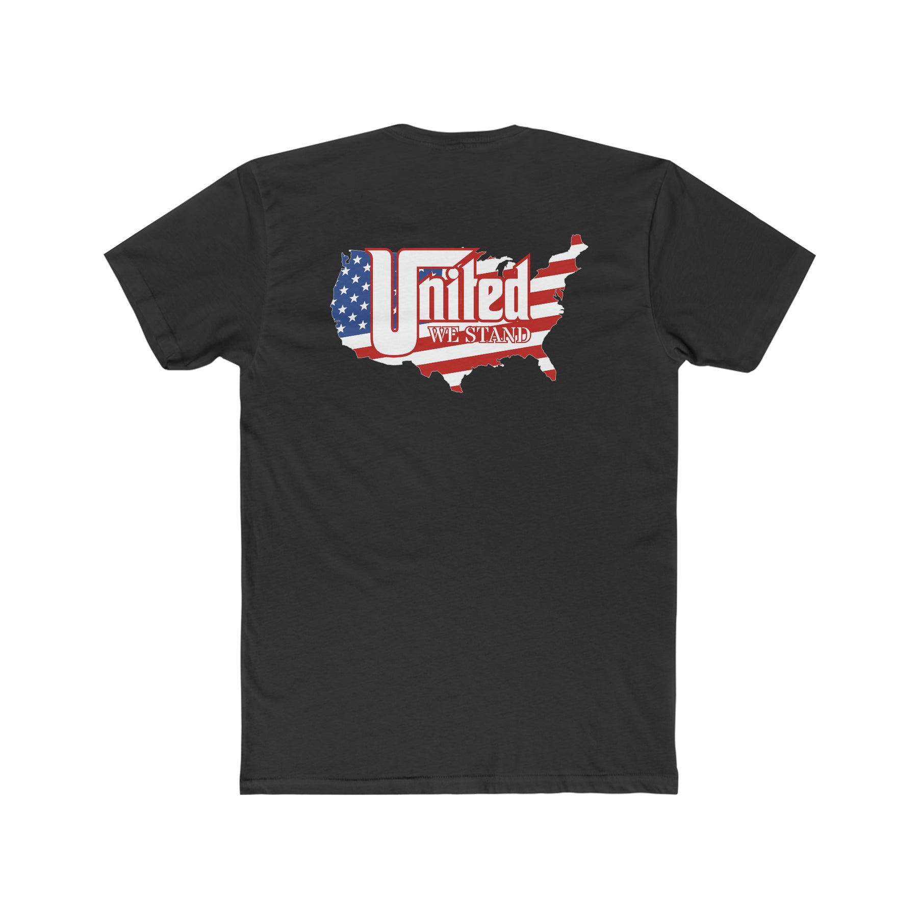 A premium United We Stand Tee in black with red, white, and blue text. 100% combed, ring-spun cotton, light fabric, tear-away label, and a statement-making print. Sizes XS to 4XL.