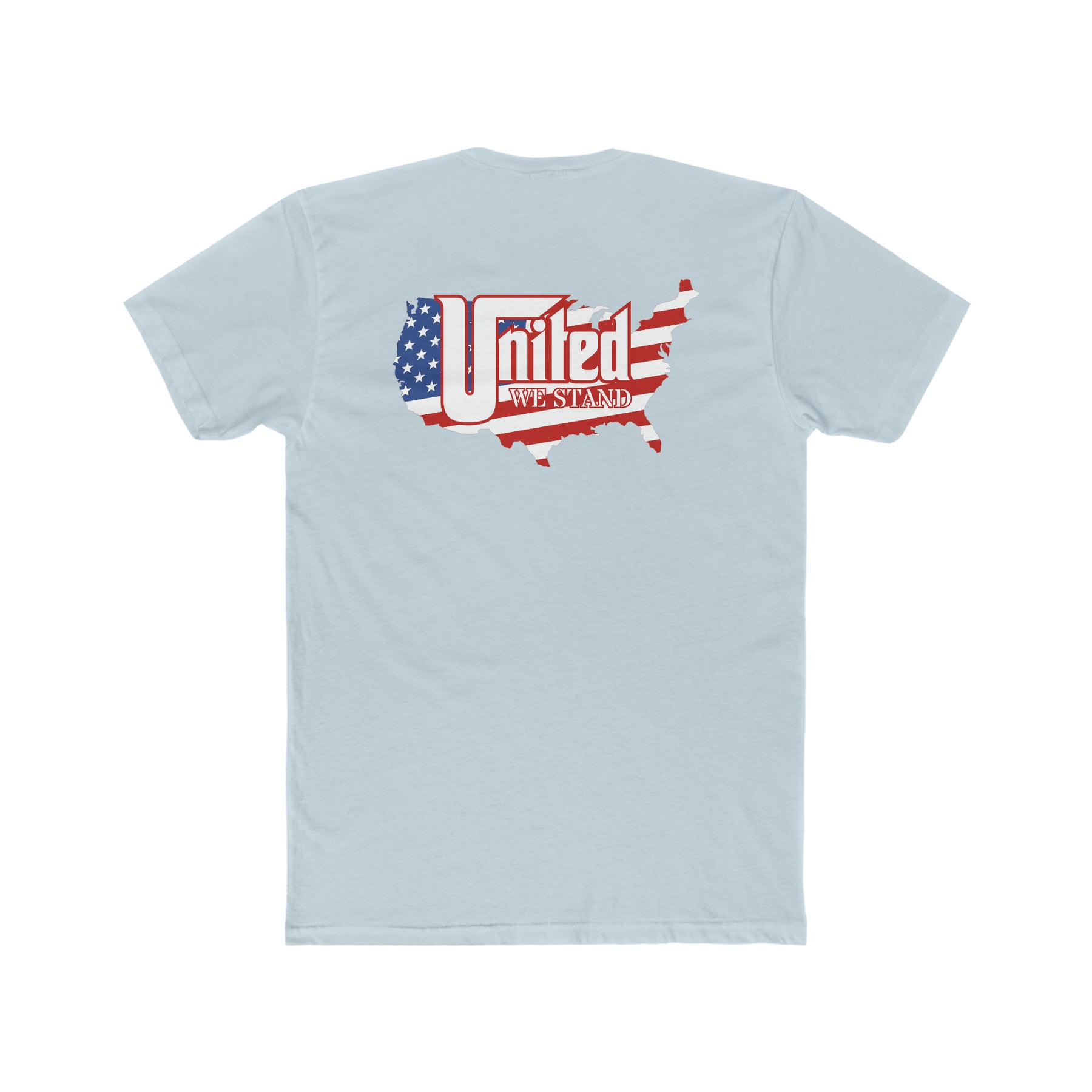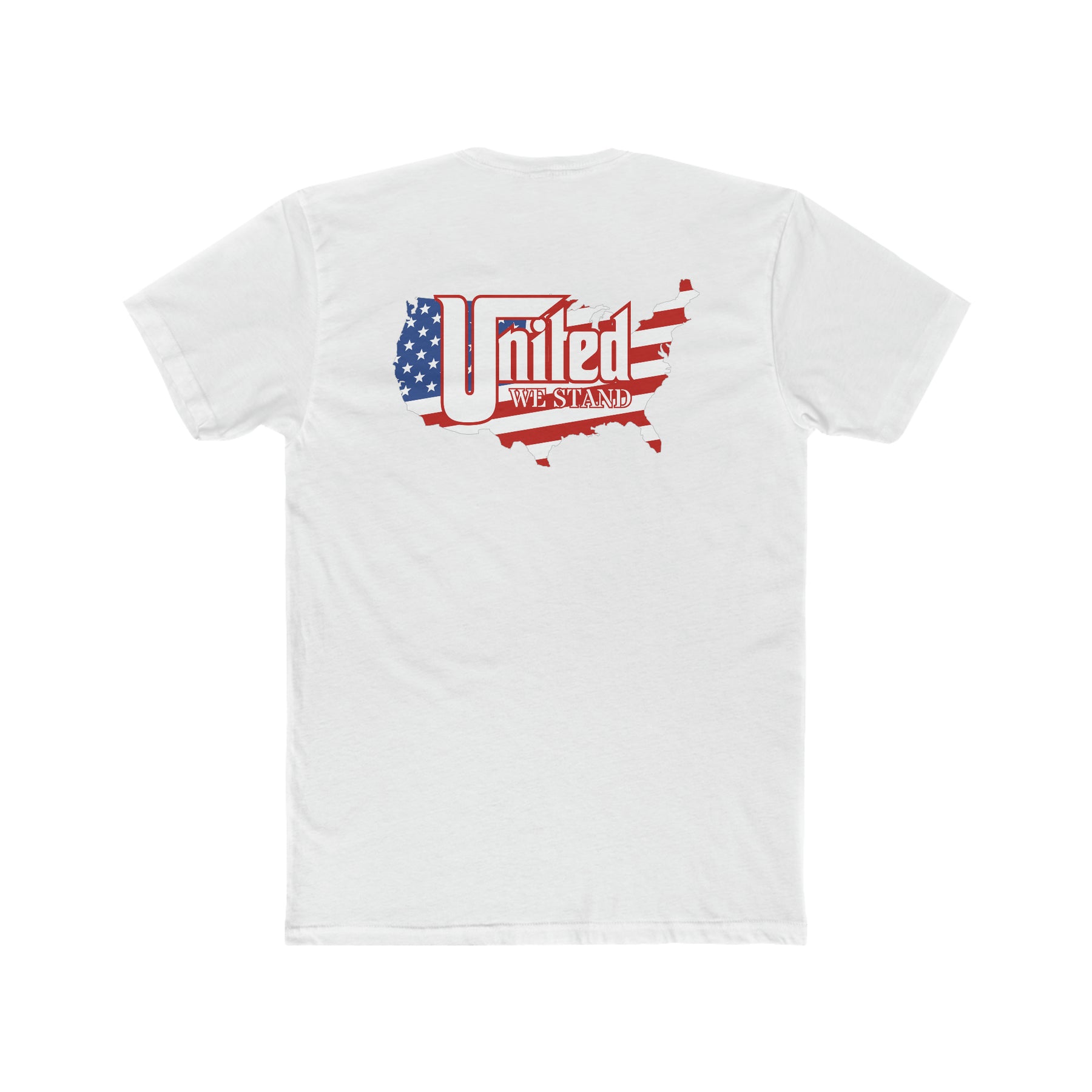 A premium United We Stand Tee, featuring a logo with stars and stripes on a white t-shirt. Comfy, light, 100% cotton fabric with a tear-away label, ideal for workouts or daily wear.