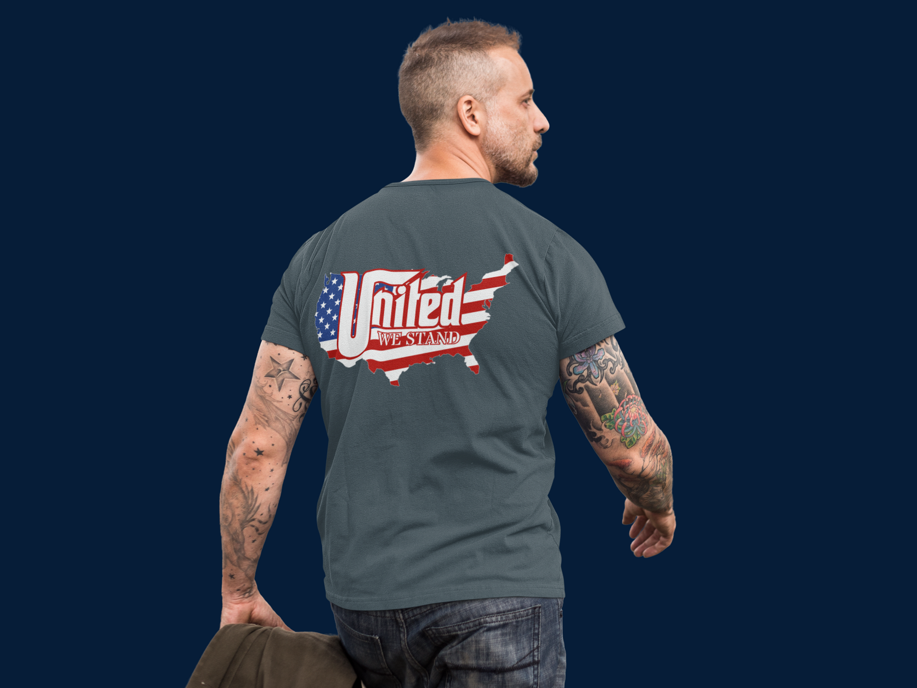 United We Stand Tee: A map of the U.S. with a flag, red, white, and blue design, and a state map with stars. Premium fitted tee in 100% cotton, light fabric, tear-away label, ideal for workouts or daily wear.