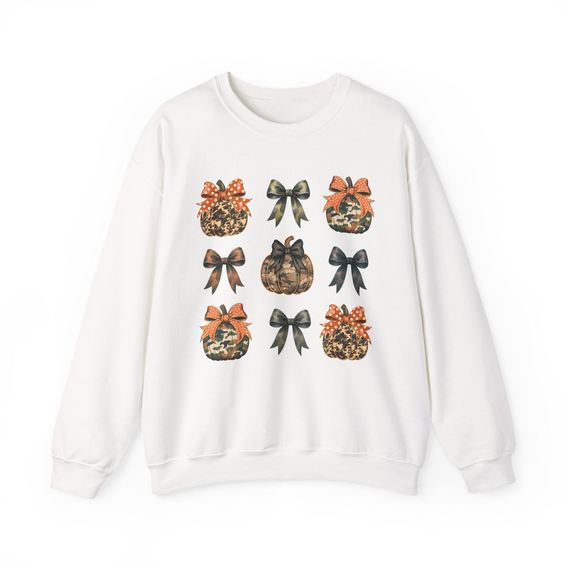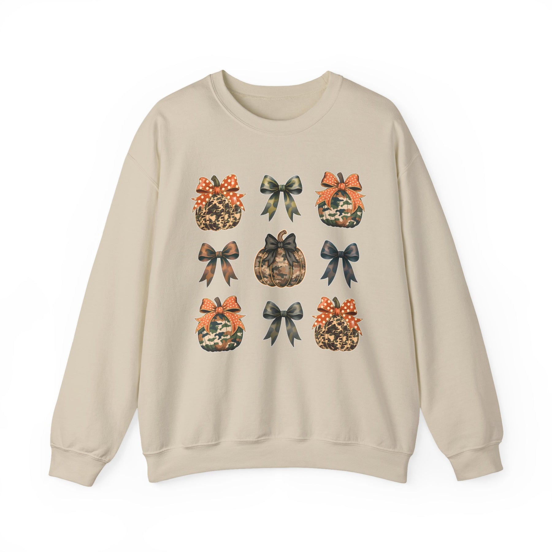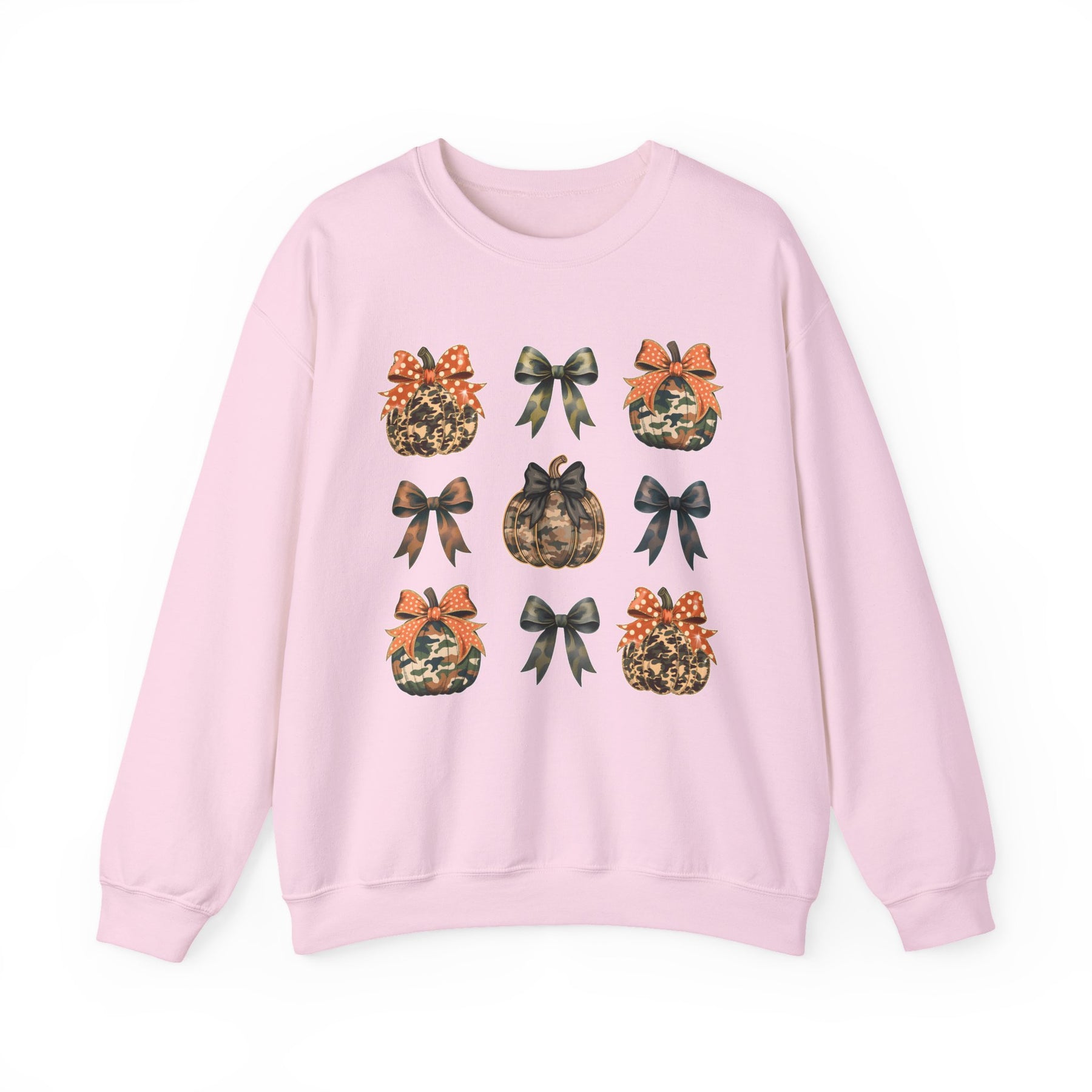 Light-pink crewneck sweatshirt featuring a 3x3 grid of camo-patterned pumpkins and bows, blending comfort and seasonal style in a unique design.