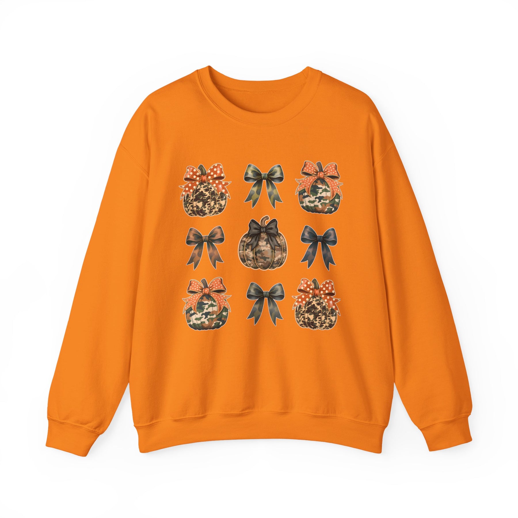 Bright-orange crewneck sweatshirt featuring a 3x3 grid of camo and animal-print pumpkins and bows, perfect for Halloween or harvest season. Comfortable, durable, and ideal for colder months.