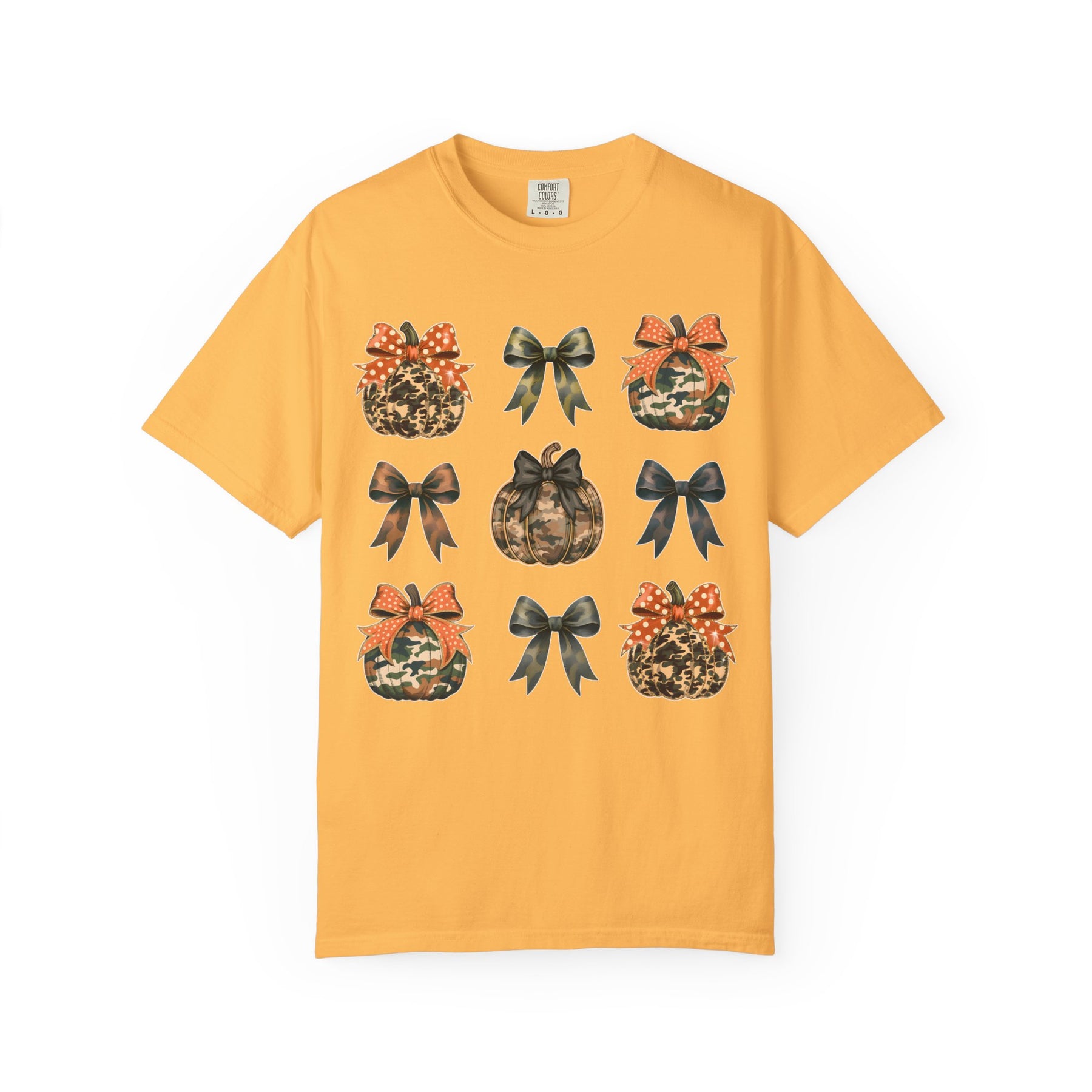 Bows and Pumpkins Tee features a 3×3 grid of camo-patterned pumpkins and bows on a mustard-yellow T-shirt, highlighting a fall-themed, unique graphic design.