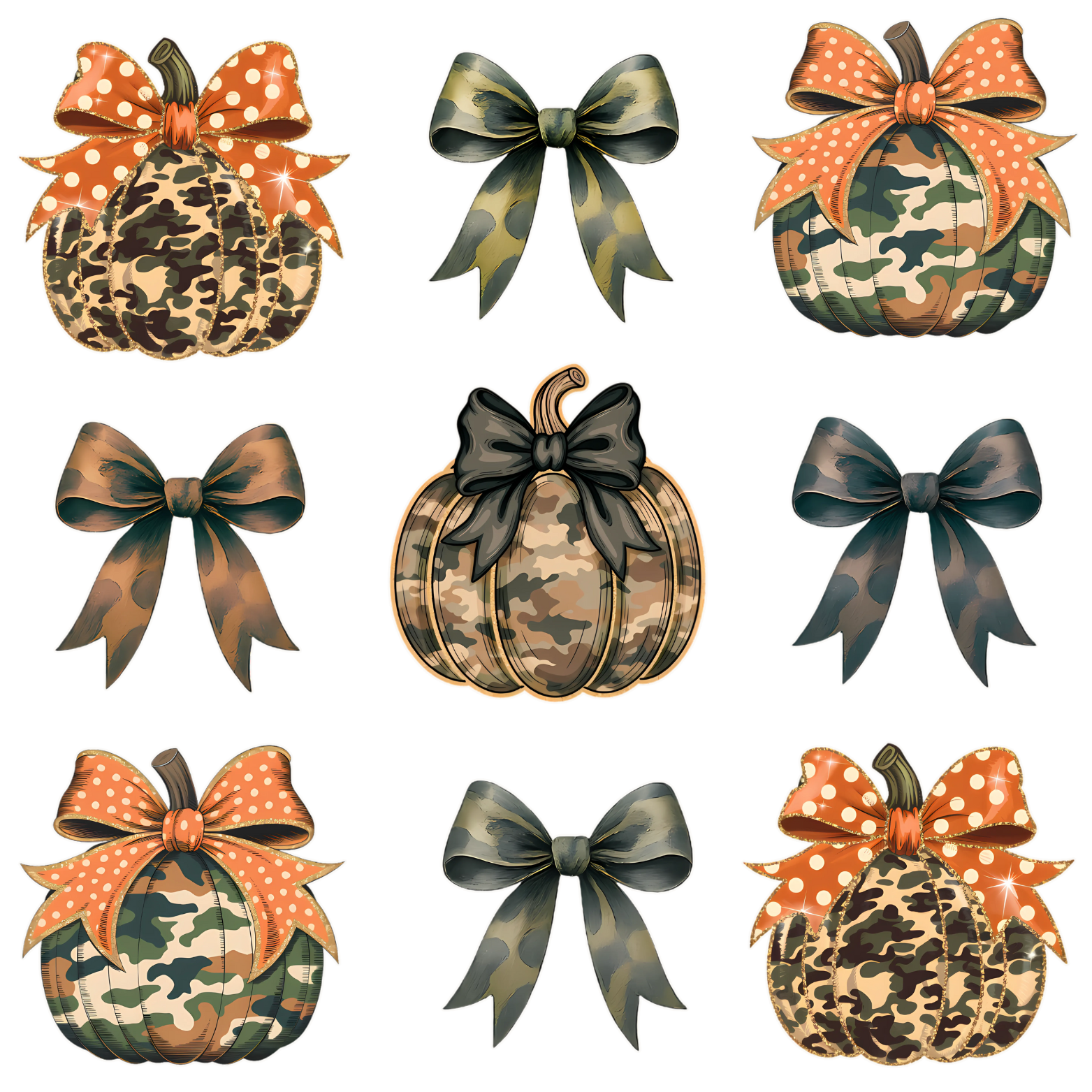 Bows and Pumpkins Tee: A 3×3 collage features camo-patterned pumpkins with bows and coordinating ribbon bows, perfect for fall-themed, comfortable wear.