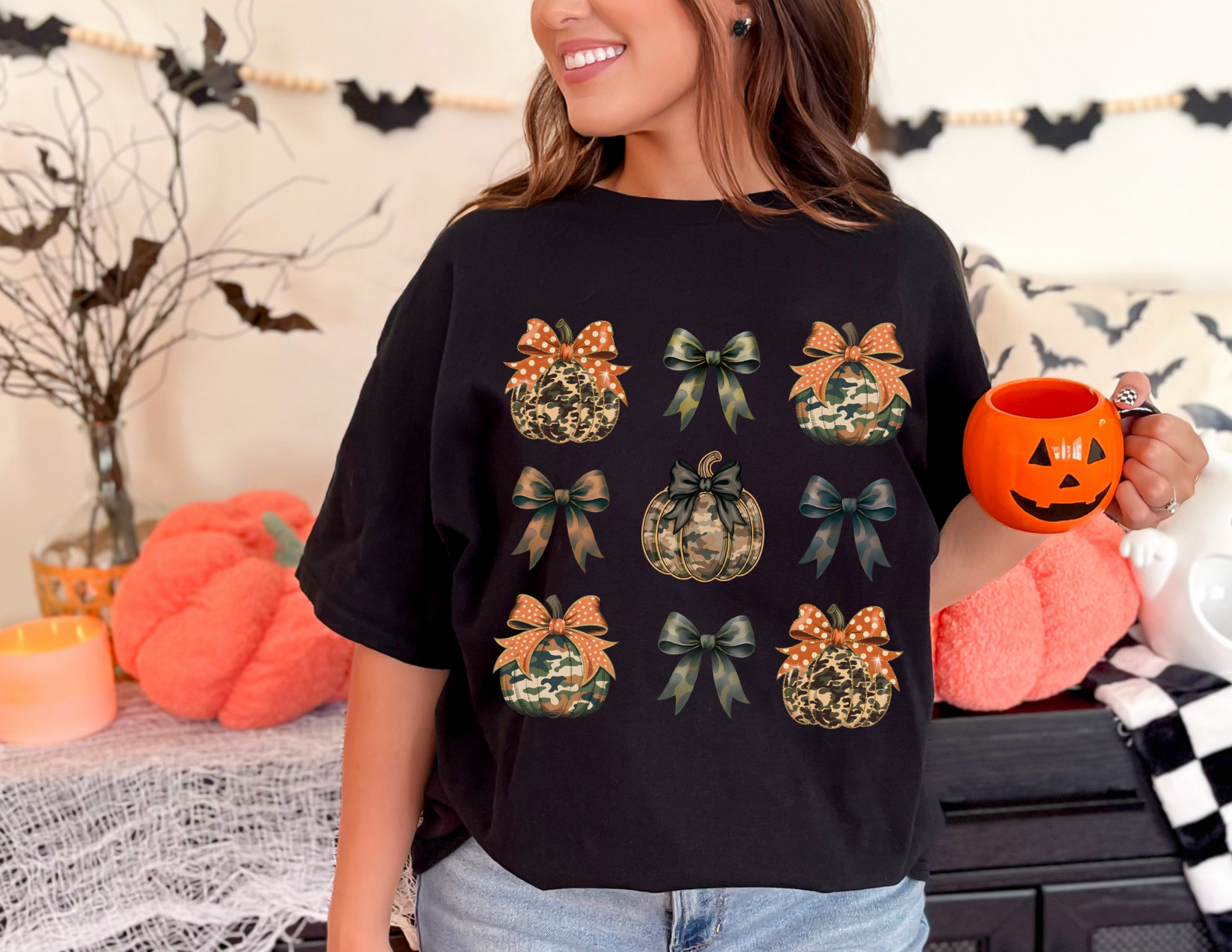 Bows and Pumpkins Tee: Black crew-neck featuring camo-patterned pumpkins and ribbon bows in a 3x3 grid, blending autumn themes with military-style camouflage.