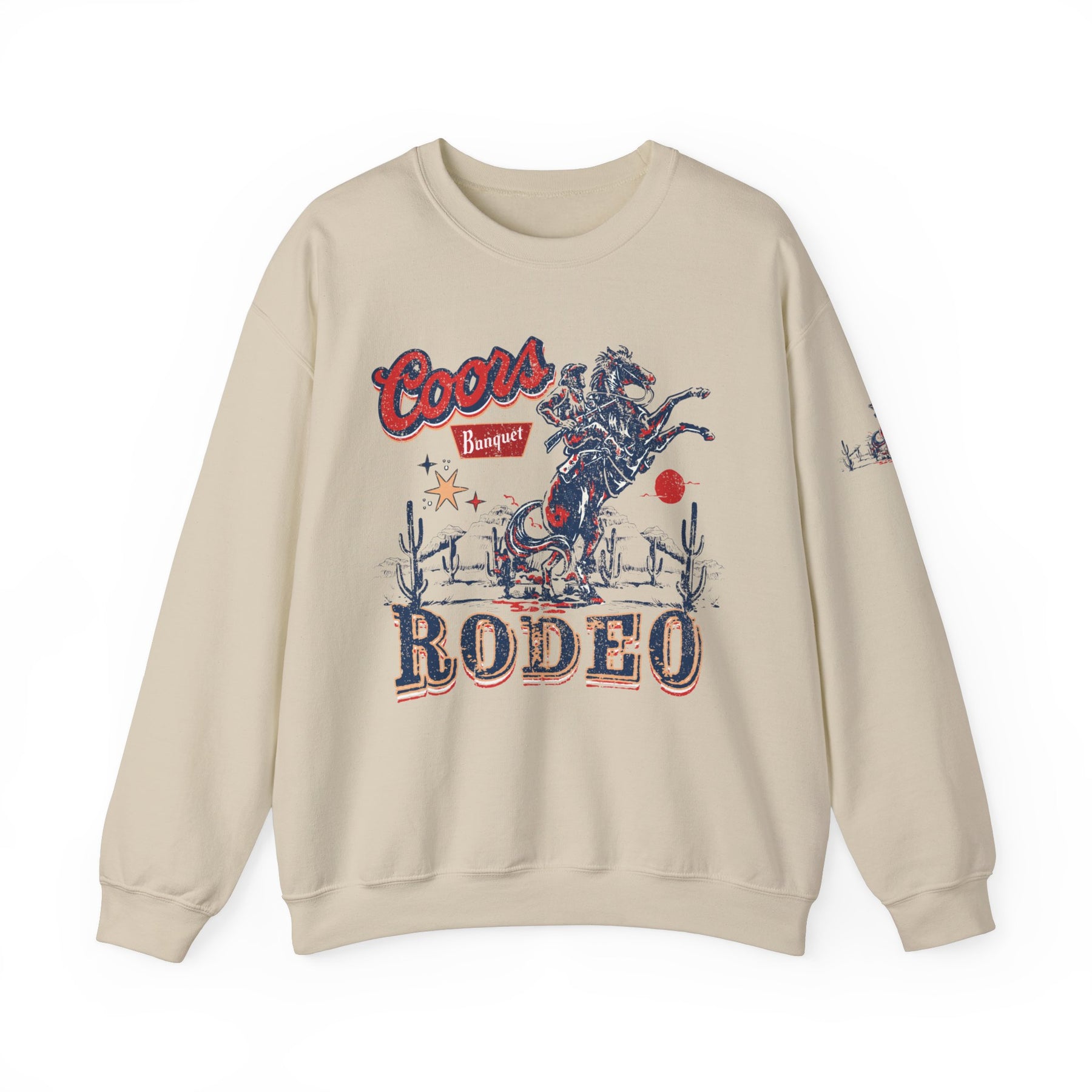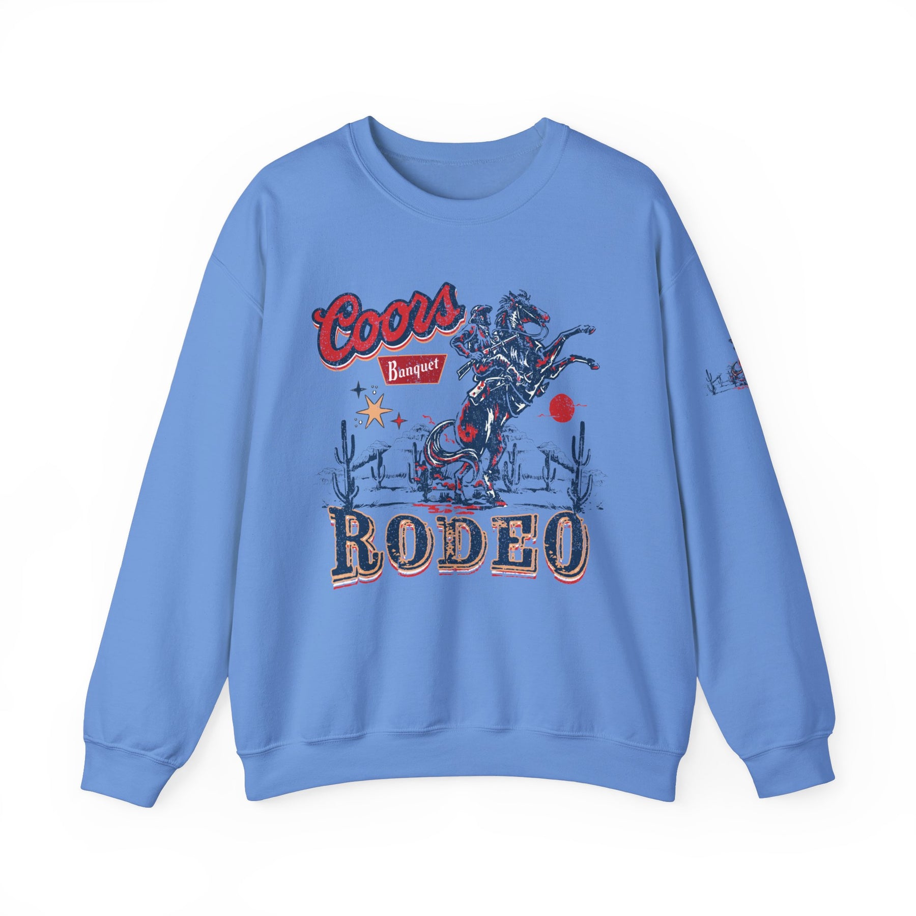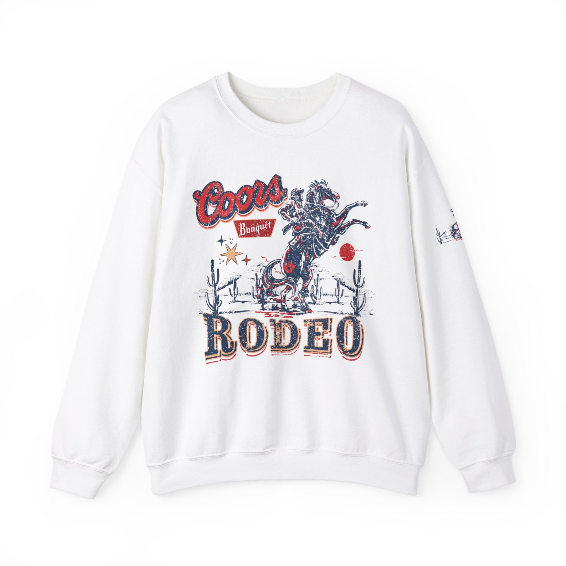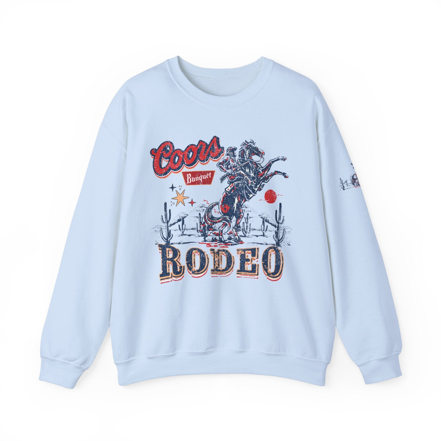 A unisex heavy blend crewneck sweatshirt featuring the Coors Rodeo Crew design. Made of 50% cotton and 50% polyester, with ribbed knit collar and no itchy side seams. Medium-heavy fabric, loose fit, and true to size.