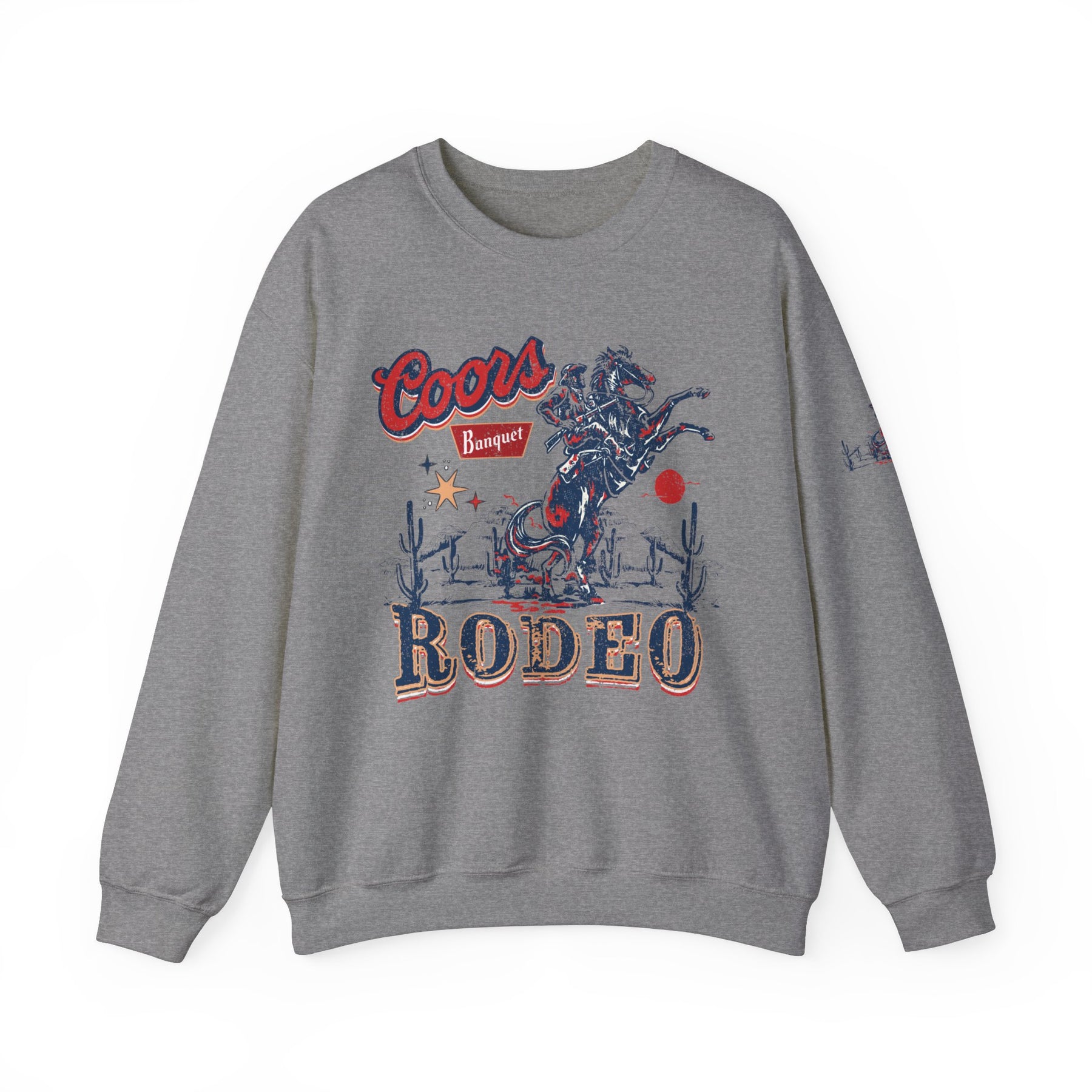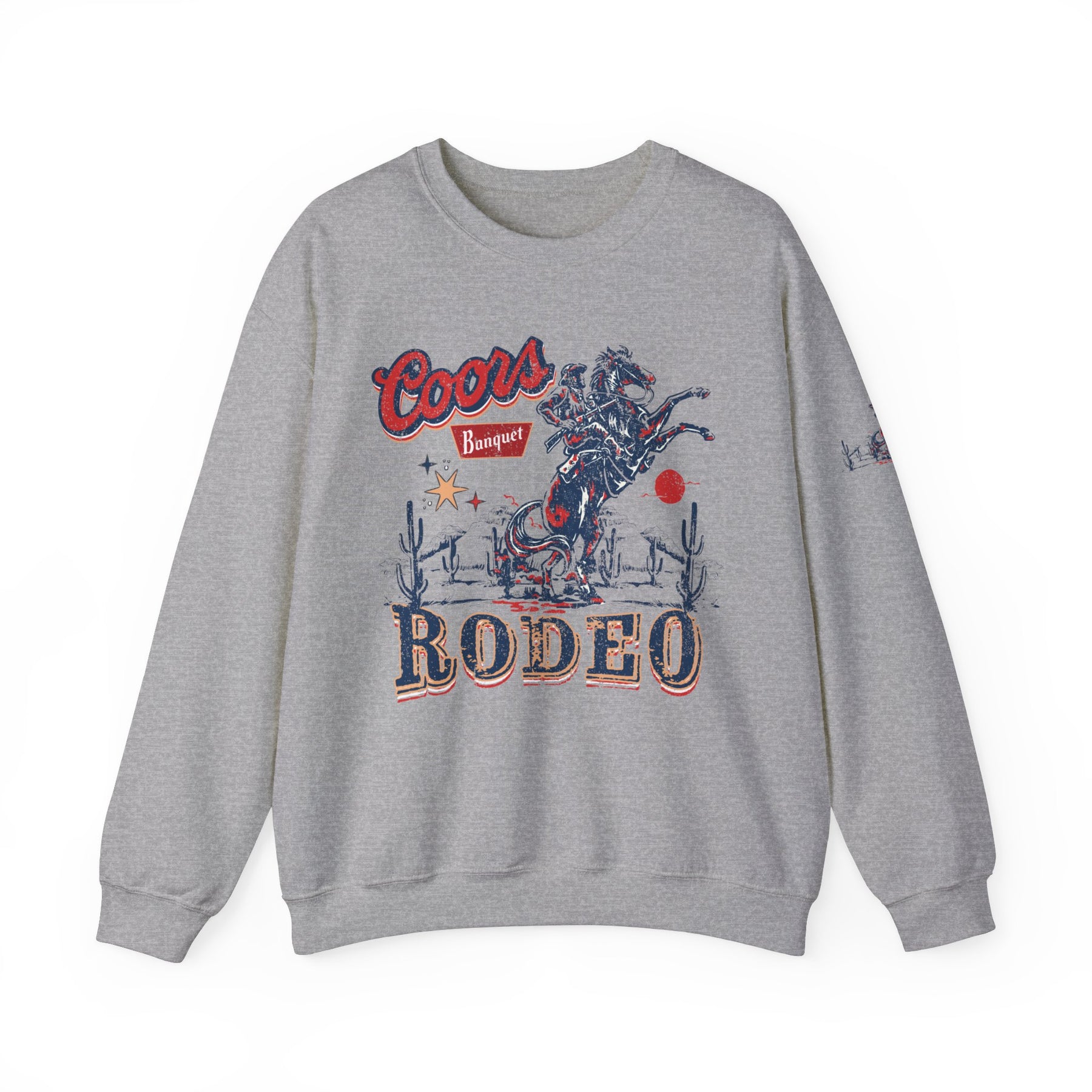 A grey Coors Rodeo Crew sweatshirt with a graphic design, ideal for any situation. Unisex heavy blend crewneck made of 50% cotton and 50% polyester, featuring ribbed knit collar and no itchy side seams.