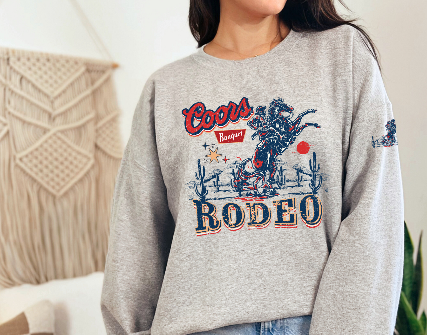 A grey Coors Rodeo Crew sweatshirt with a cowboy graphic, ribbed knit collar, and no itchy side seams. Unisex heavy blend for comfort, 50% Cotton 50% Polyester, loose fit, medium-heavy fabric.