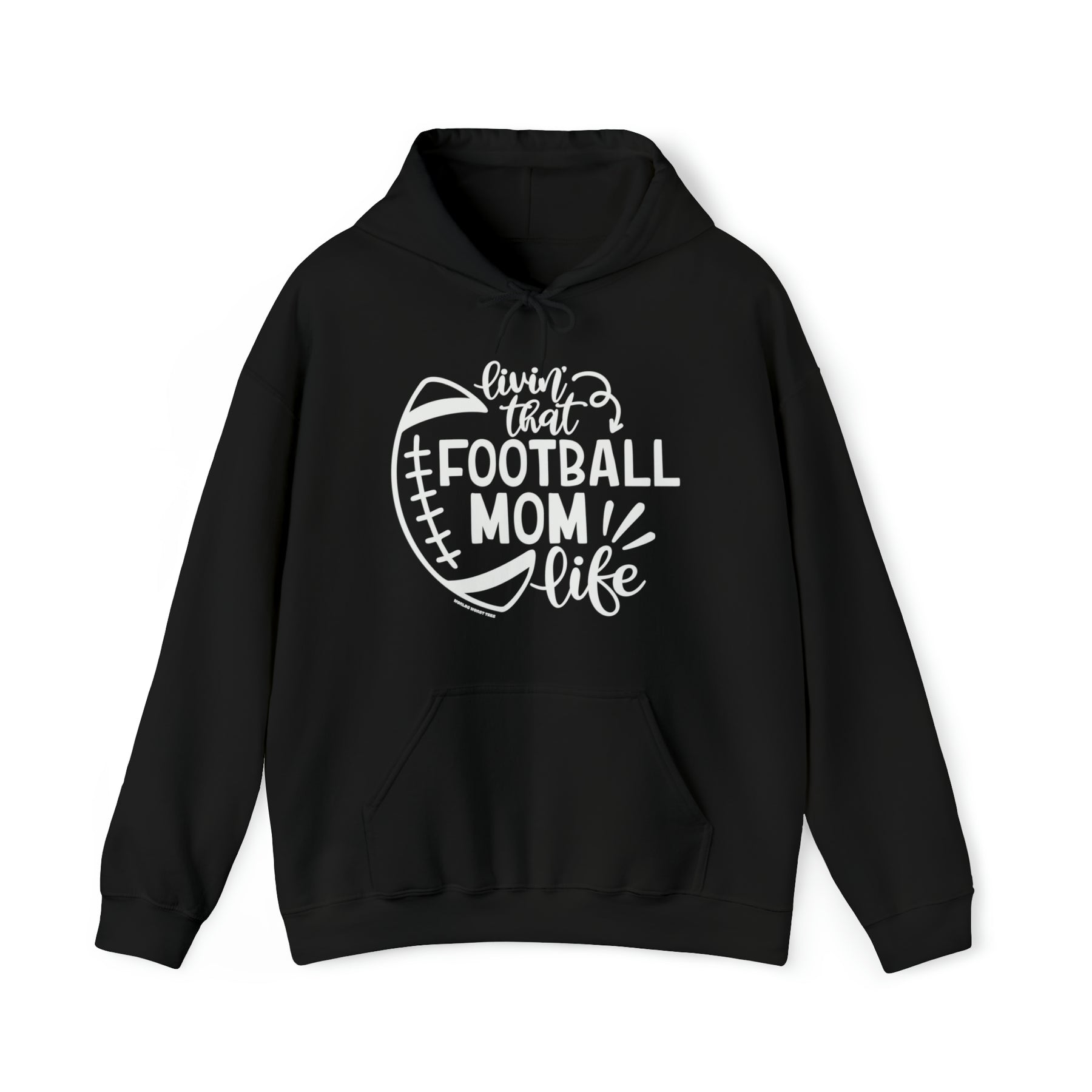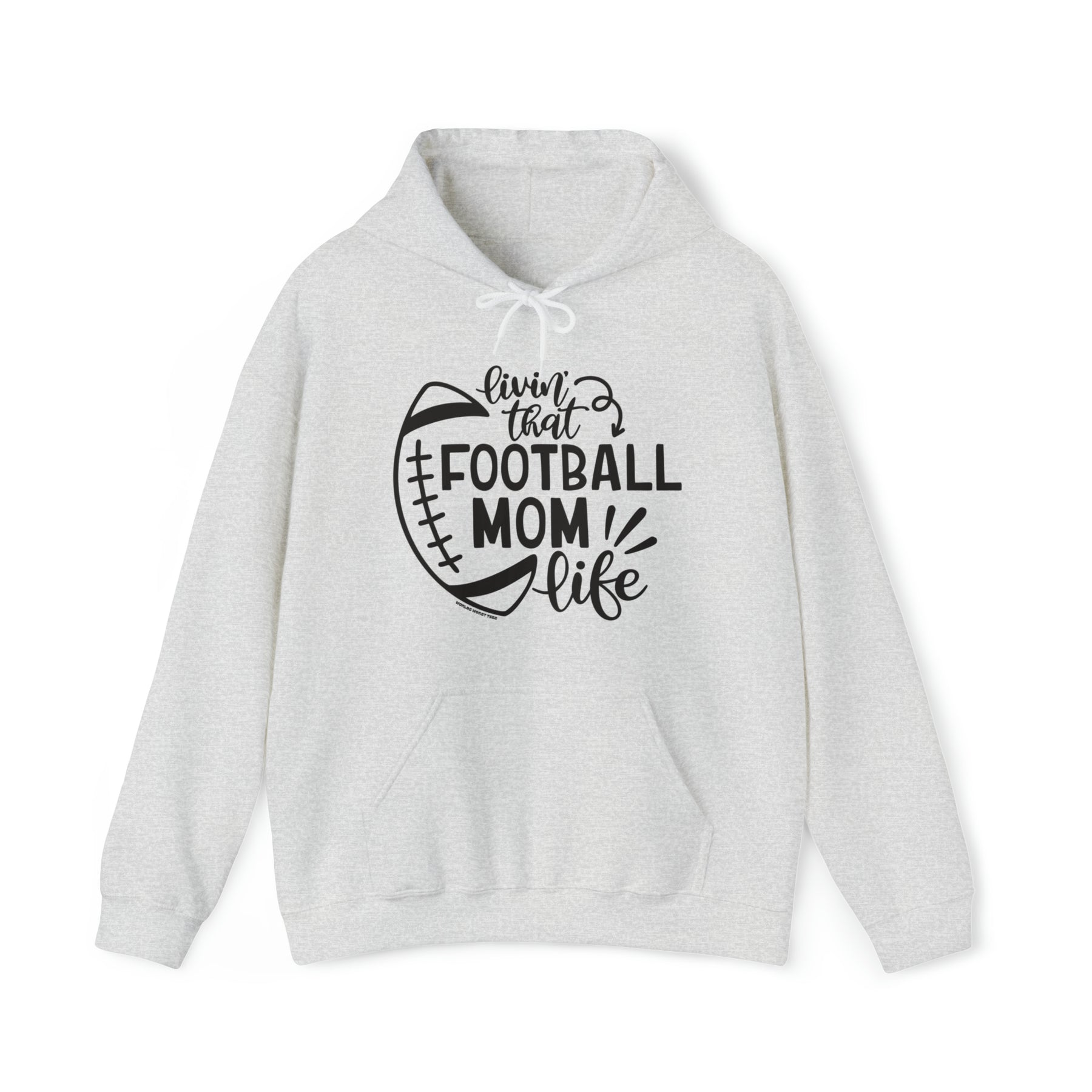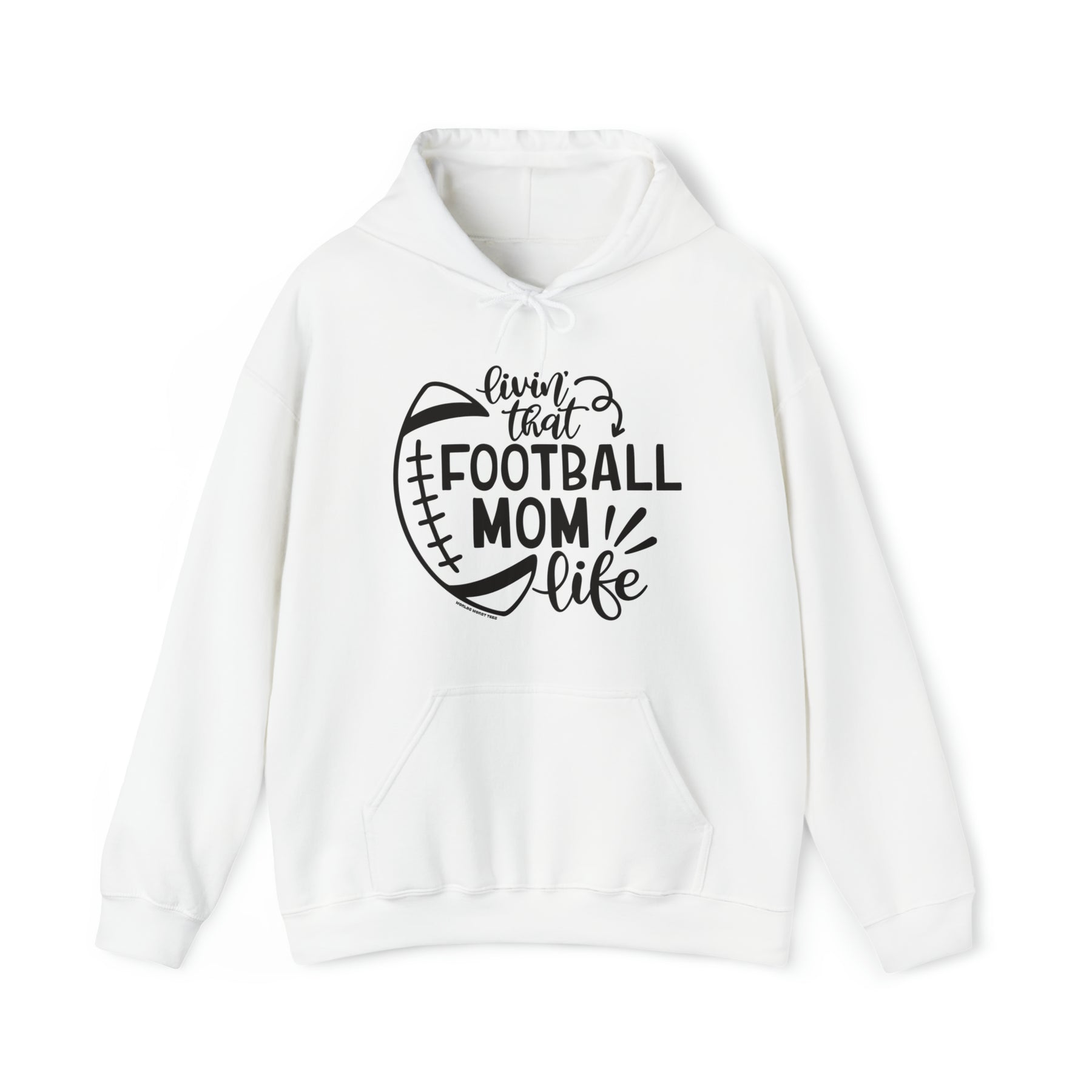 Unisex Football Mom Life Hoodie, white with black text. Heavy cotton tee, no side seams, durable tape on shoulders, ribbed knit collar. 100% Cotton, classic fit, medium weight fabric.