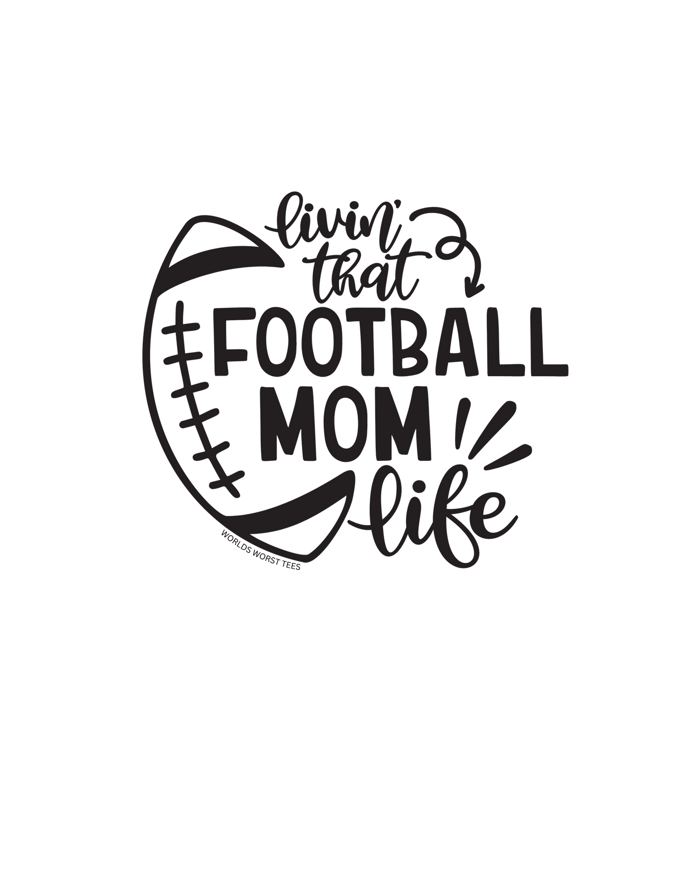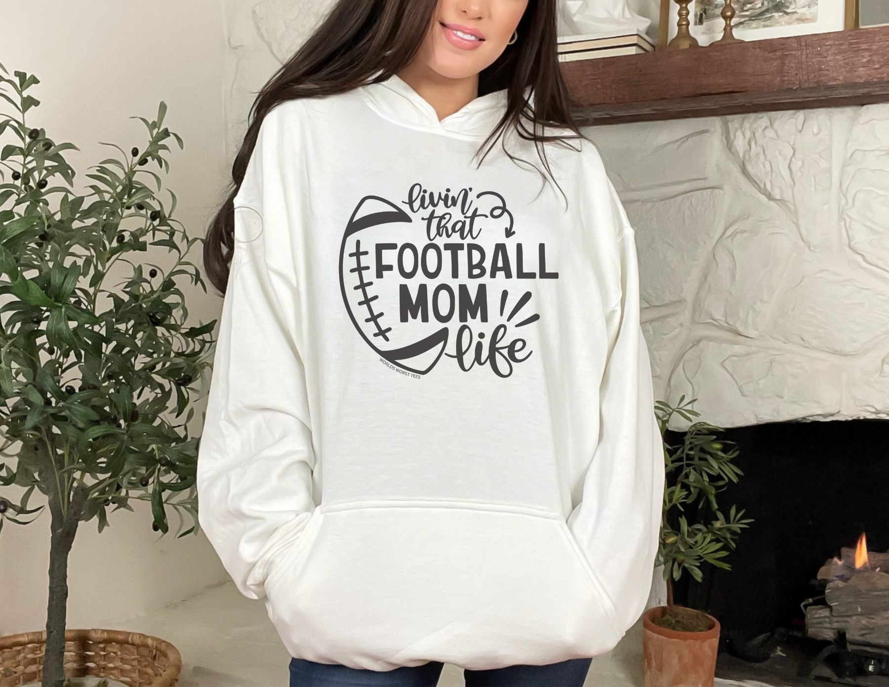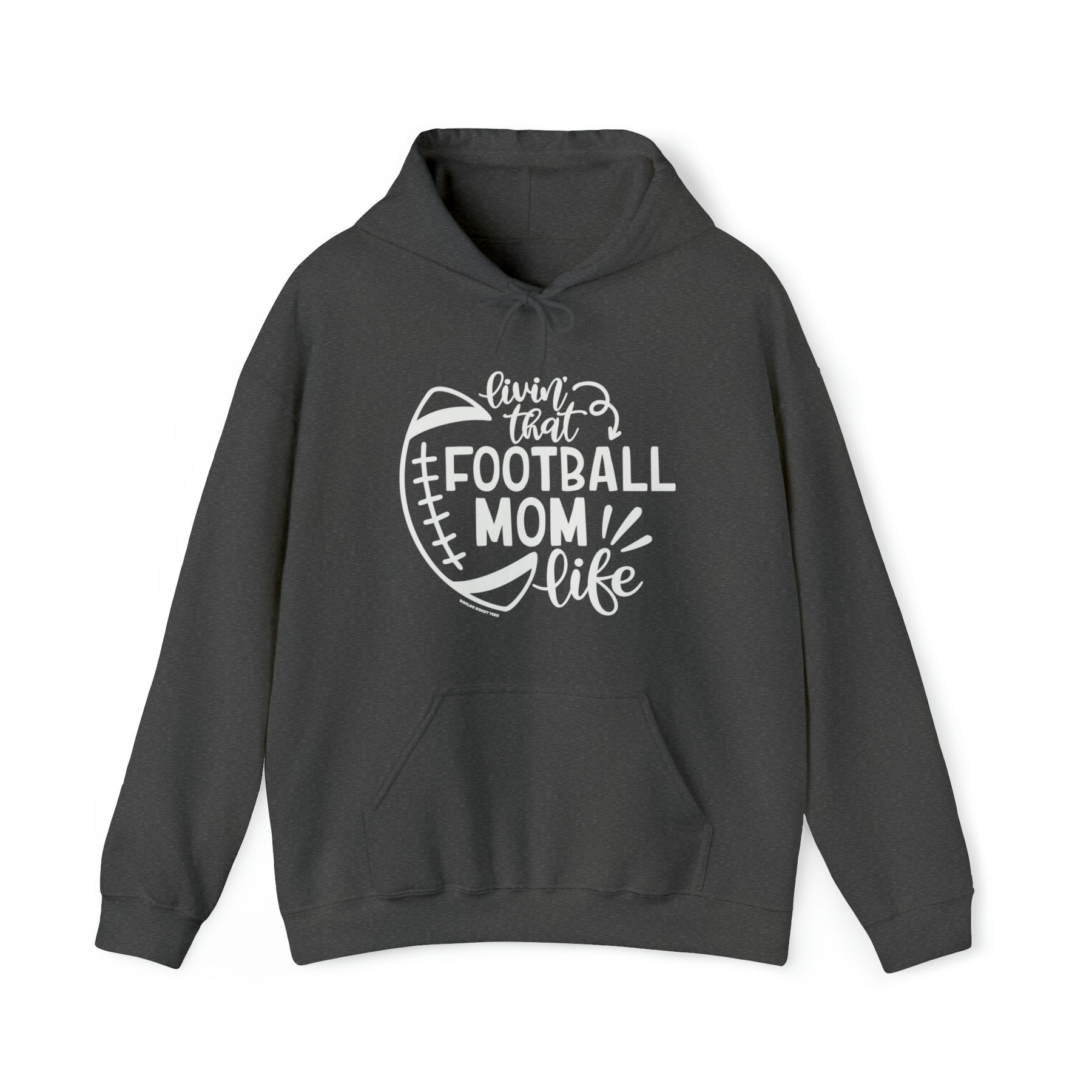 Unisex Football Mom Life Hoodie, white with black text. Heavy cotton tee, no side seams, durable tape on shoulders, ribbed knit collar. 100% Cotton, classic fit, medium weight fabric.