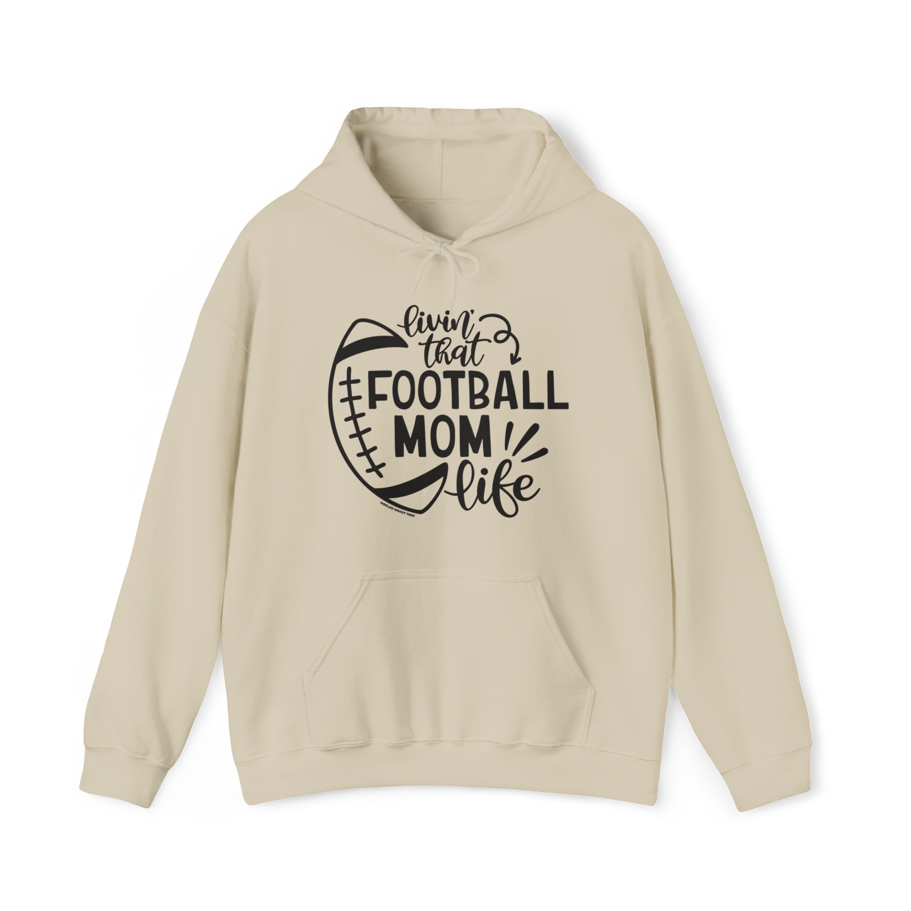 Unisex Football Mom Life Hoodie: Beige with black text. Heavy cotton tee, no side seams, durable tape on shoulders, ribbed knit collar. Classic fit, 100% cotton. Sizes S-5XL.