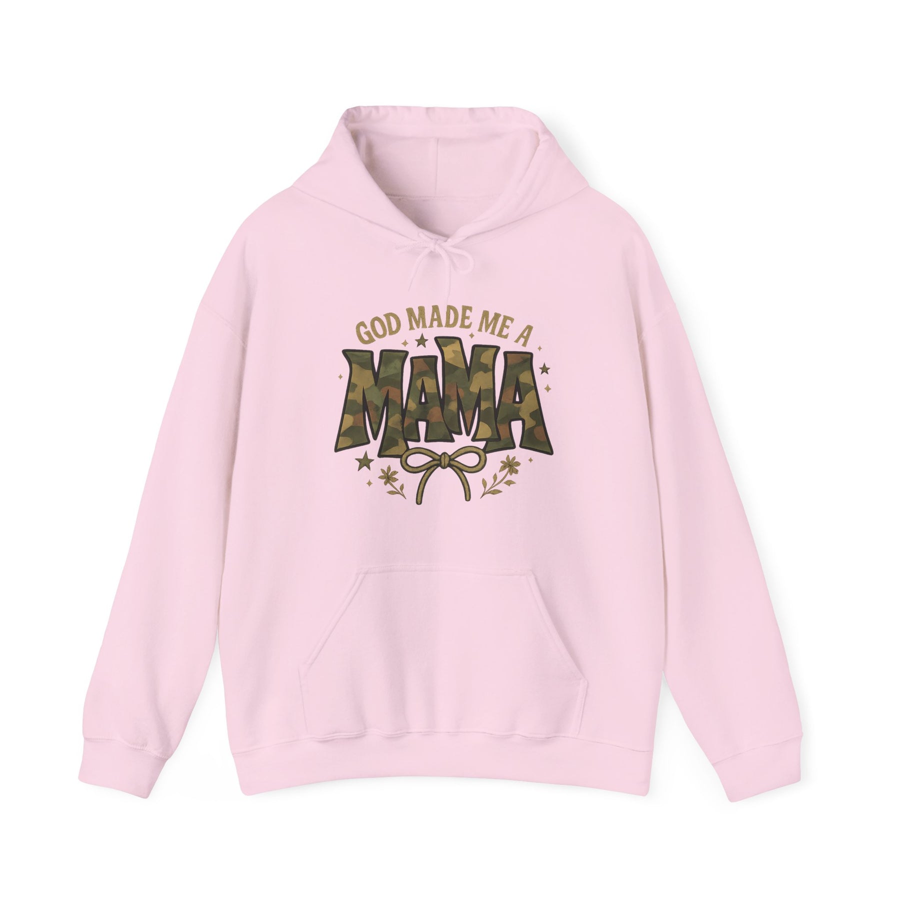 Light-pink pullover hoodie with GOD MADE ME A MAMA slogan, camouflage MAMA, decorative stars, foliage, and bow; features kangaroo pocket and drawstring hood.