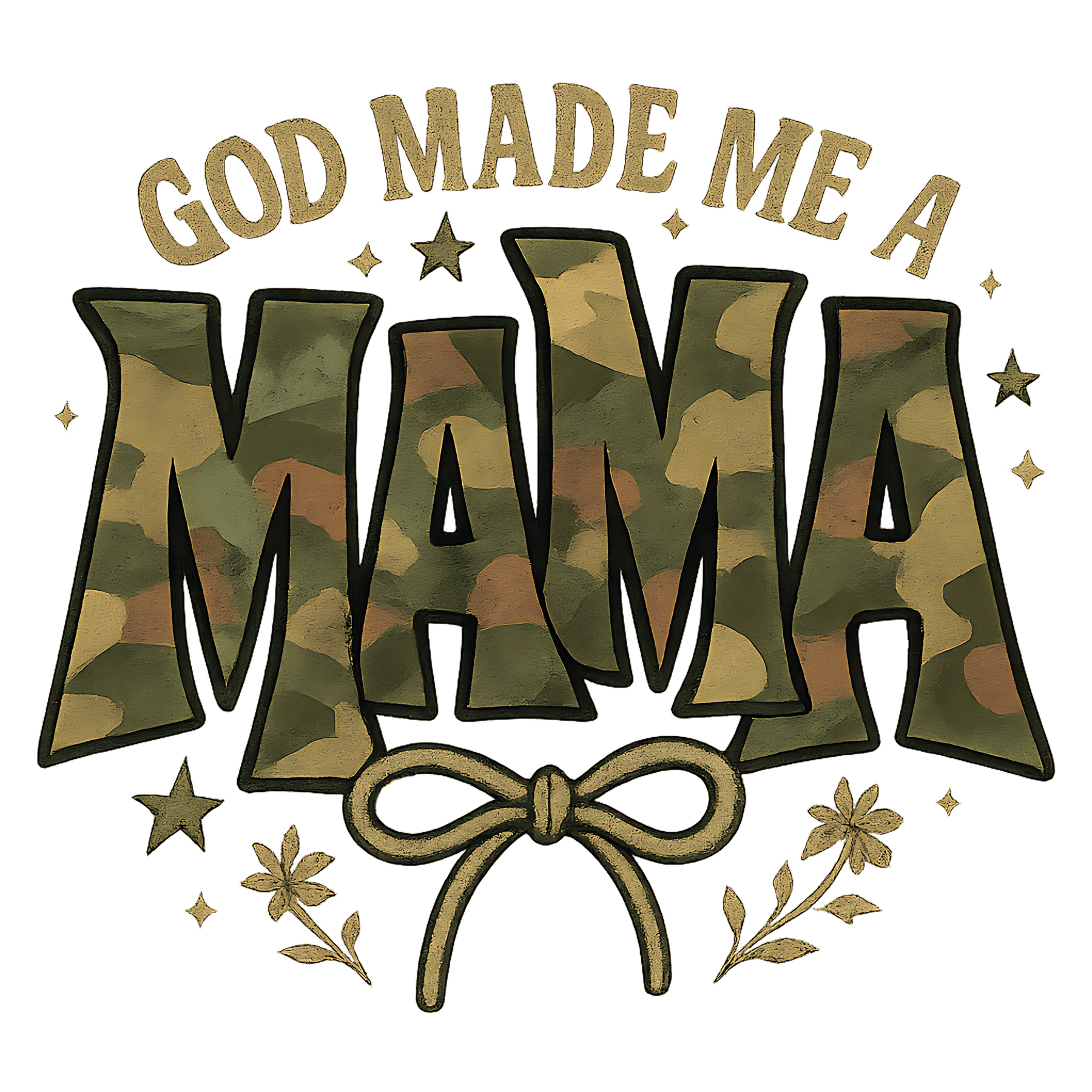God Made Me a Mama Hoodie with camouflage MAMA, stars, floral sprigs, and bow graphic. Features a kangaroo pocket, color-matched drawstring, and double-lined hood.