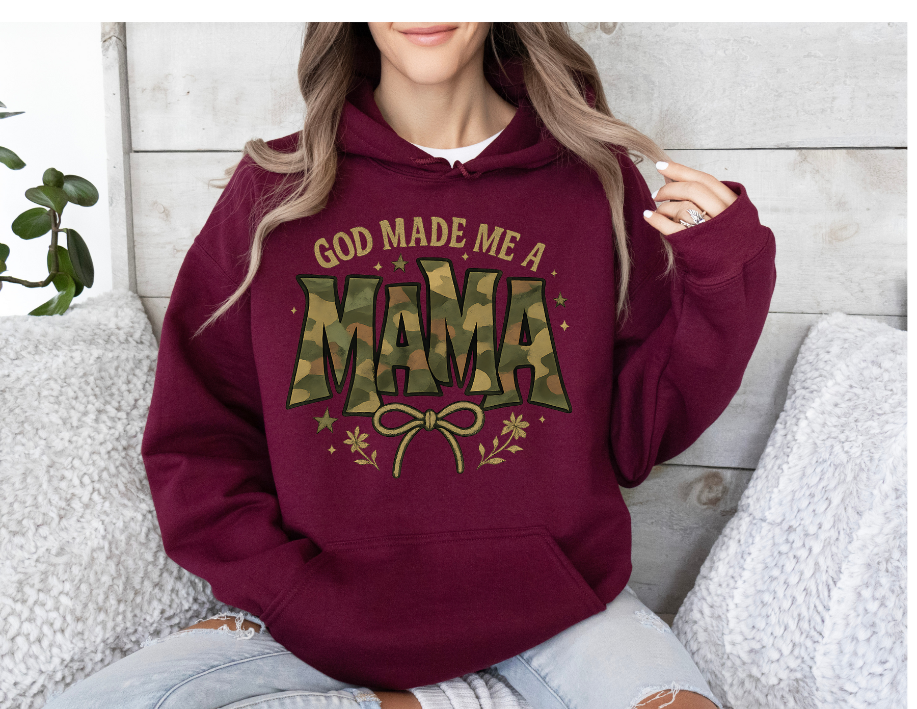 Person wearing God Made Me a Mama hoodie with camouflage MAMA text, bow, stars, and floral accents, paired with distressed jeans, sitting casually on a cozy couch.