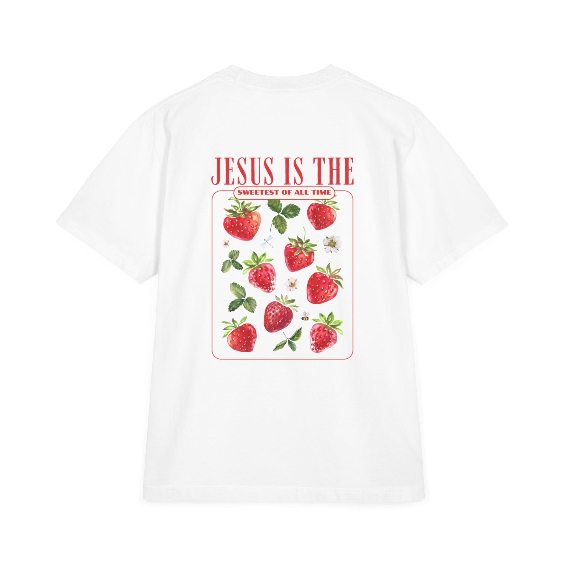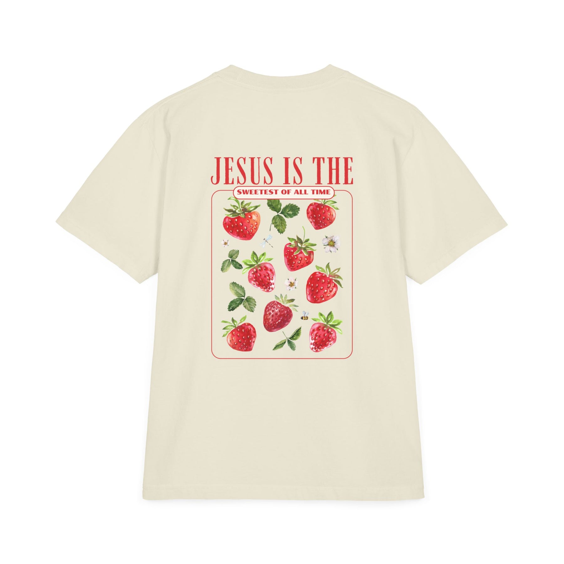 Jesus is the Sweetest Tee: Oversized drop-shoulder t-shirt with vintage-washed colors and reinforced stitching, offering a relaxed, boxy fit made from 100% USA cotton.