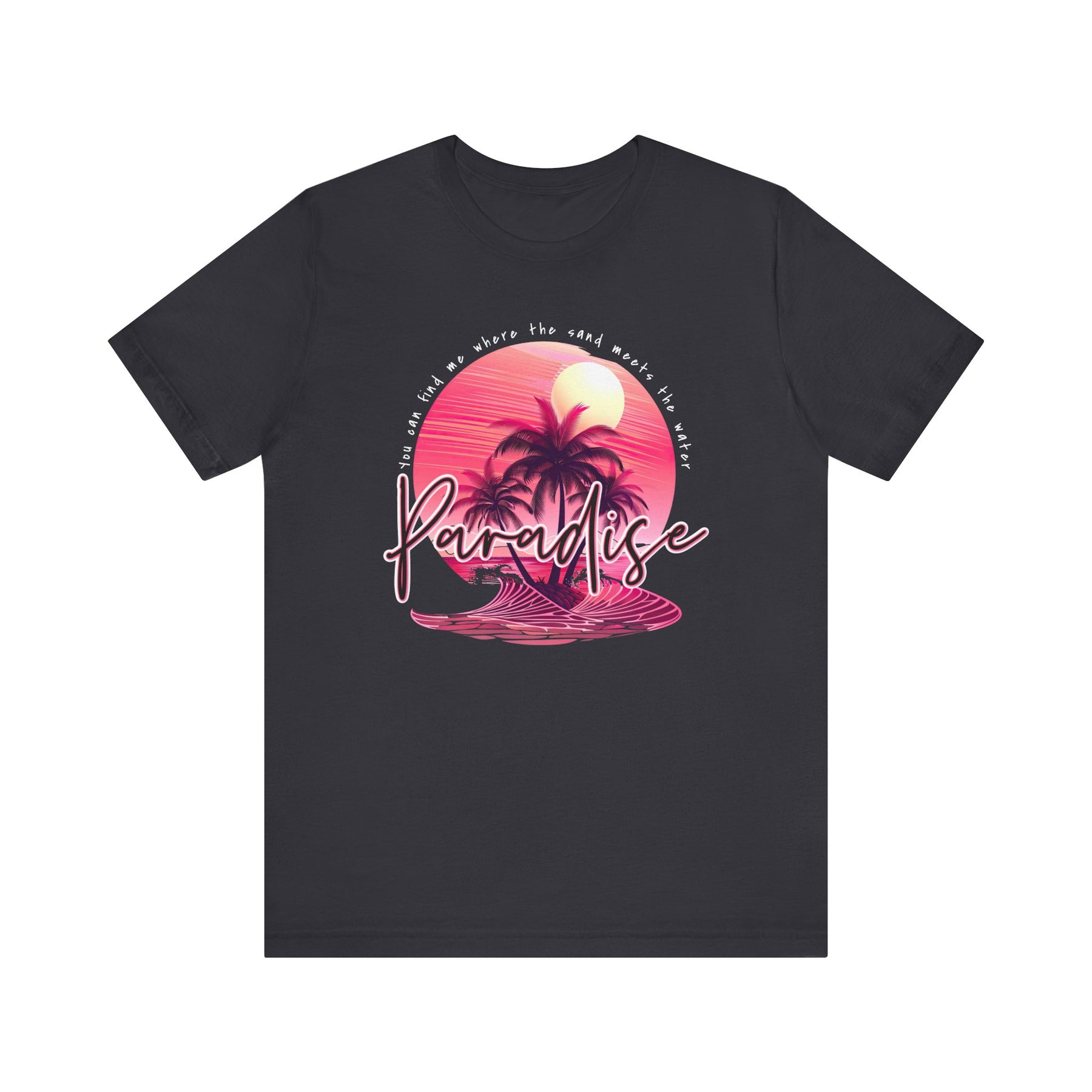 Paradise Tee: Classic unisex jersey short sleeve shirt with ribbed knit collar, tapered shoulders, and dual side seams, ideal for casual and semi-formal wear.