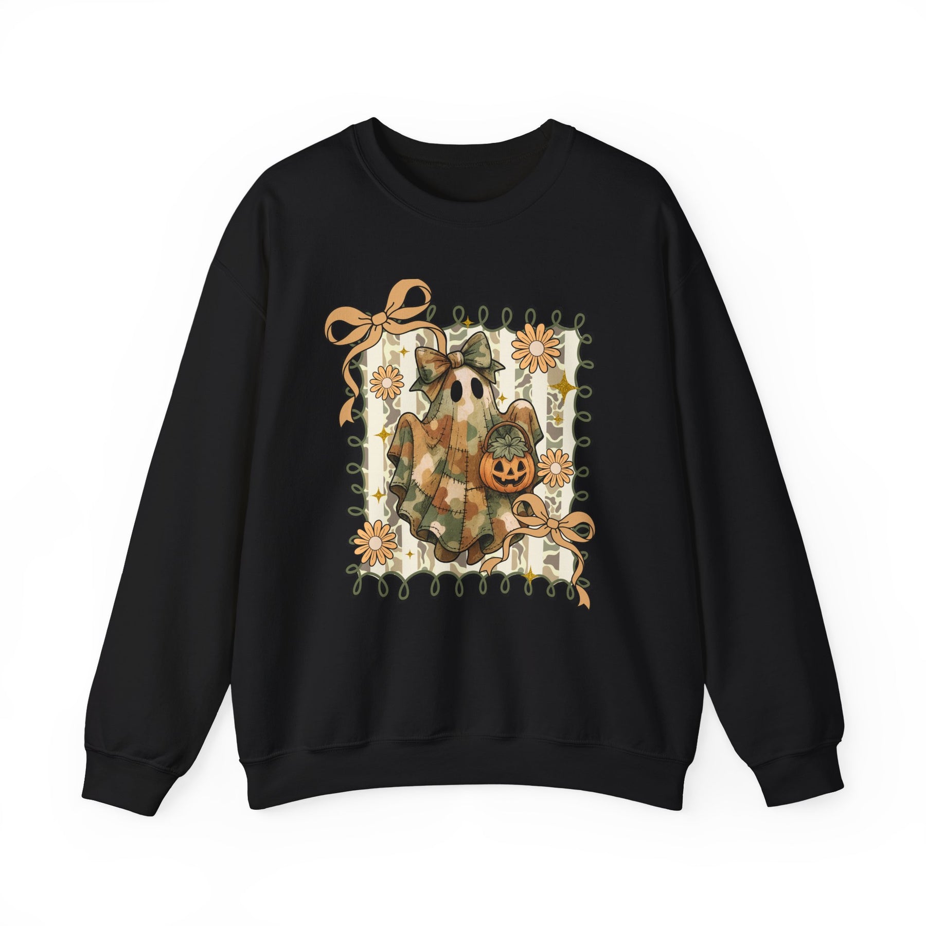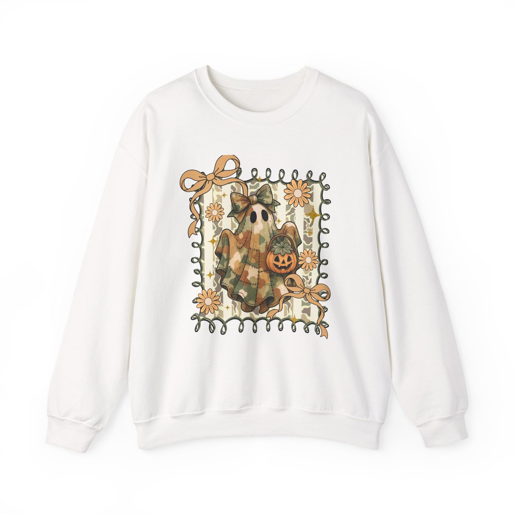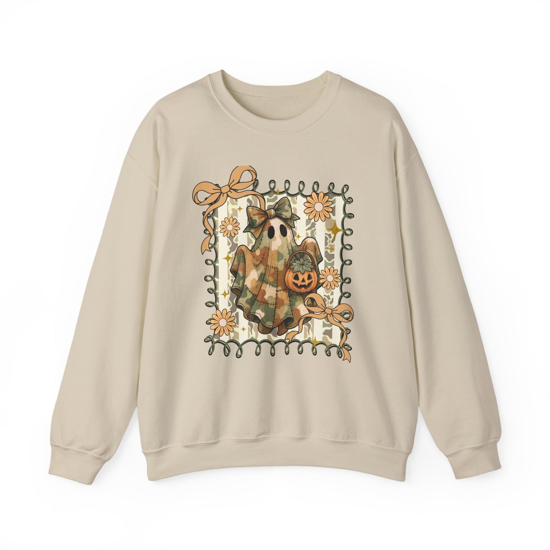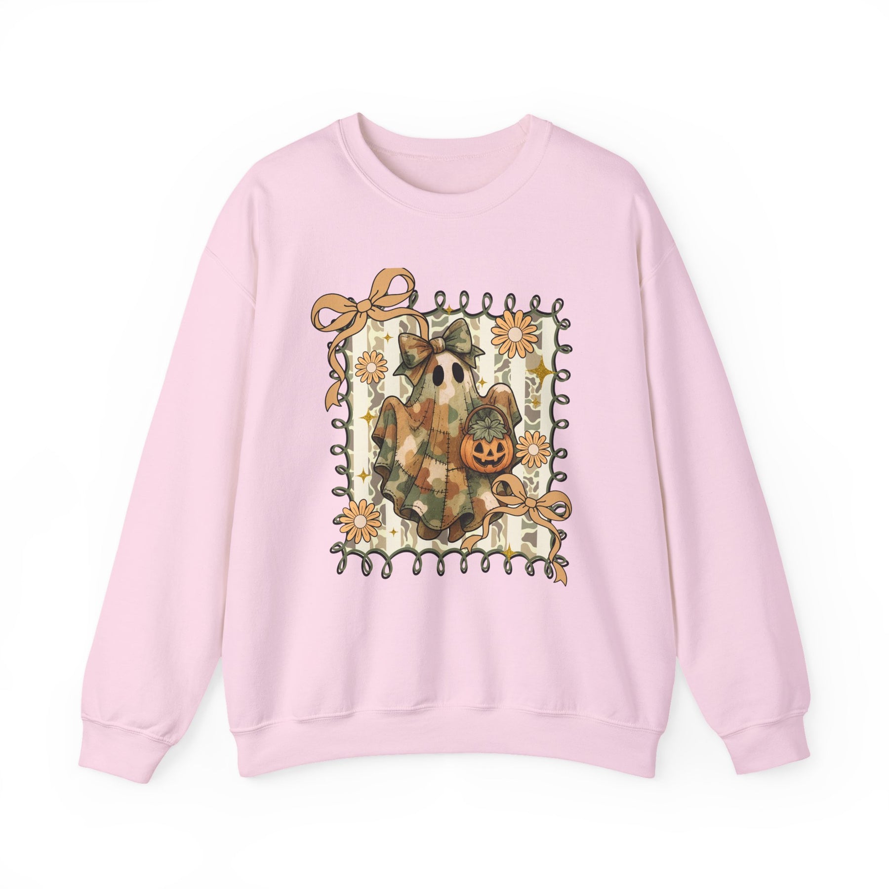 Pale-pink crewneck sweatshirt featuring a whimsical Halloween motif: a camo-toned ghost with a bow and jack-o'-lantern bucket, surrounded by playful ribbons and daisies.