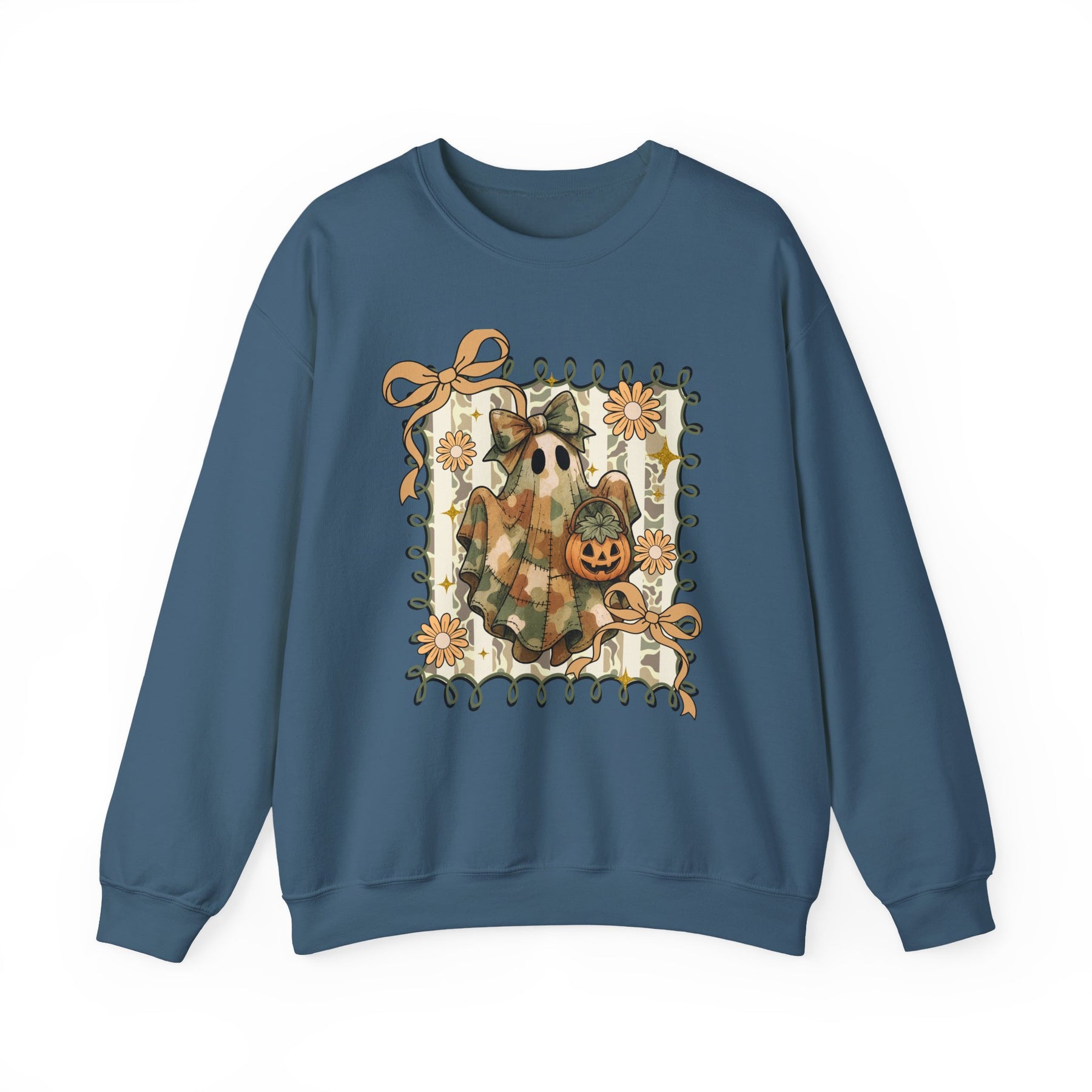 Quilted Ghost Crew sweatshirt featuring a camo-patterned ghost with a jack-o’-lantern and whimsical vine border, blending autumnal and playful spooky motifs.