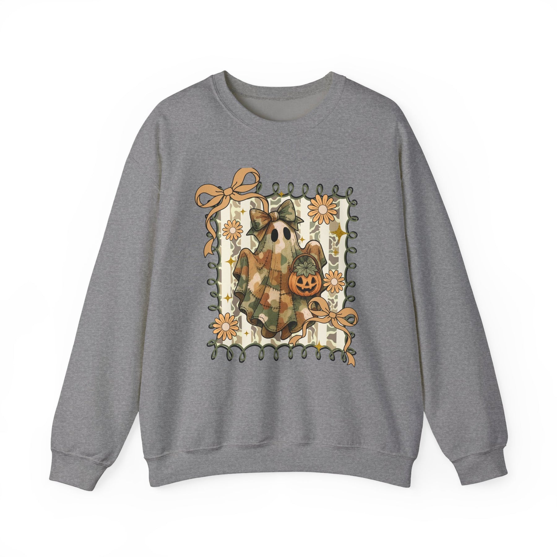 Quilted Ghost Crew: Heather-gray sweatshirt with camo ghost holding a jack-o’-lantern, surrounded by autumnal leafy border with orange bows and daisies. Cozy, durable fabric.