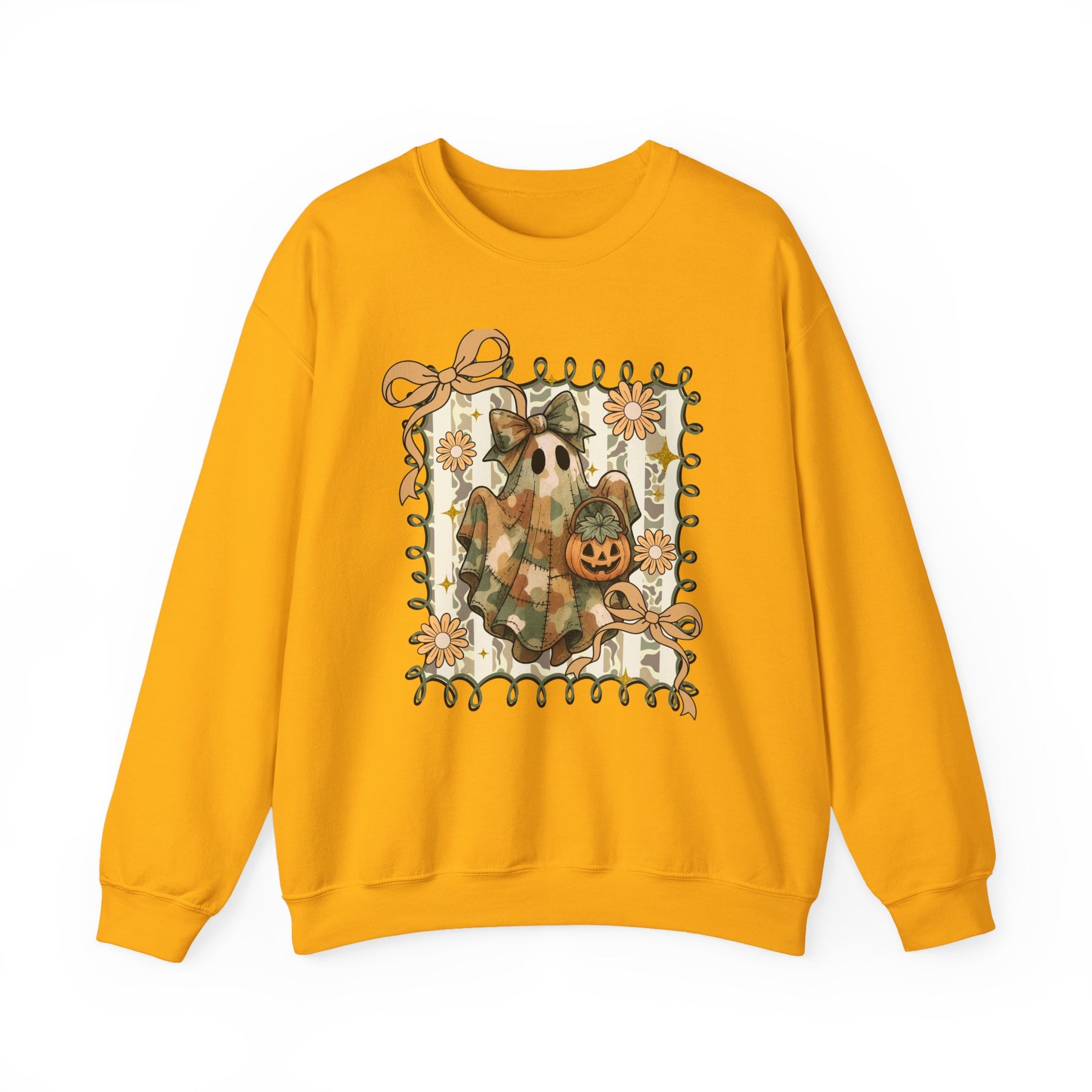 Quilted Ghost Crew: Mustard-yellow sweatshirt with whimsical ghost graphic, camo-style sheet, bow, jack-o’-lantern bucket, framed by ribbons and daisies. Cozy, durable, unisex fit.