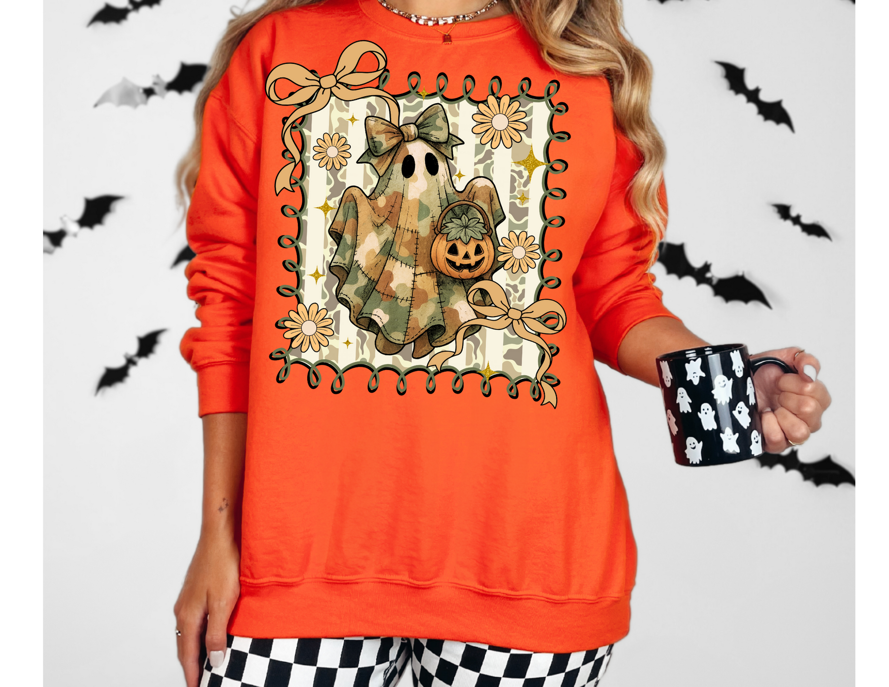Quilted Ghost Crew: Bright orange sweatshirt featuring a ghost in camouflage with a bow, holding a pumpkin bucket, framed by loops, ribbons, and daisy-like flowers.