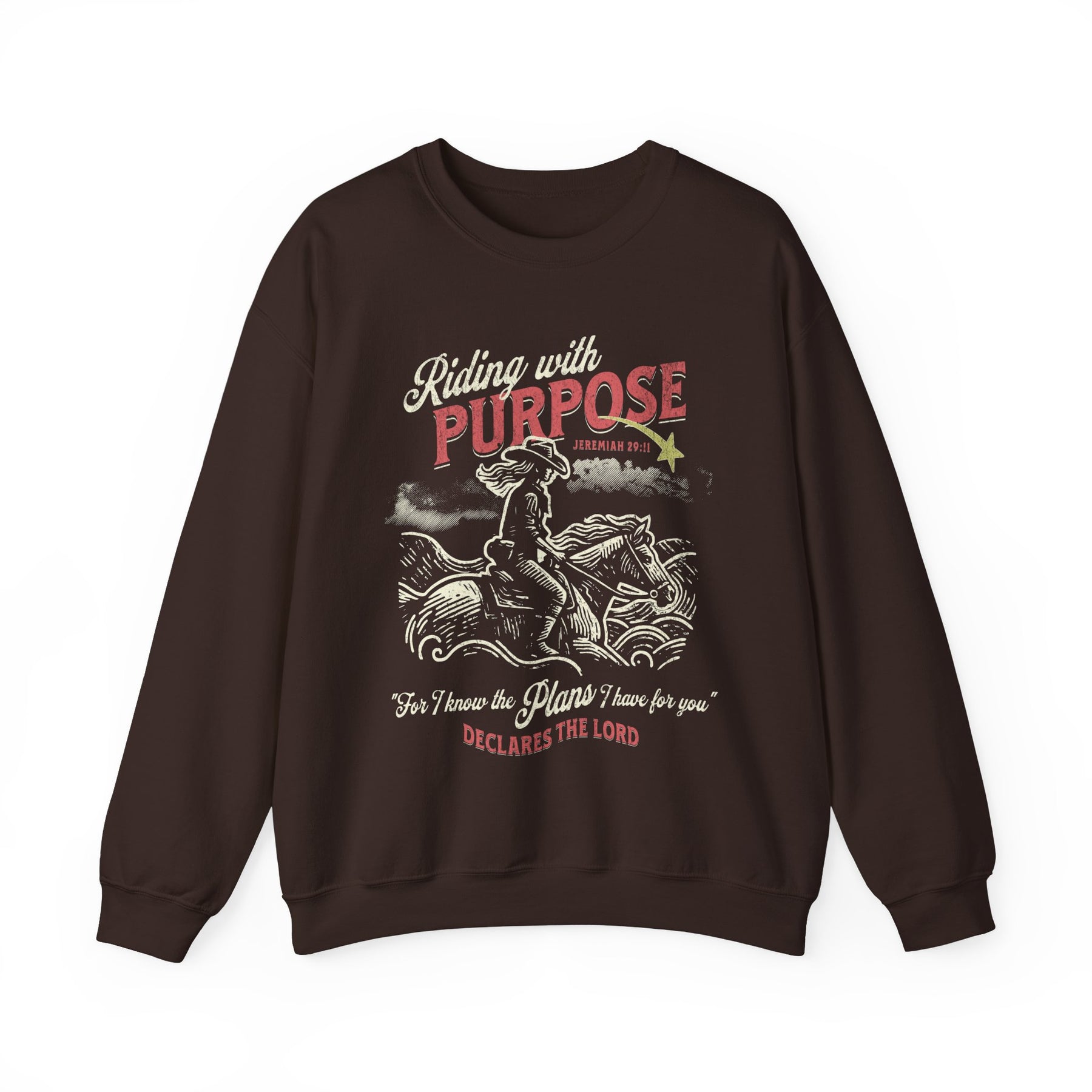 Riding for a Purpose Crew sweatshirt featuring a graphic of a cowboy on horseback, crafted from a comfortable polyester-cotton blend with a ribbed knit collar.