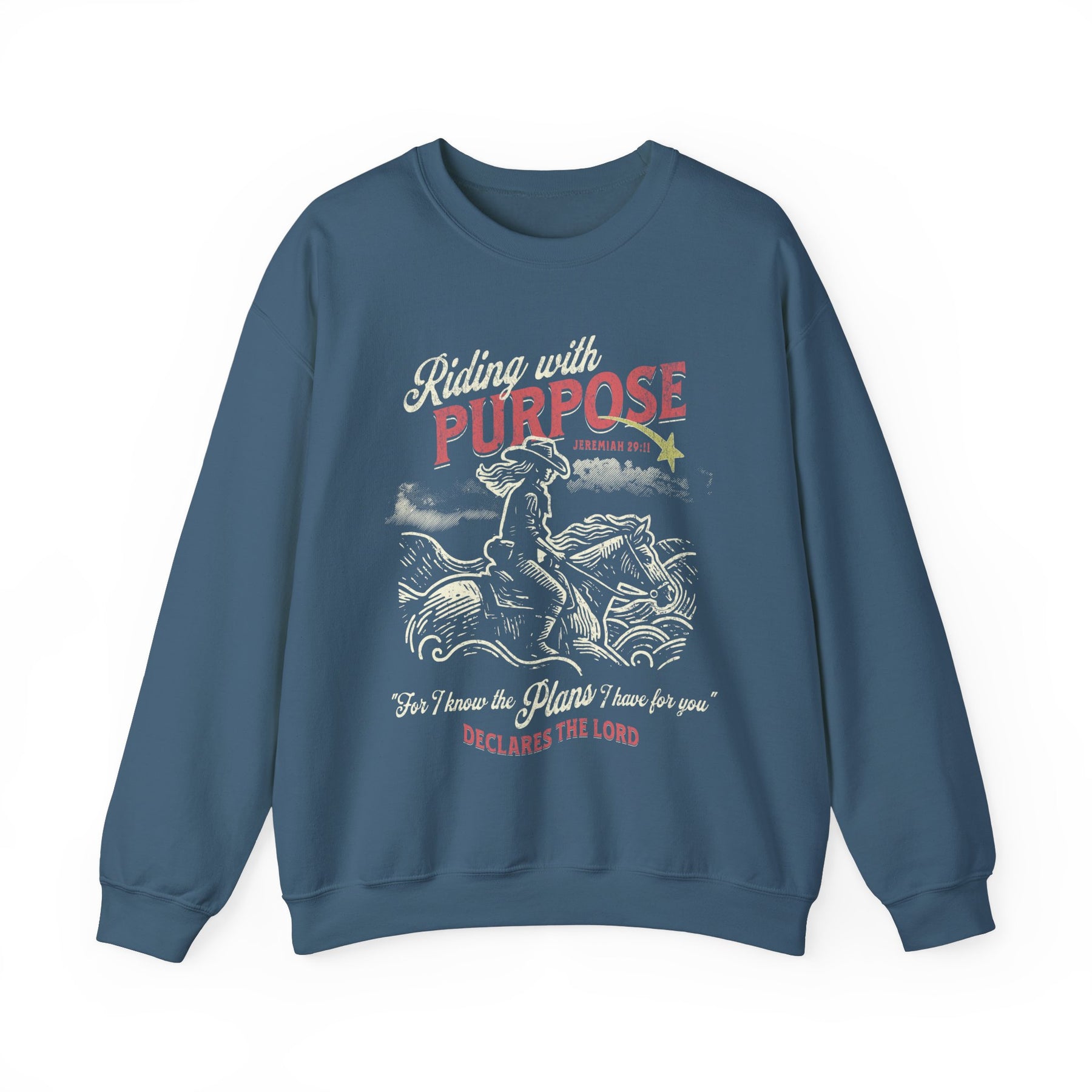 Riding for a Purpose Crew: A blue sweatshirt featuring a unique graphic of a man on horseback, blending comfort with style.